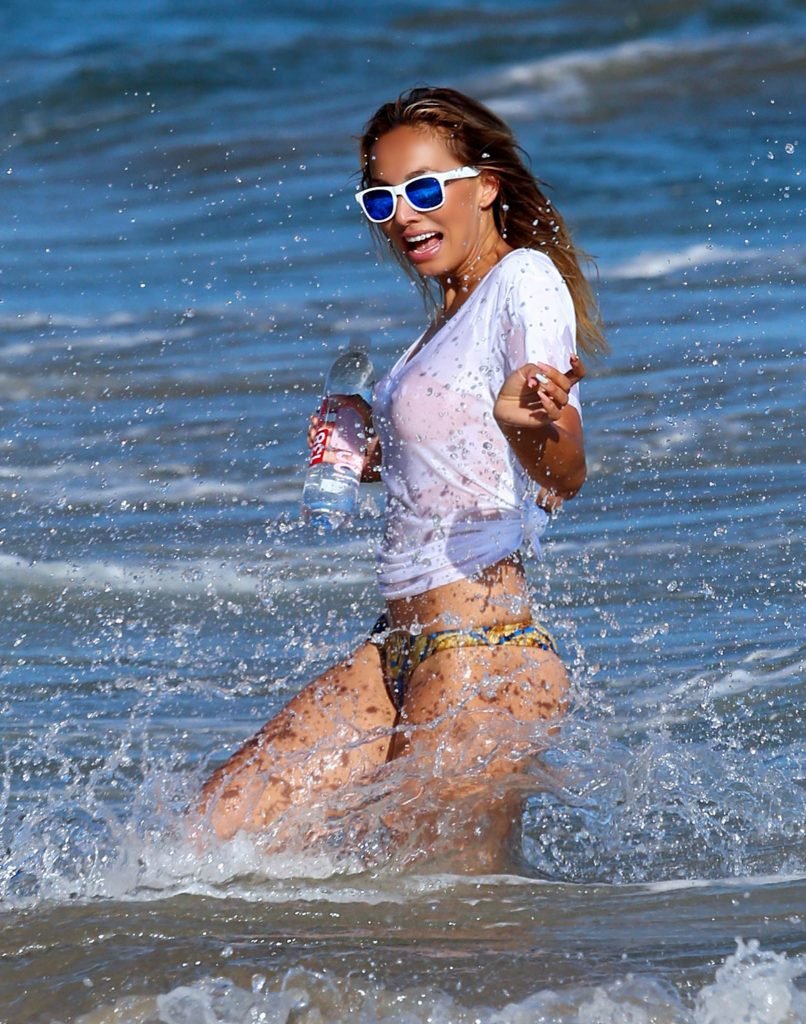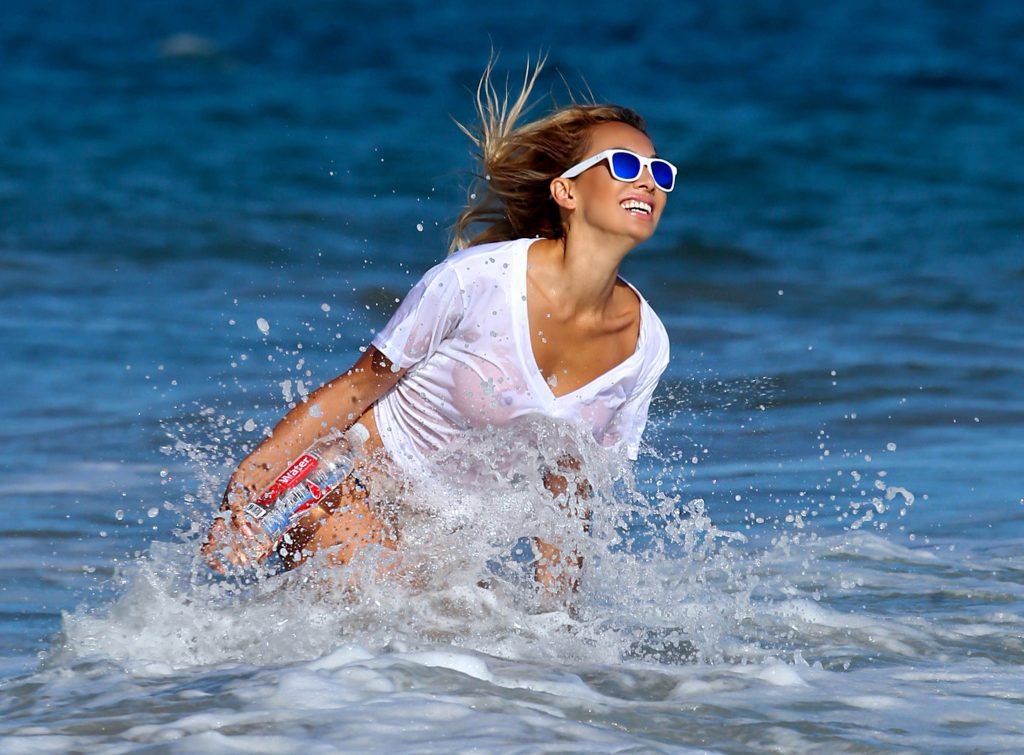 Nausicaa posa con una maglietta bianca bagnata durante un servizio fotografico sulla spiaggia per 138 Water a Malibu, 16/06/2015. Nausicaa è una modella francese.