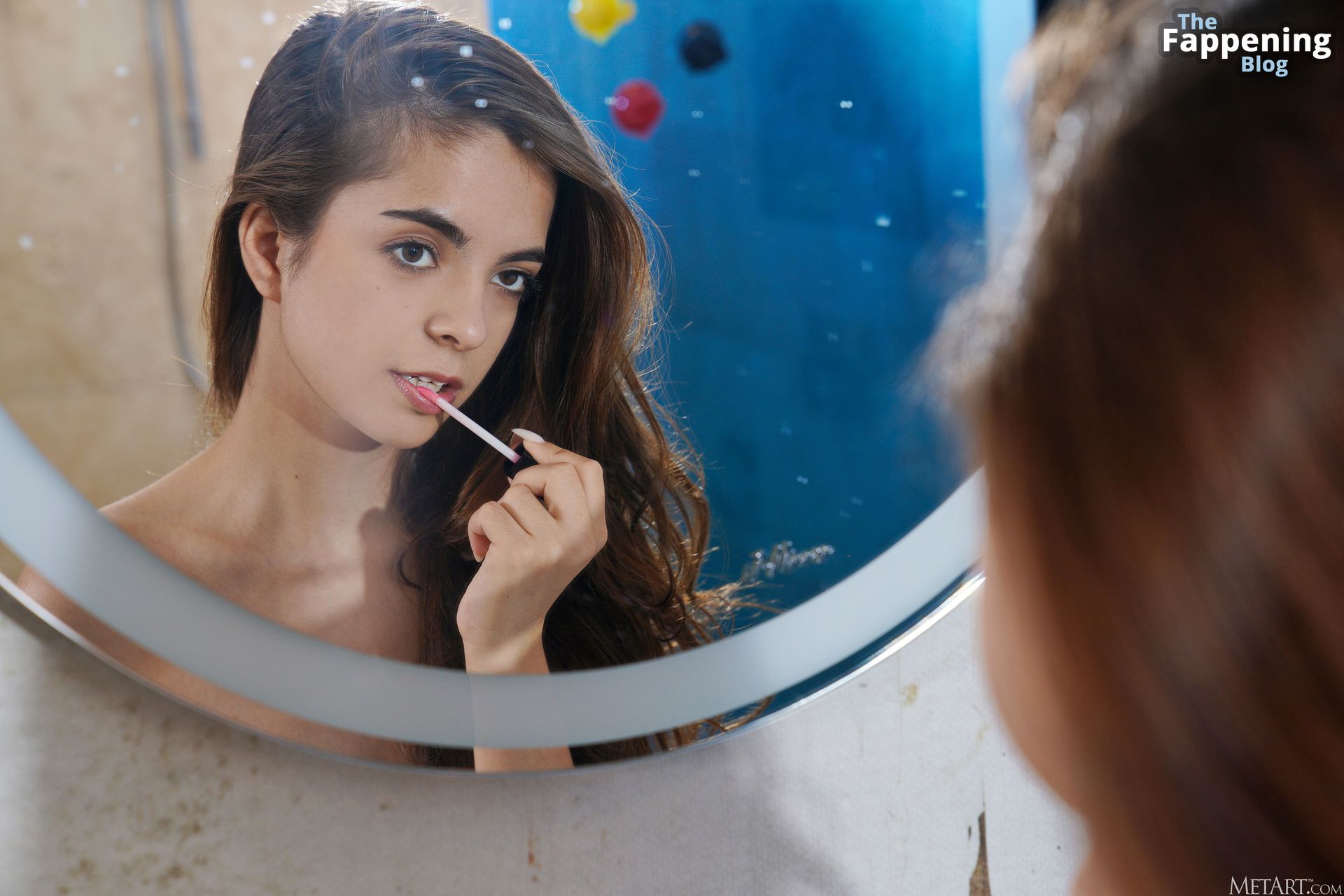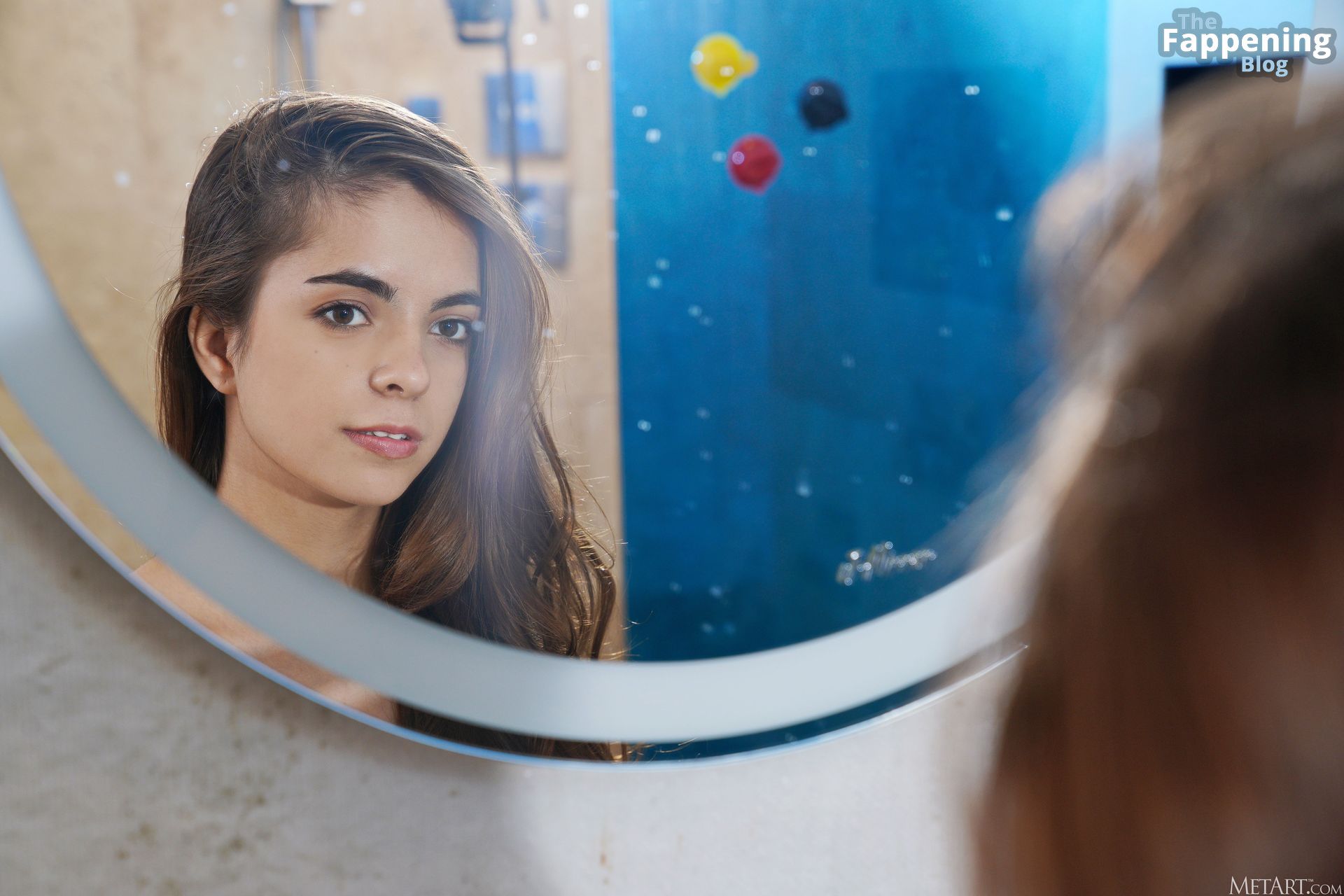 Foto della minuta modella adulta Nessa completamente nuda e a piedi nudi in bagno. Nessa, nata nel 2001, è una modella che ti sorprenderà con la sua altezza di soli 152 cm.