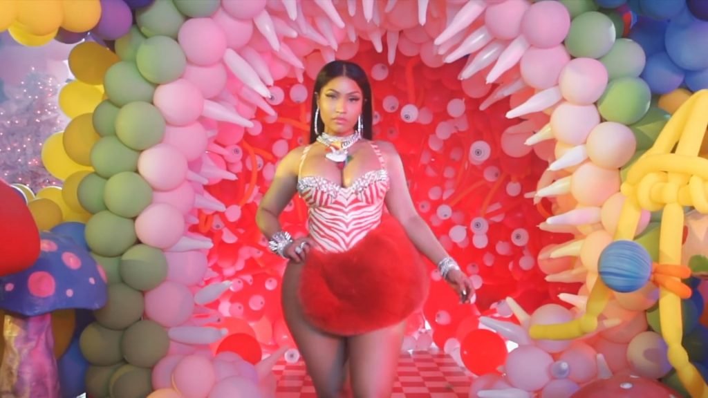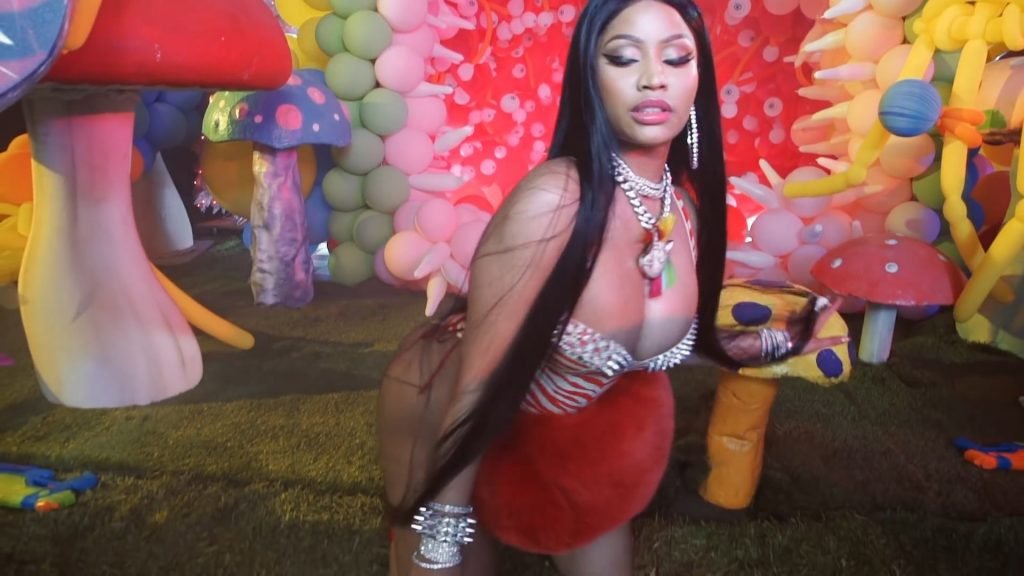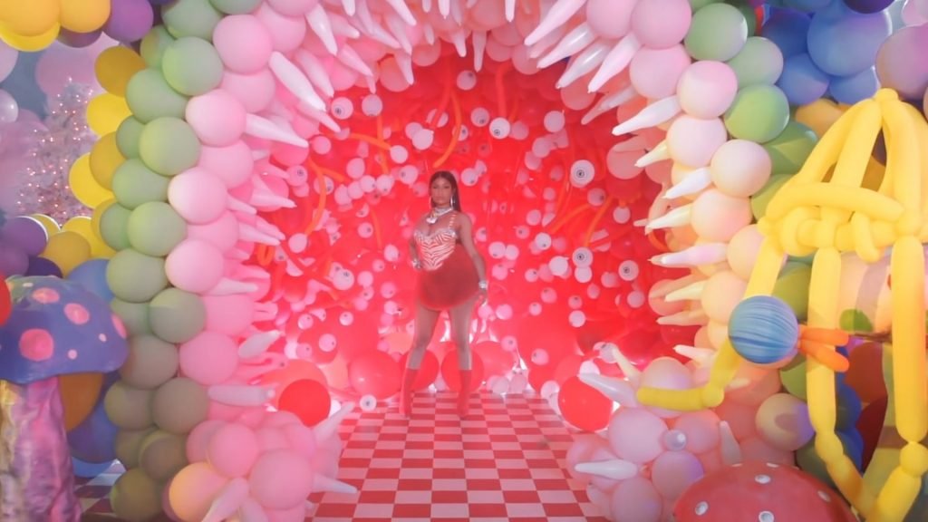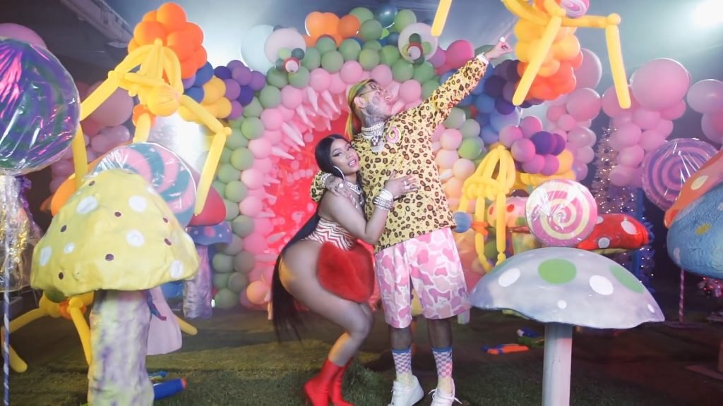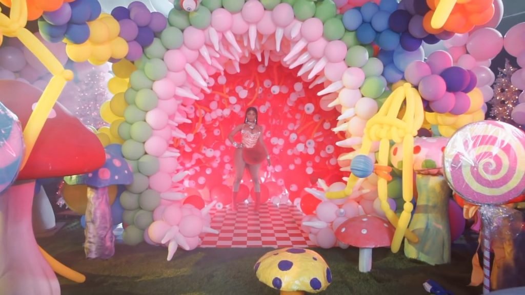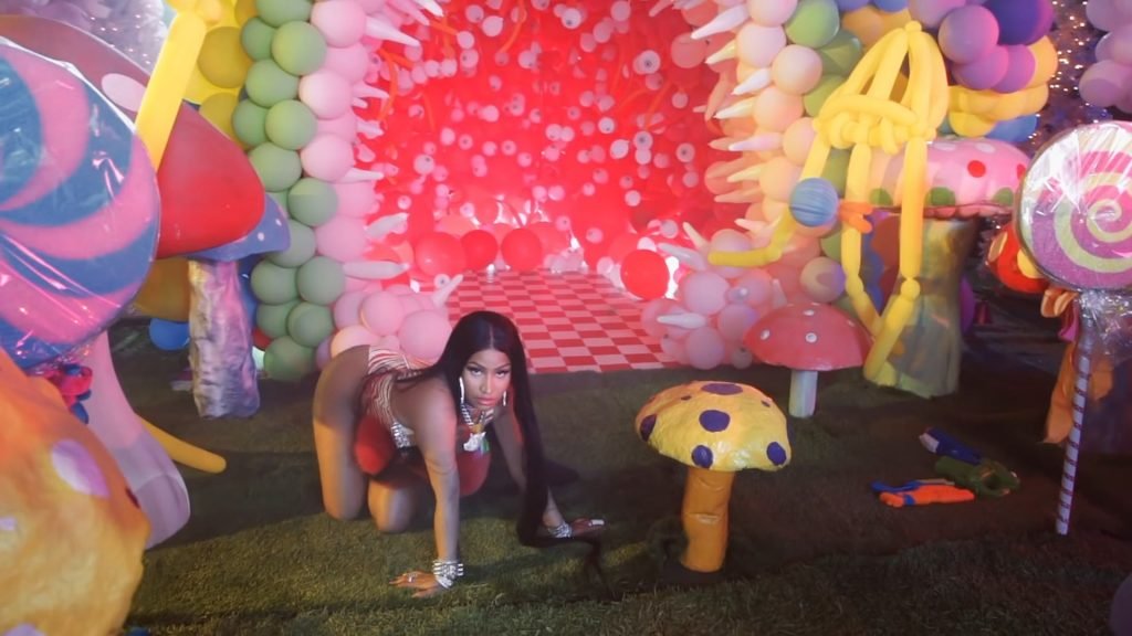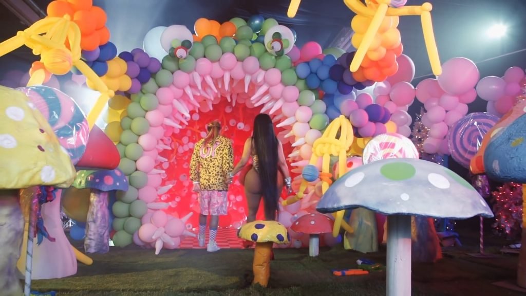 In meno di tre minuti, i rapper mangiano gelato, giocano con pistole ad acqua, ballano accanto a funghi giganti e si vantano di numerose decorazioni.