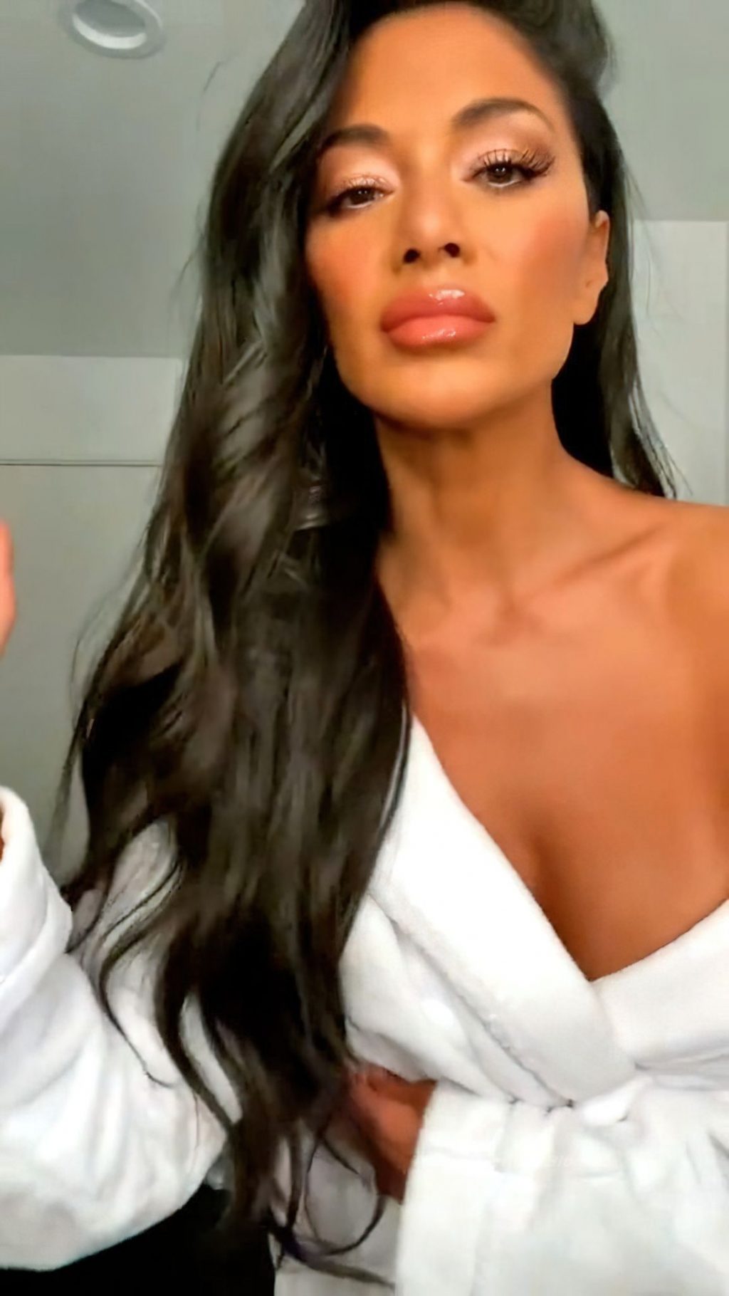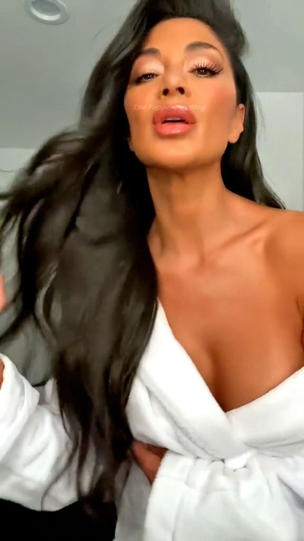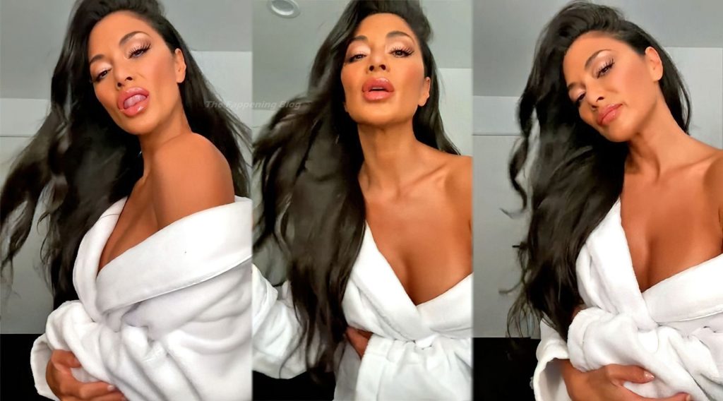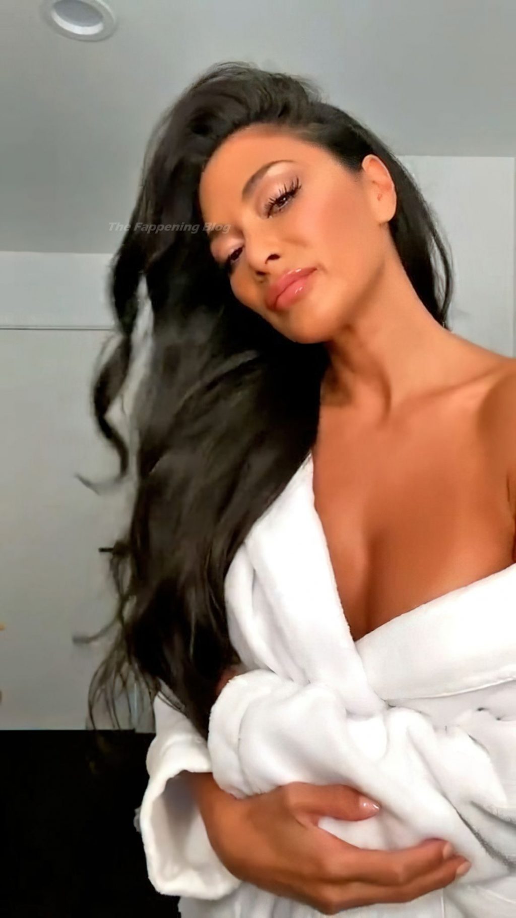La star di The Fappening Nicole Scherzinger sfoggia il suo décolleté posando con un accappatoio bianco aperto in un video sexy per Instagram/TikTok, 02/10/2021.