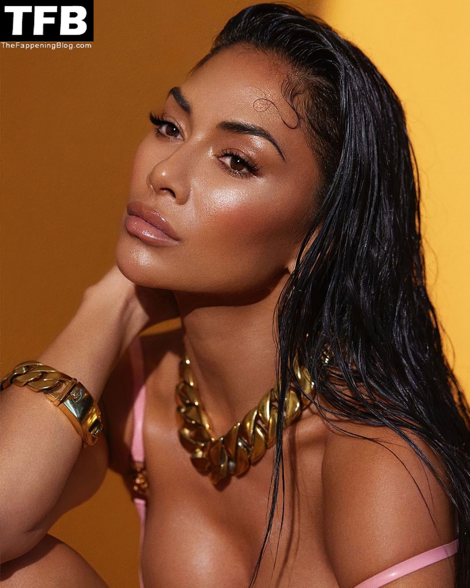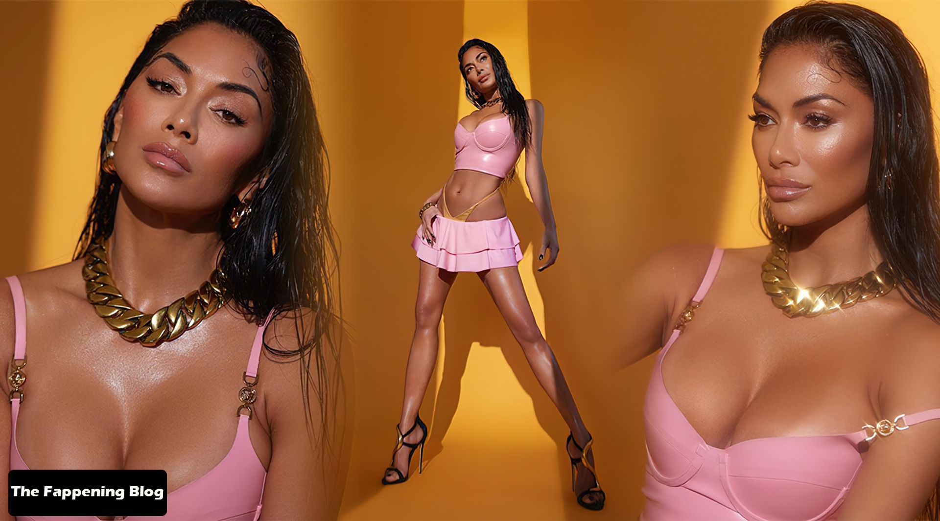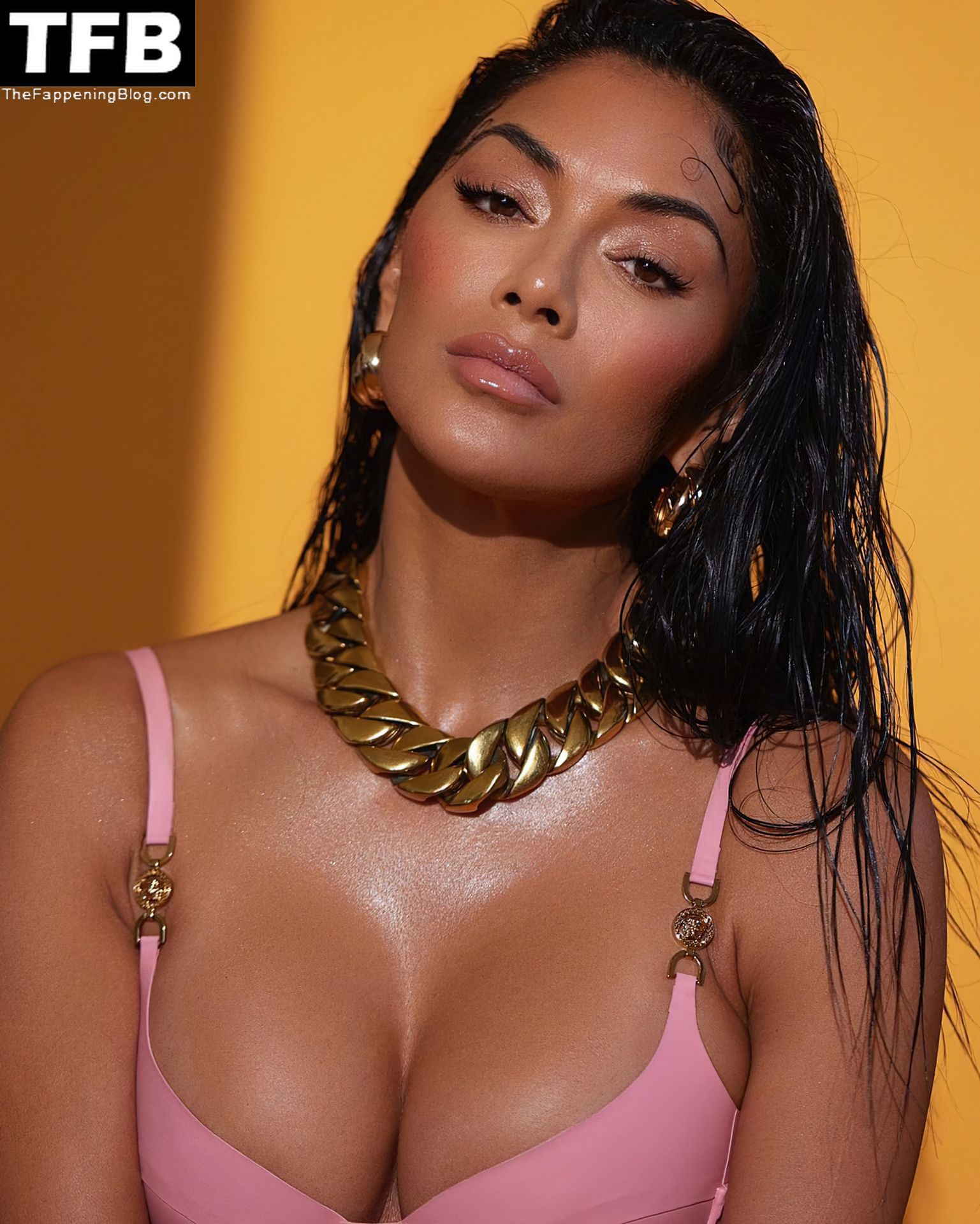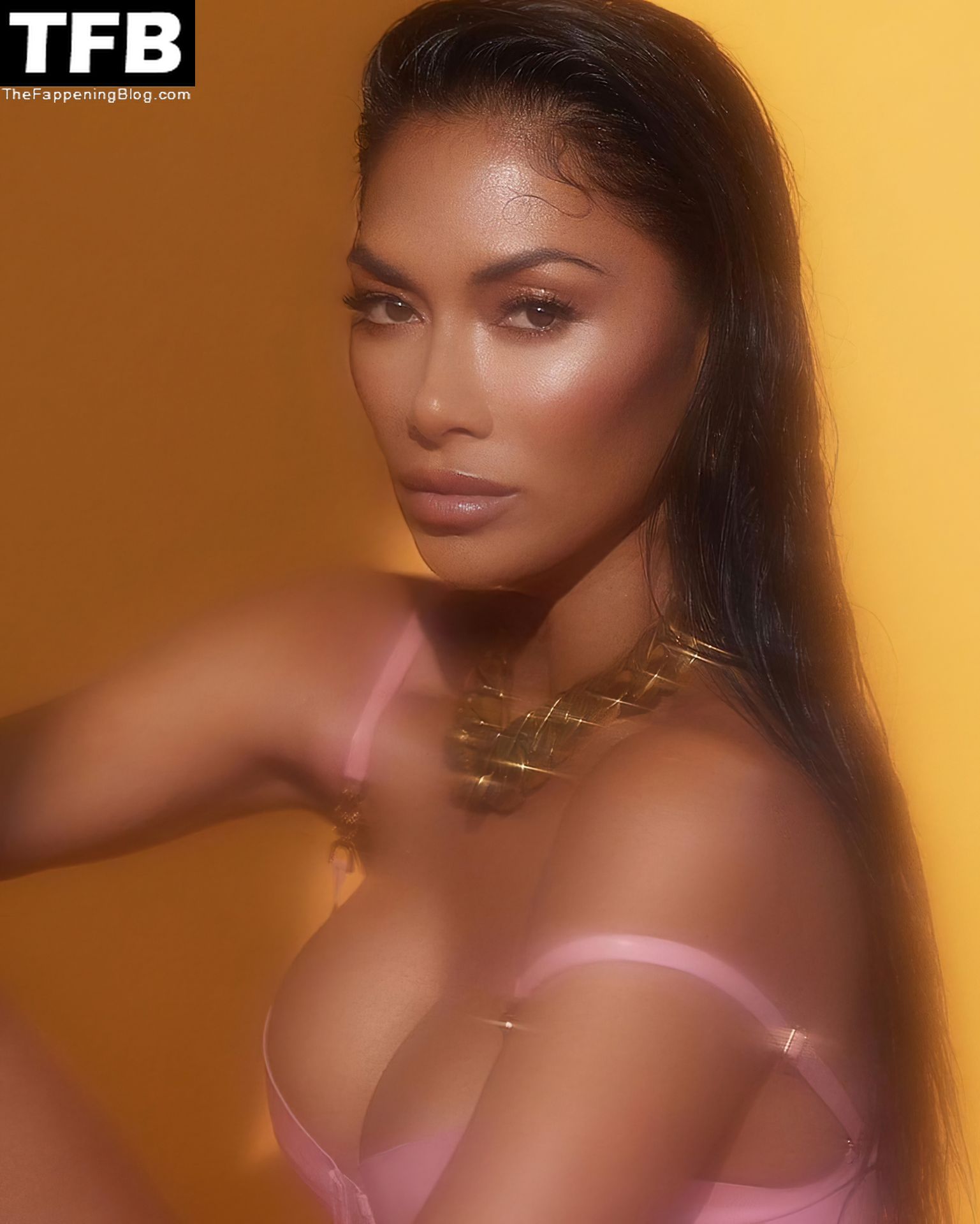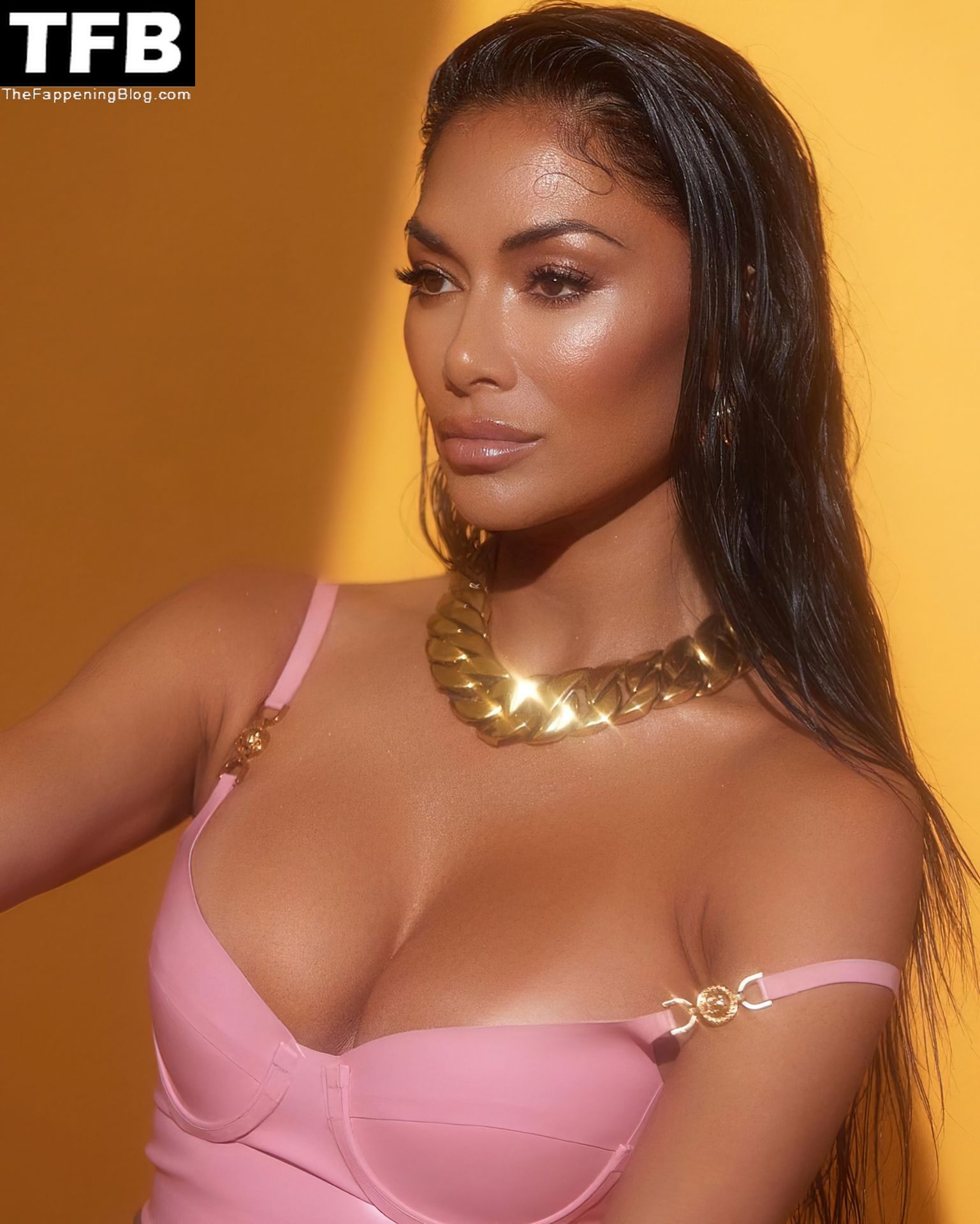 La star di The Fappening Nicole Scherzinger appare sexy mentre posa con un top rosa.