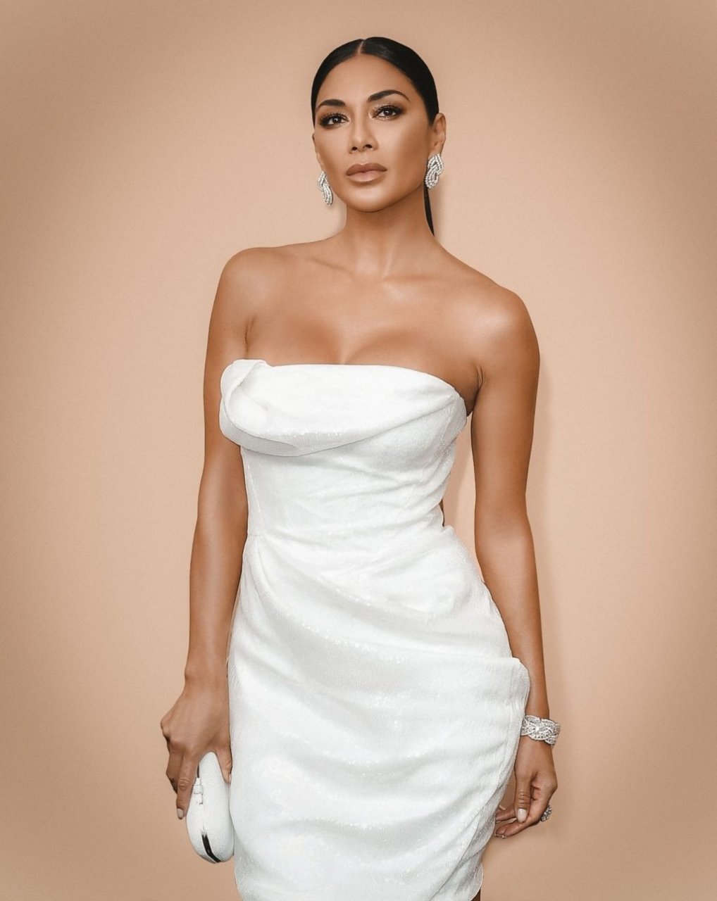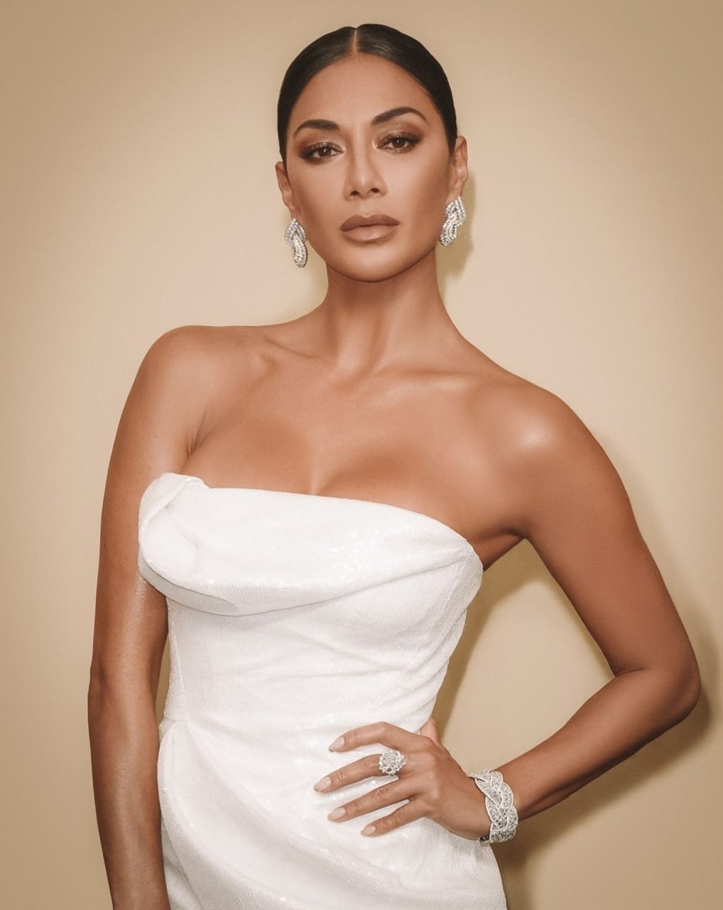 Ritratti dell’ex Pussycat Doll, giudice di “X Factor” e star di The Fappening Nicole Scherzinger vista posare con un abito bianco aderente durante un servizio fotografico ai 71° Annuali Primetime Emmy Awards al Microsoft Theatre, Los Angeles (settembre 2019).