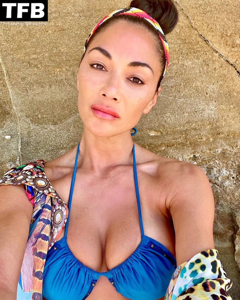 La star di The Fappening Nicole Scherzinger mostra il suo seno sexy mentre posa con un top bikini blu per i suoi follower su Instagram, 28/03/2022.