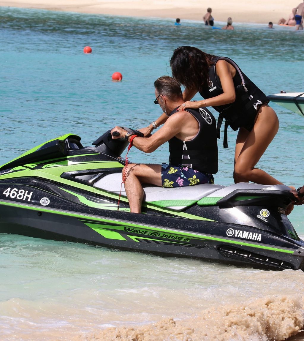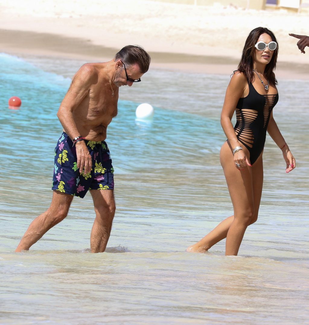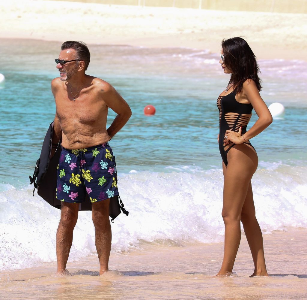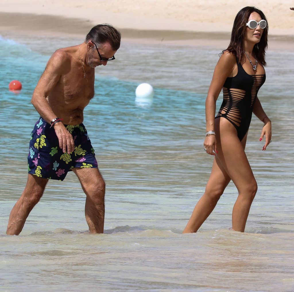 Imprenditore scozzese Duncan Bannatyne e sua moglie Nigora Bannatyne sono stati fotografati mentre si godevano la spiaggia a Barbados, 28/12/2019. Nigora ha mostrato il suo corpo mozzafiato indossando un costume intero nero con tagli interessanti.