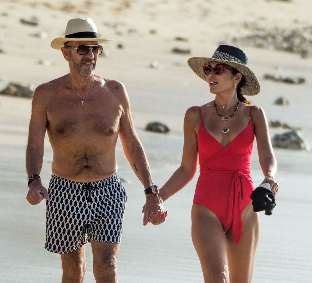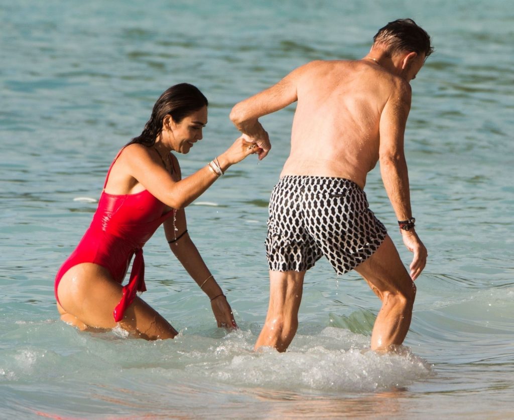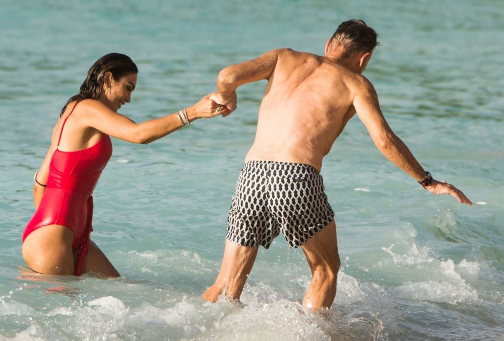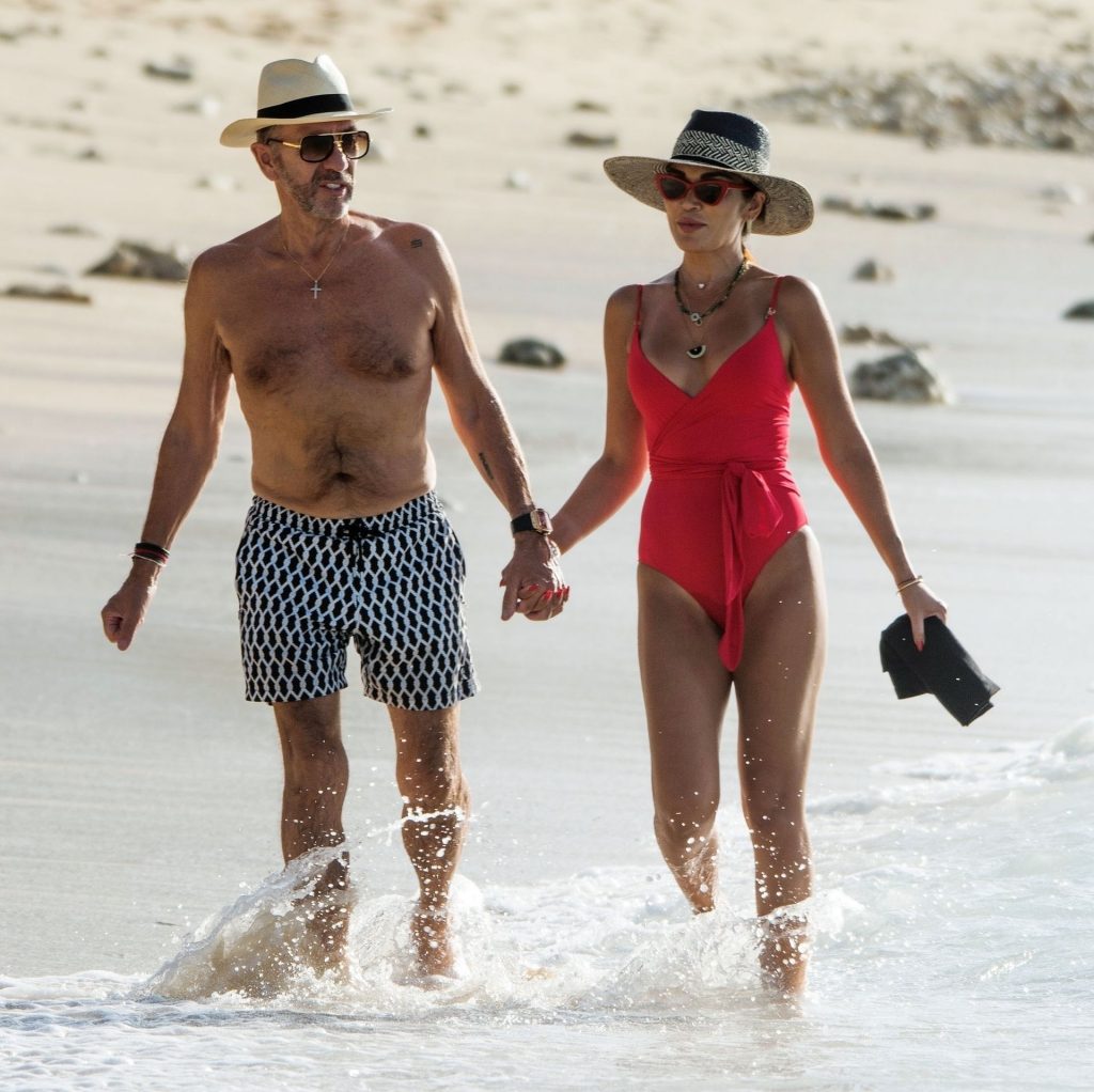 Duncan Bannatyne’s moglie Nigora, 39 anni, mostra il suo incredibile fisico con un costume da bagno rosso in stile Baywatch mentre cammina mano nella mano con il marito Duncan Bannatyne sulla spiaggia di Sandy Lane a Barbados, 25/12/2019.