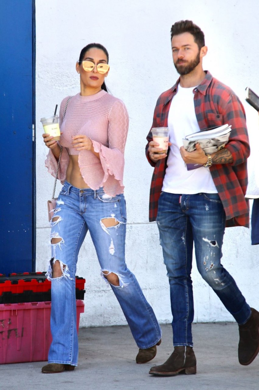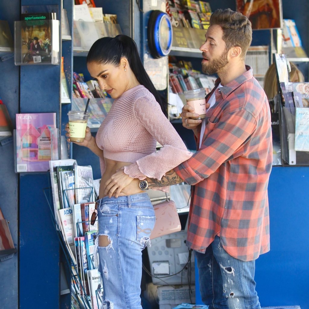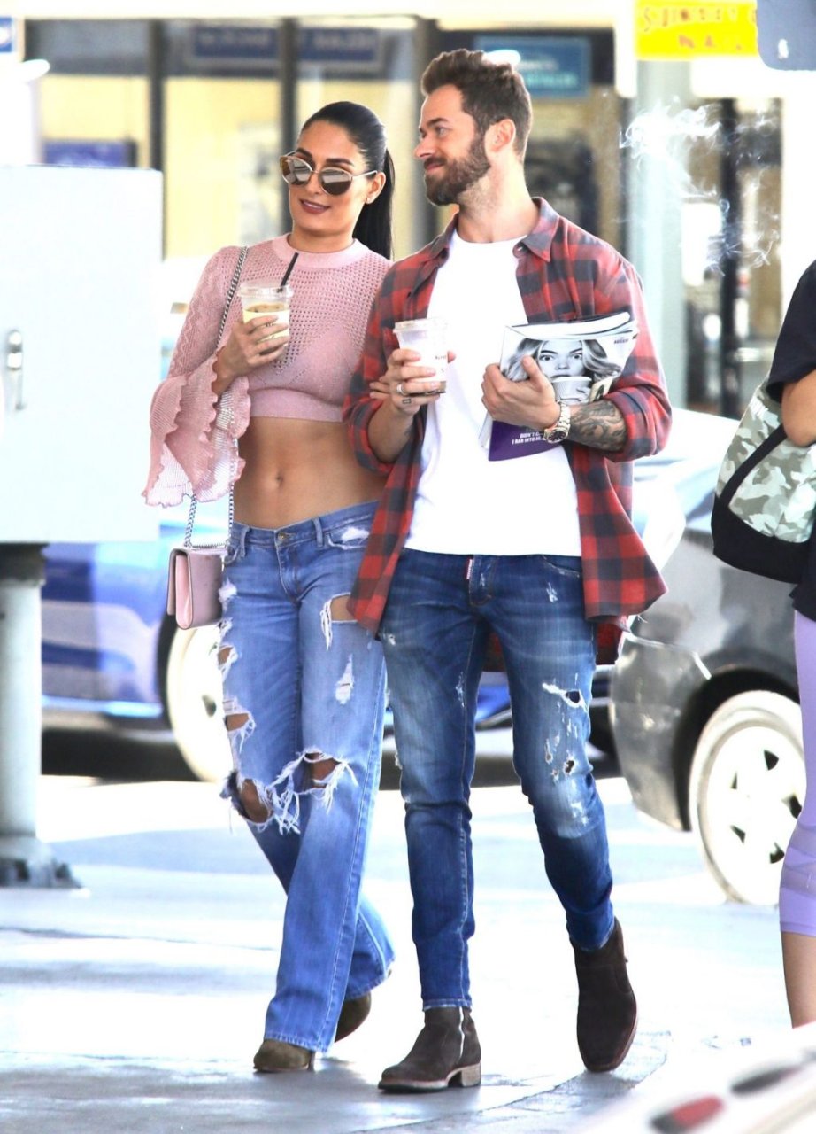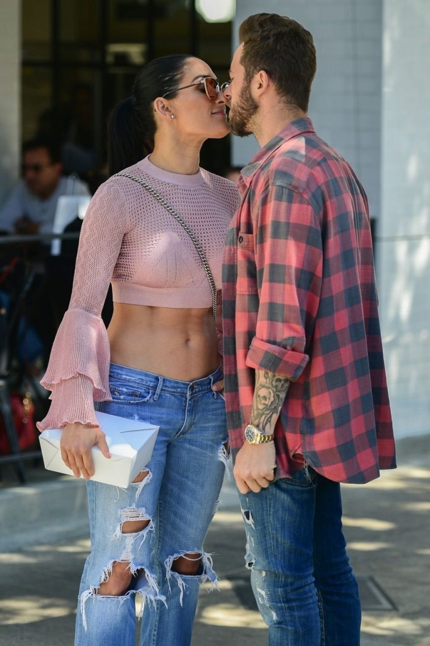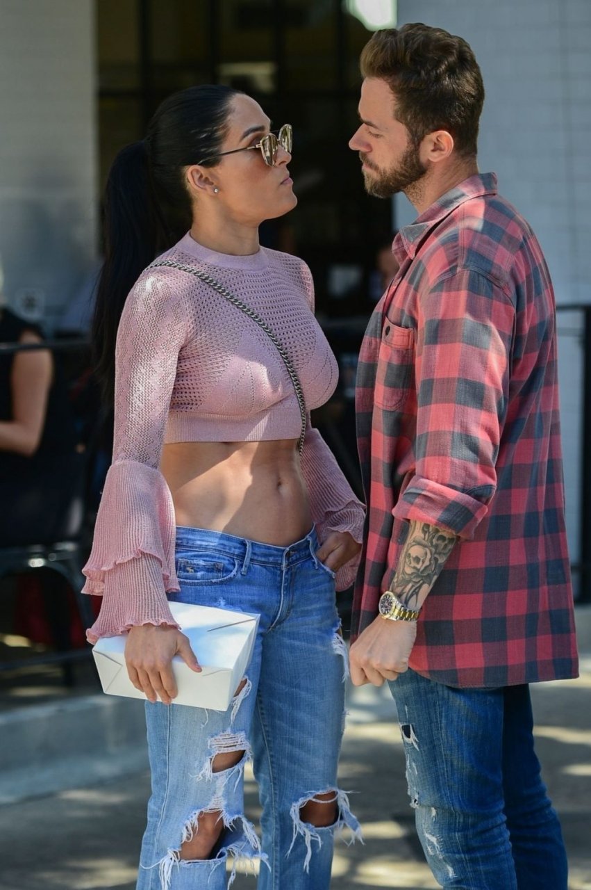 Nikki Bella sfoggia i suoi addominali scolpiti con un crop top rosa e jeans durante un pranzo con Artem Chigvintsev e alcuni familiari da Joan’s On Third a Studio City, 30/09/2019. Gli innamorati si scambiano un dolce bacio mentre aspettano la loro auto al parcheggio con servizio valet chiacchierando.