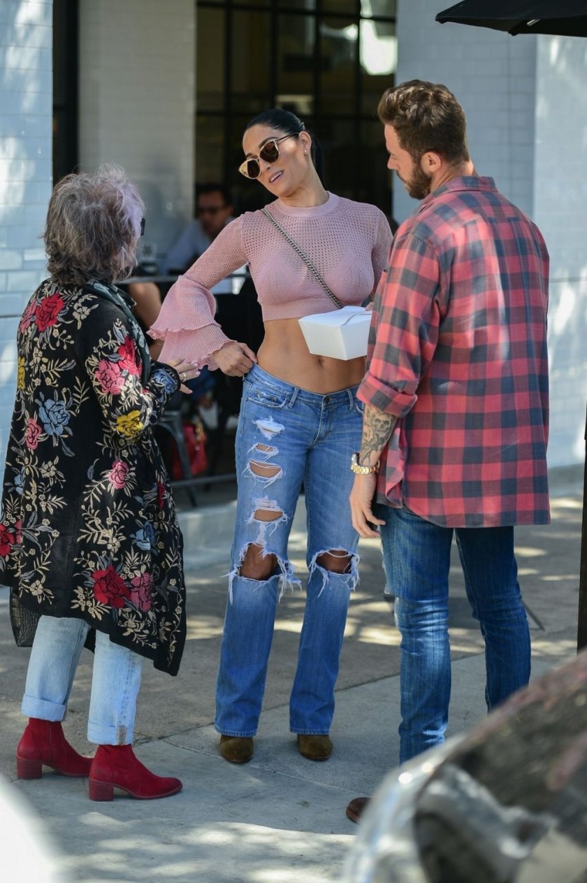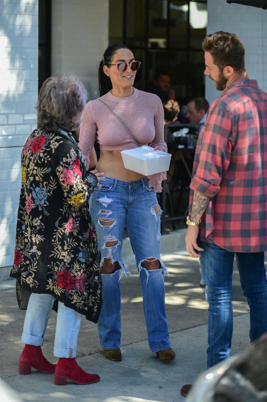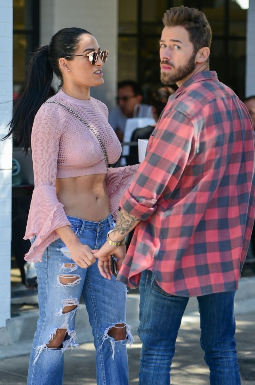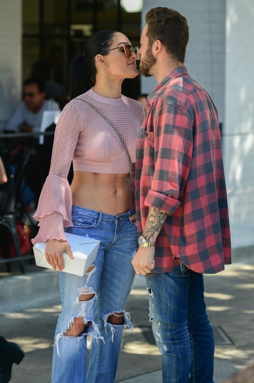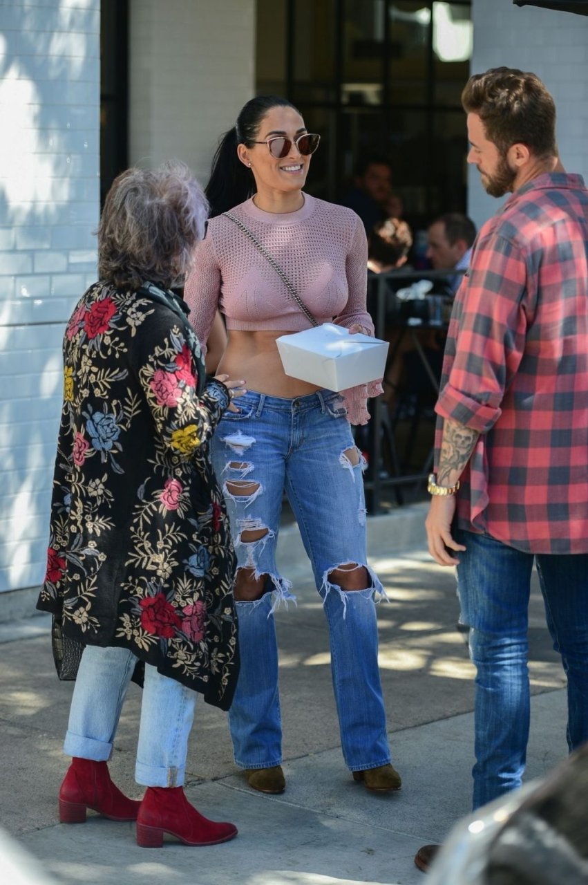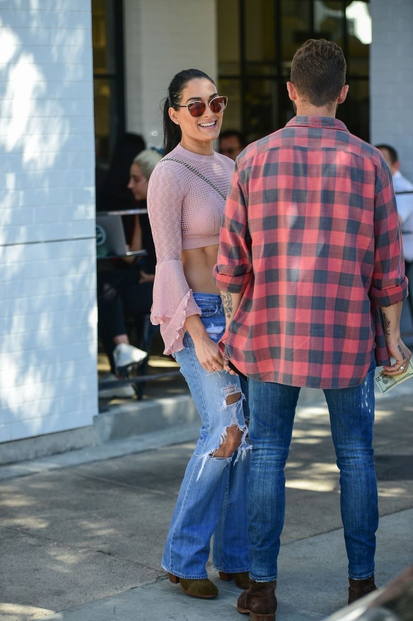 Nikki Bella sfoggia i suoi addominali scolpiti con un crop top rosa e jeans durante un pranzo con Artem Chigvintsev e alcuni familiari da Joan’s On Third a Studio City, 30/09/2019. Gli innamorati si scambiano un dolce bacio mentre aspettano la loro auto al parcheggio con servizio valet chiacchierando.