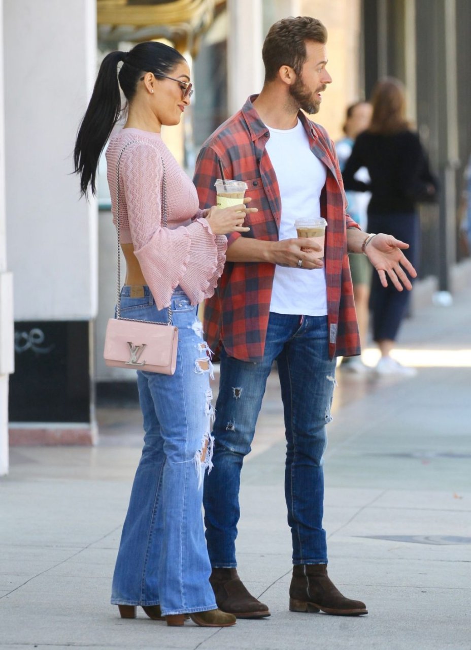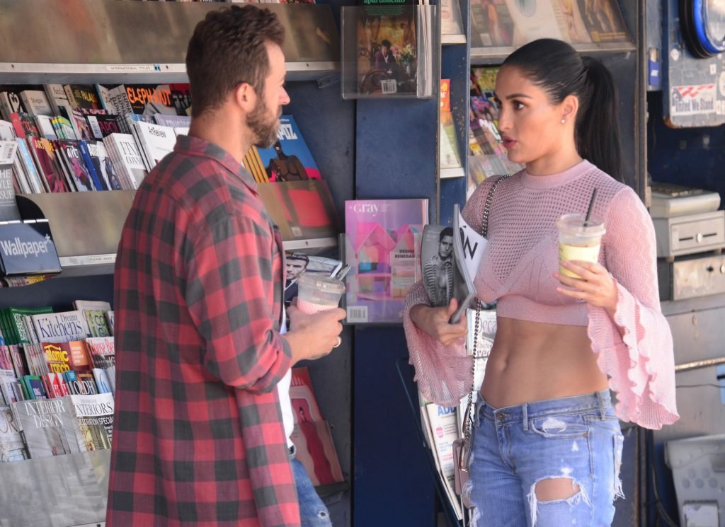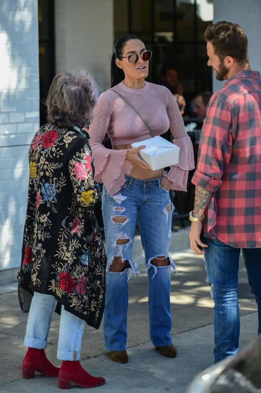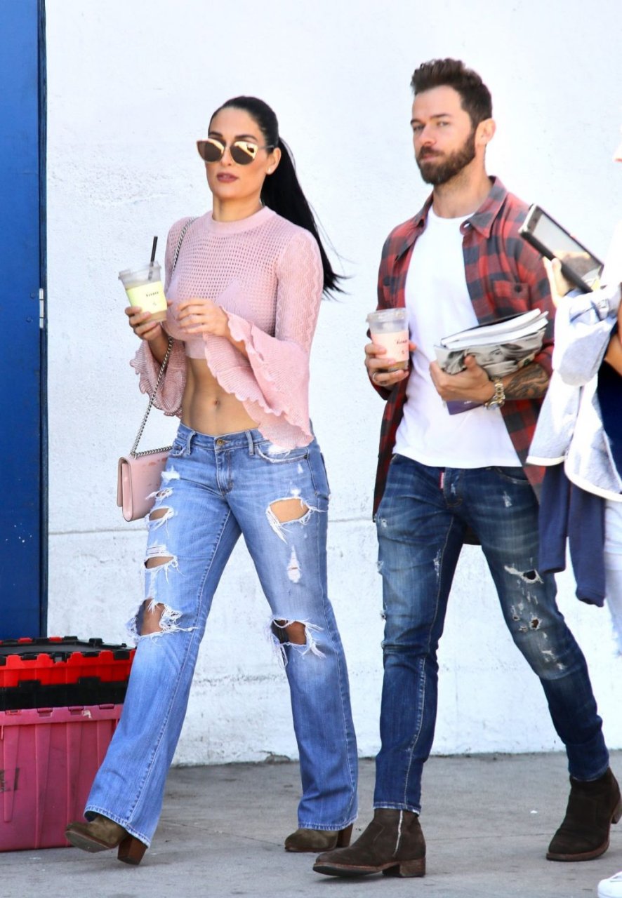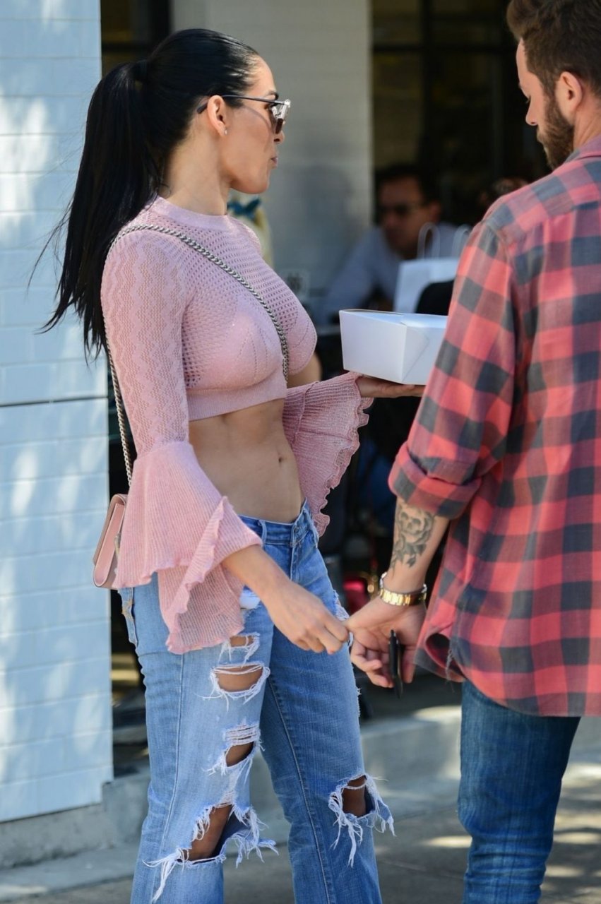 Nikki Bella sfoggia i suoi addominali scolpiti con un crop top rosa e jeans durante un pranzo con Artem Chigvintsev e alcuni familiari da Joan’s On Third a Studio City, 30/09/2019. Gli innamorati si scambiano un dolce bacio mentre aspettano la loro auto al parcheggio con servizio valet chiacchierando.