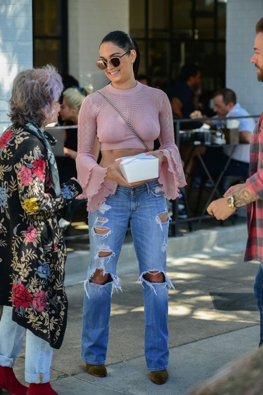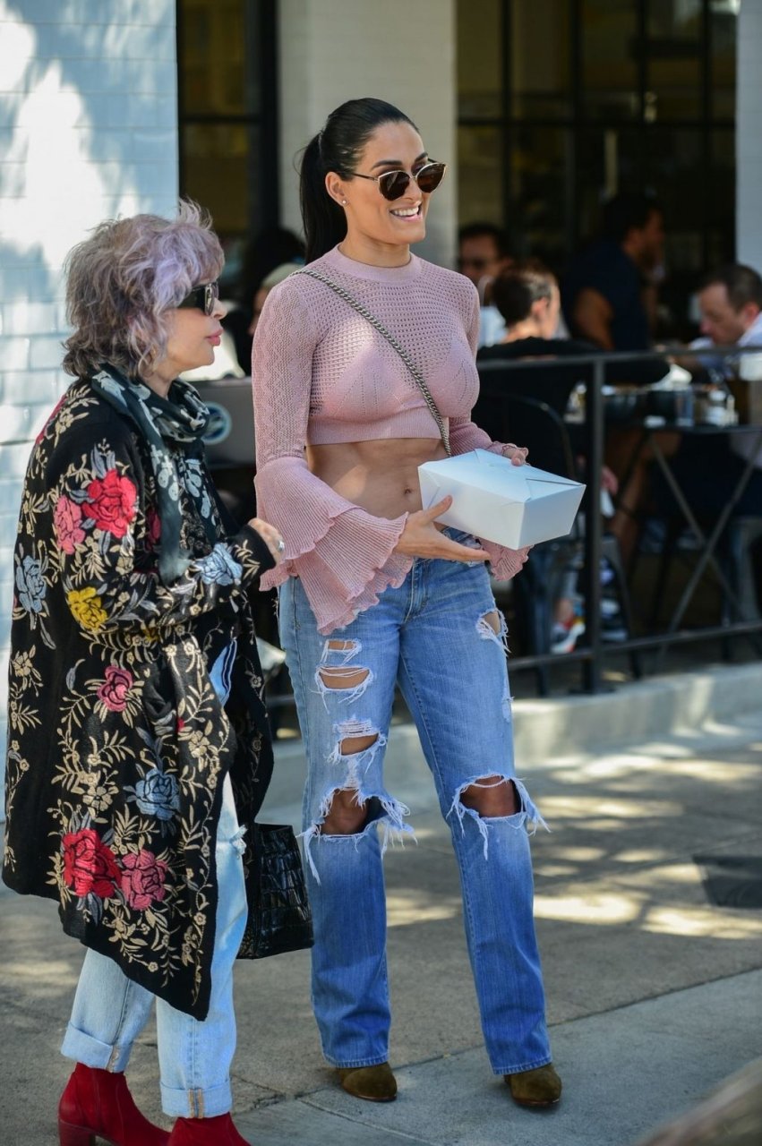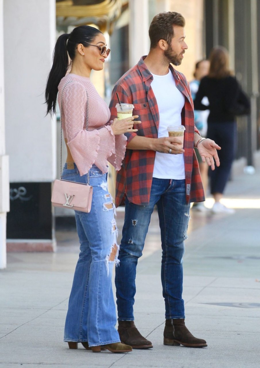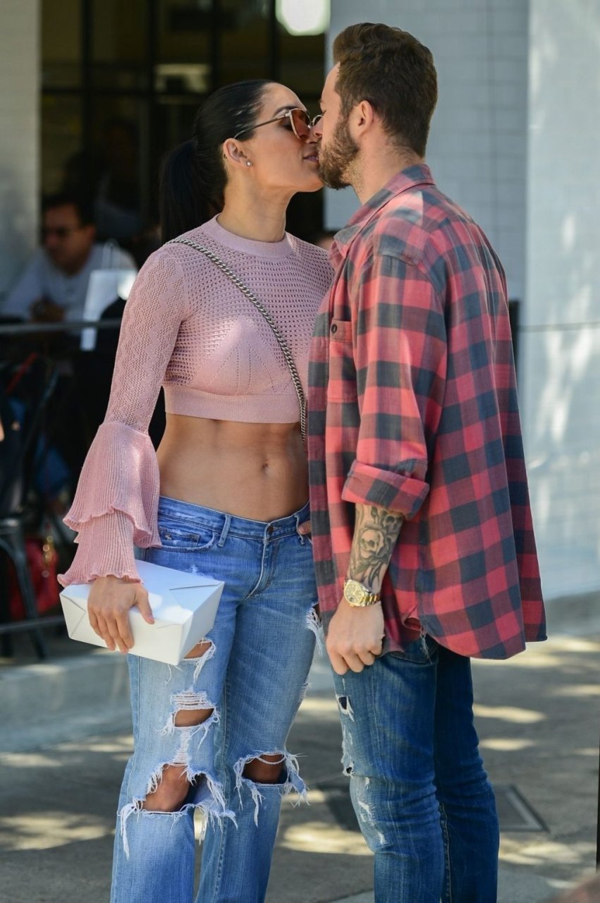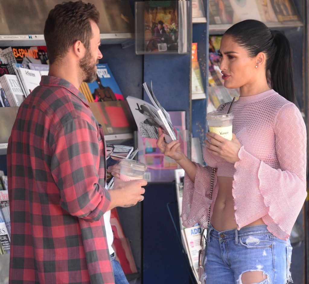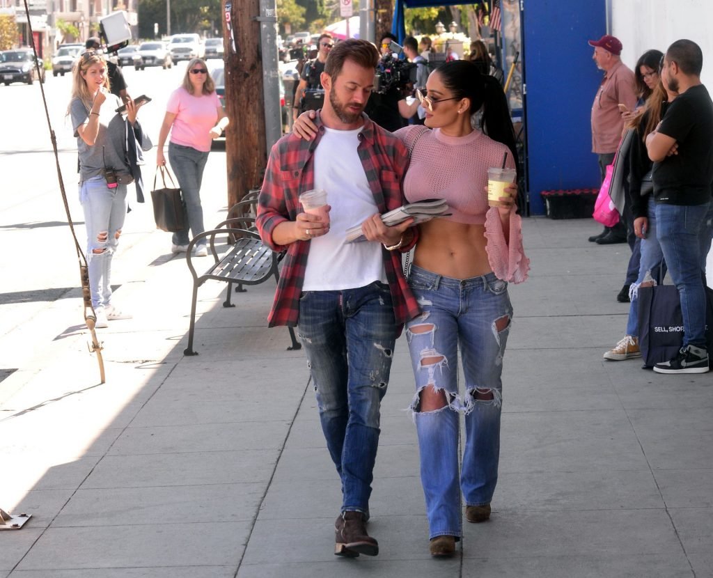 Nikki Bella sfoggia i suoi addominali scolpiti con un crop top rosa e jeans durante un pranzo con Artem Chigvintsev e alcuni familiari da Joan’s On Third a Studio City, 30/09/2019. Gli innamorati si scambiano un dolce bacio mentre aspettano la loro auto al parcheggio con servizio valet chiacchierando.