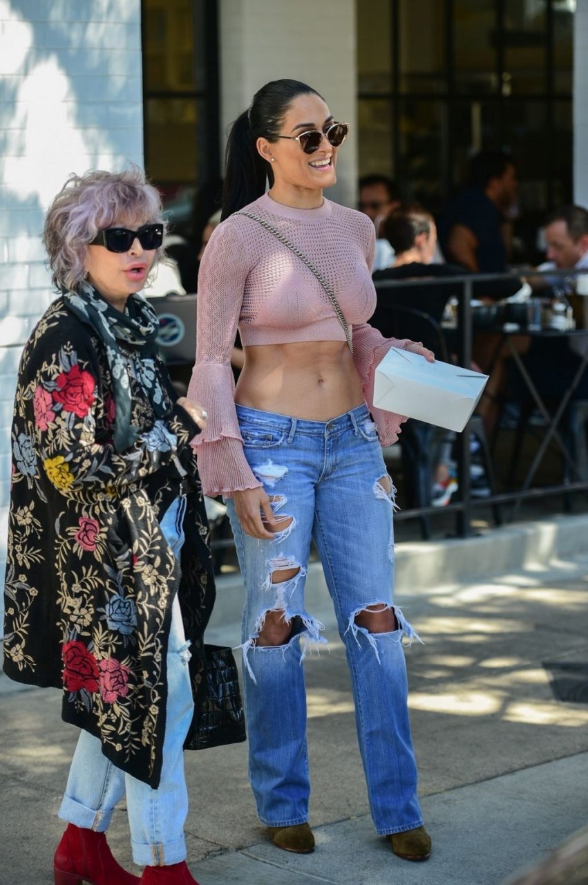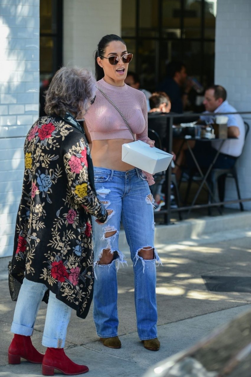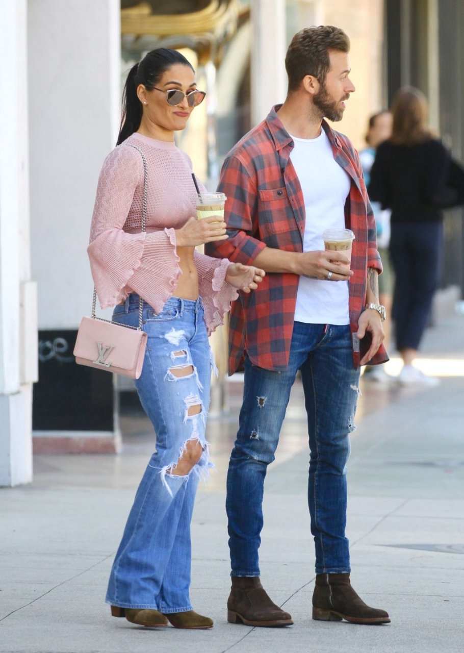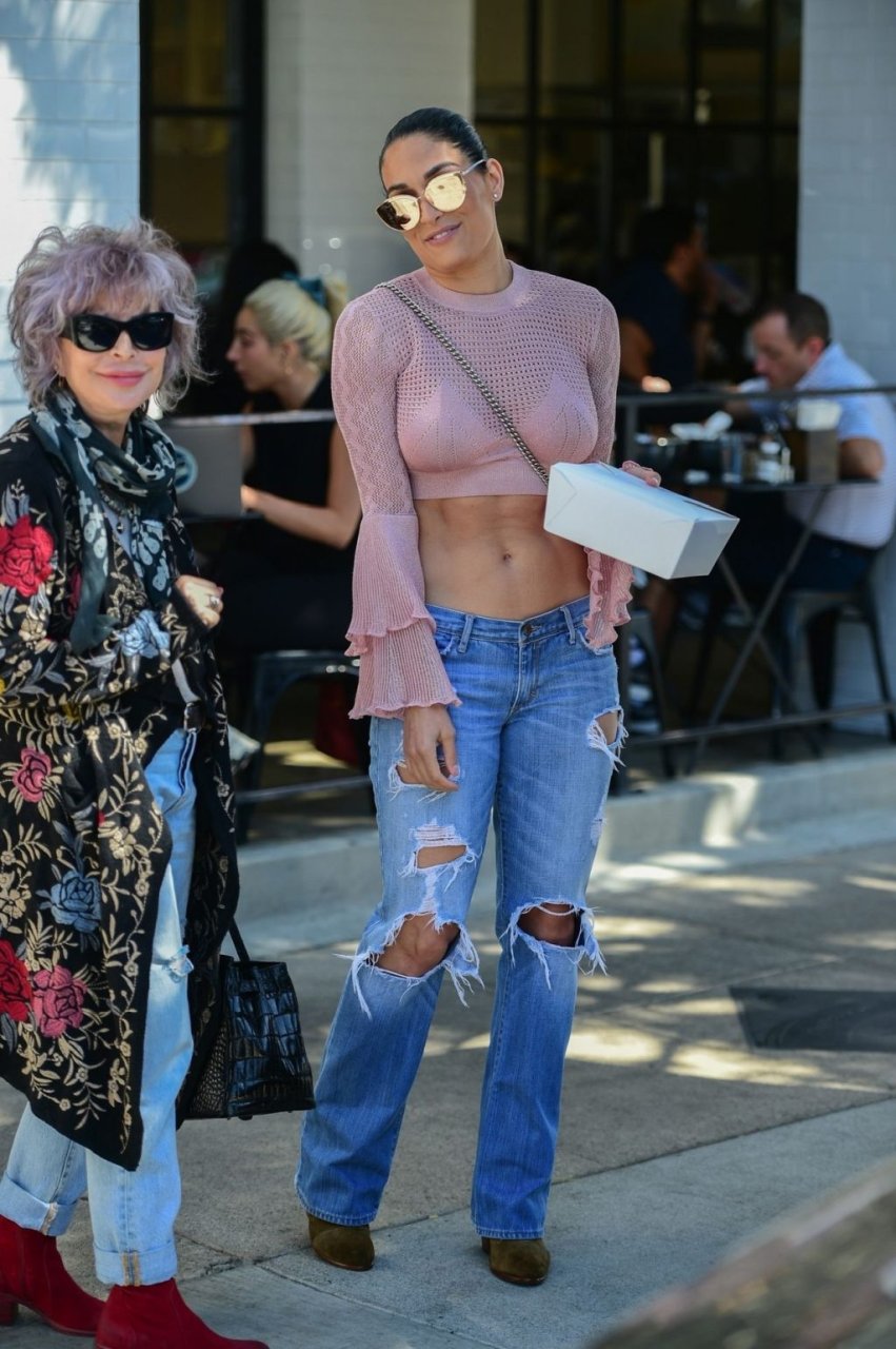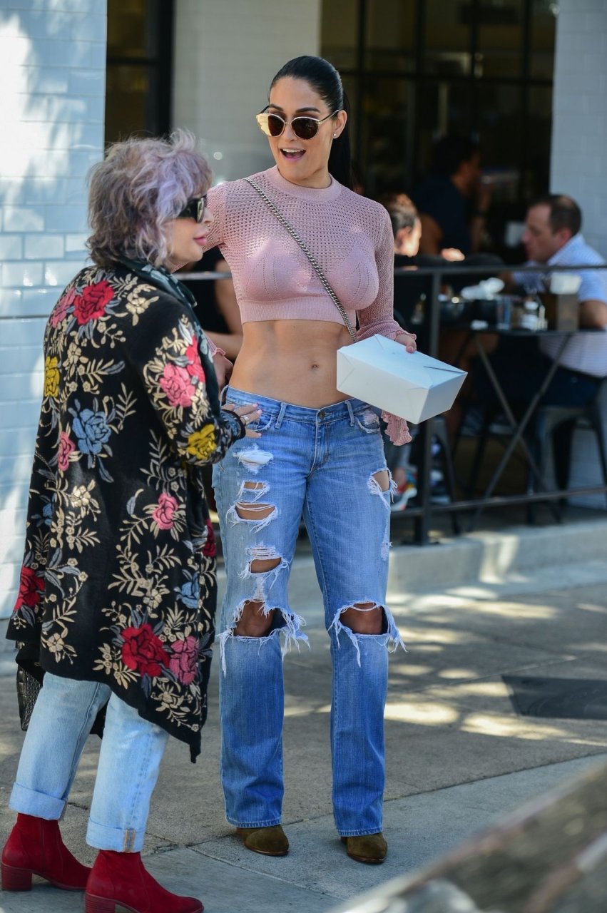 Nikki Bella sfoggia i suoi addominali scolpiti con un crop top rosa e jeans durante un pranzo con Artem Chigvintsev e alcuni familiari da Joan’s On Third a Studio City, 30/09/2019. Gli innamorati si scambiano un dolce bacio mentre aspettano la loro auto al parcheggio con servizio valet chiacchierando.