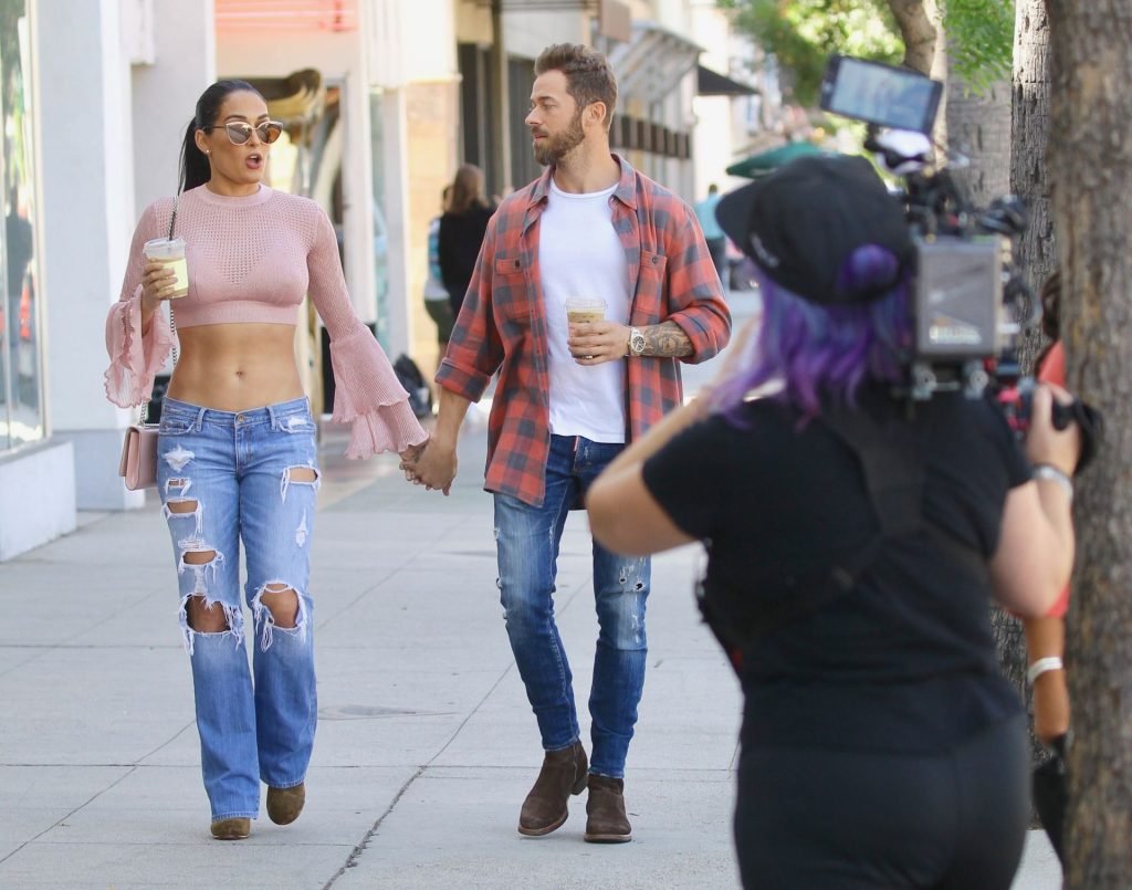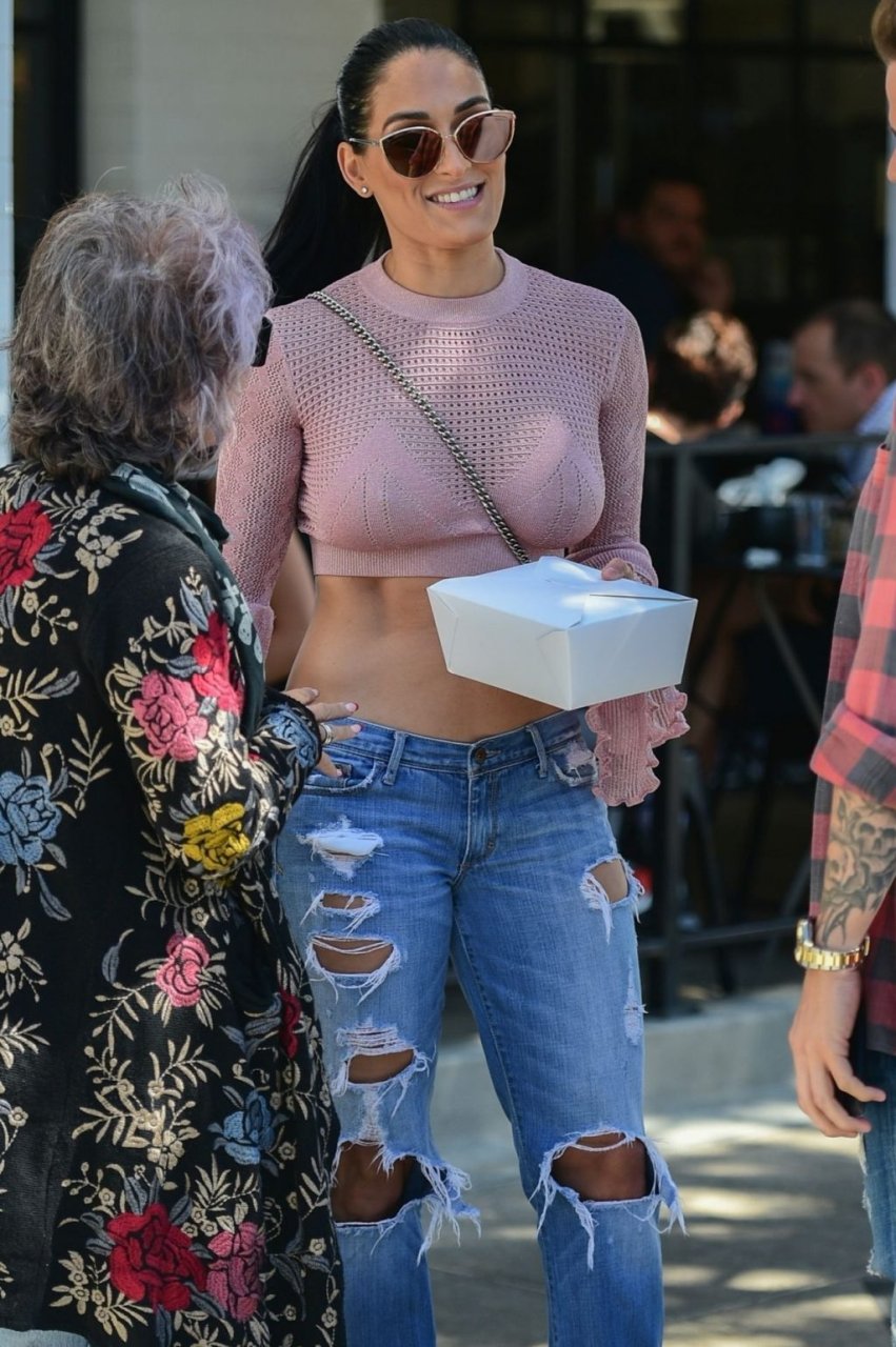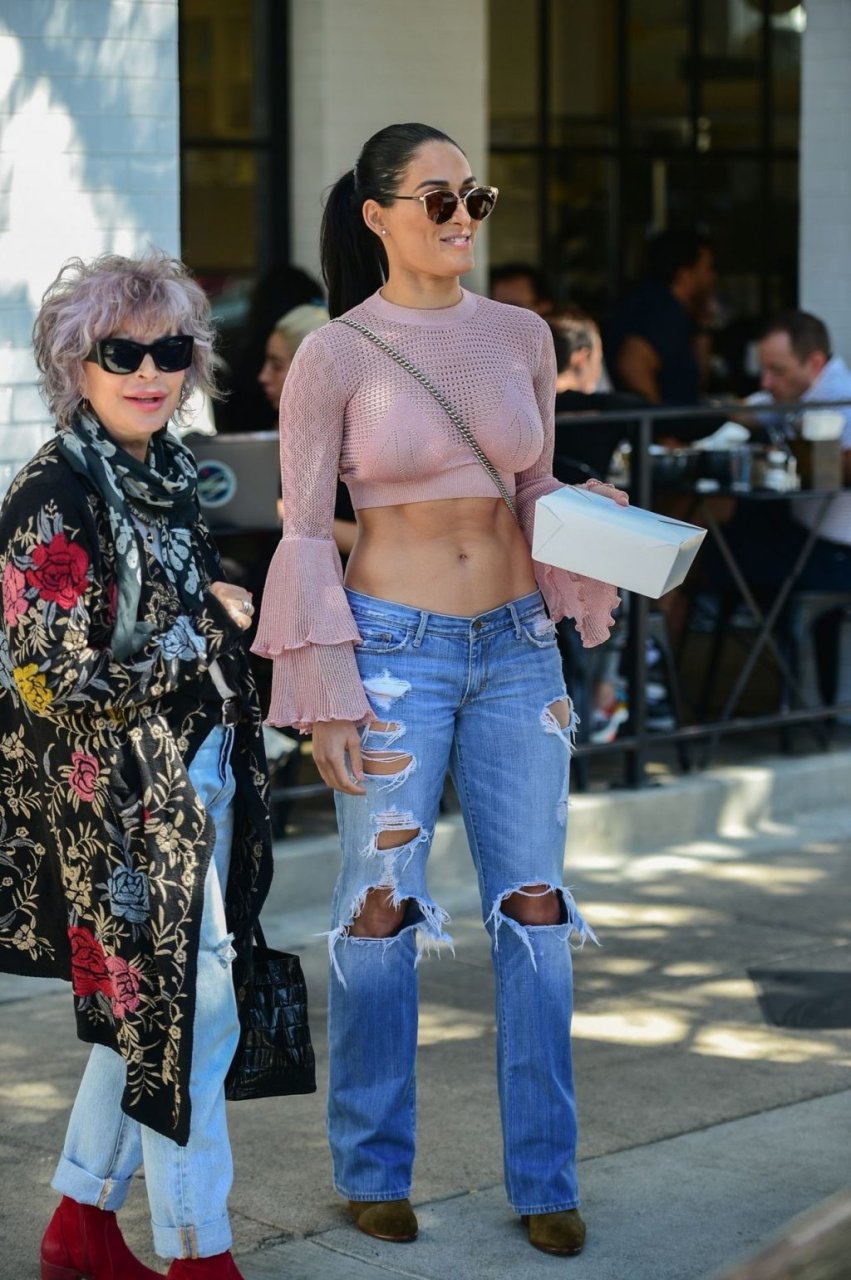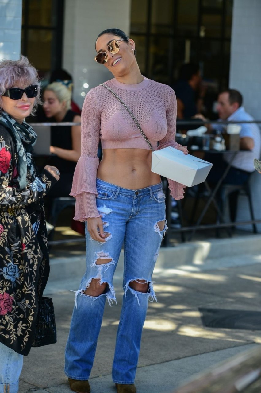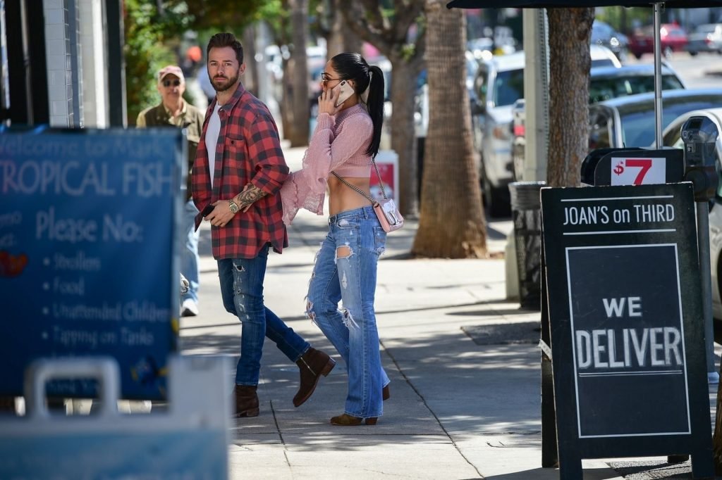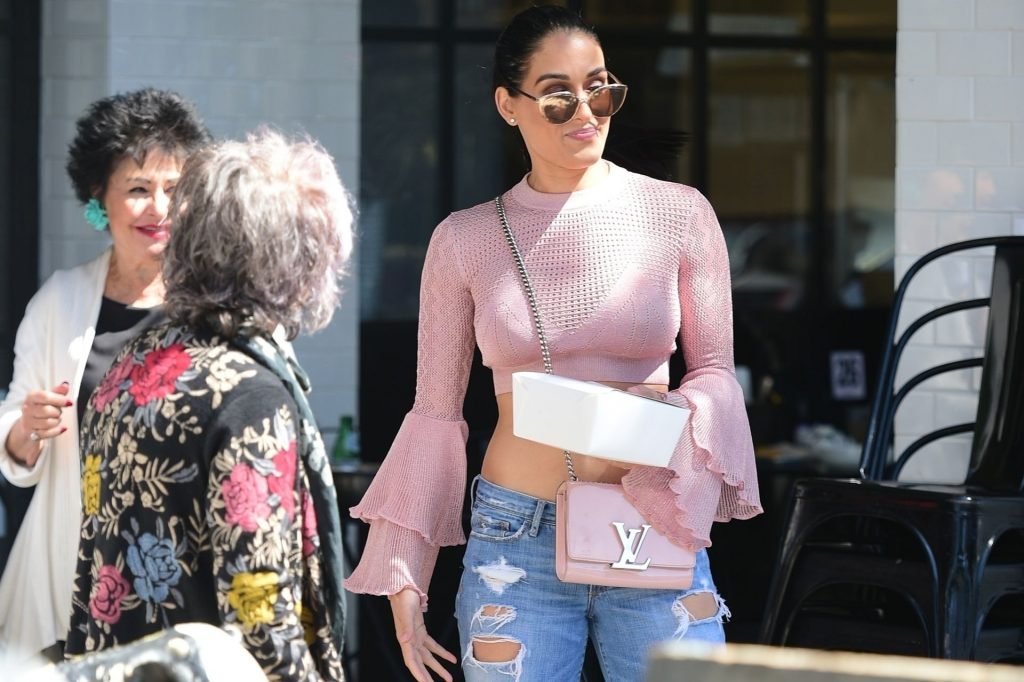 Nikki Bella sfoggia i suoi addominali scolpiti con un crop top rosa e jeans durante un pranzo con Artem Chigvintsev e alcuni familiari da Joan’s On Third a Studio City, 30/09/2019. Gli innamorati si scambiano un dolce bacio mentre aspettano la loro auto al parcheggio con servizio valet chiacchierando.