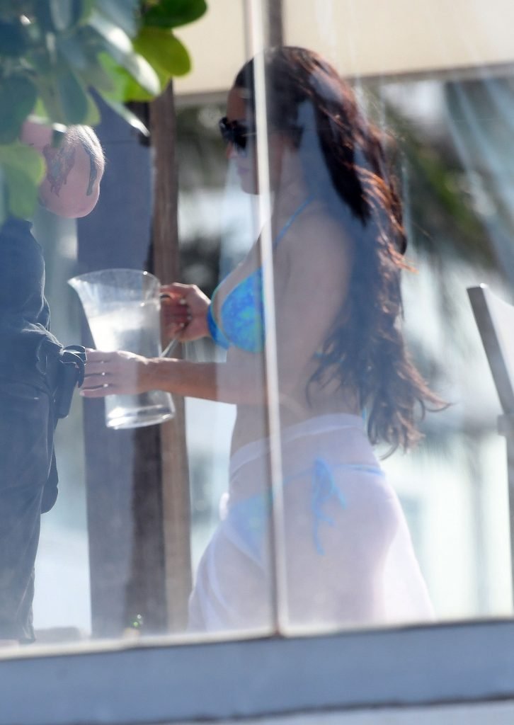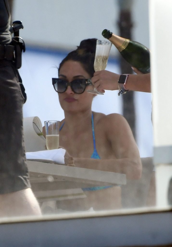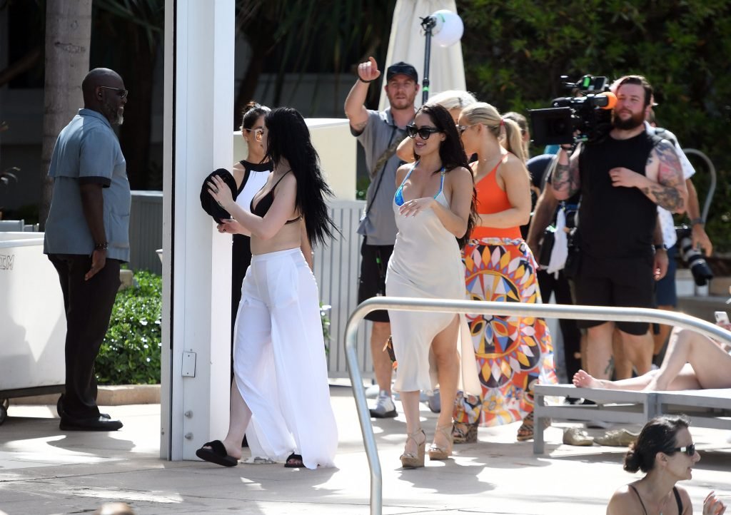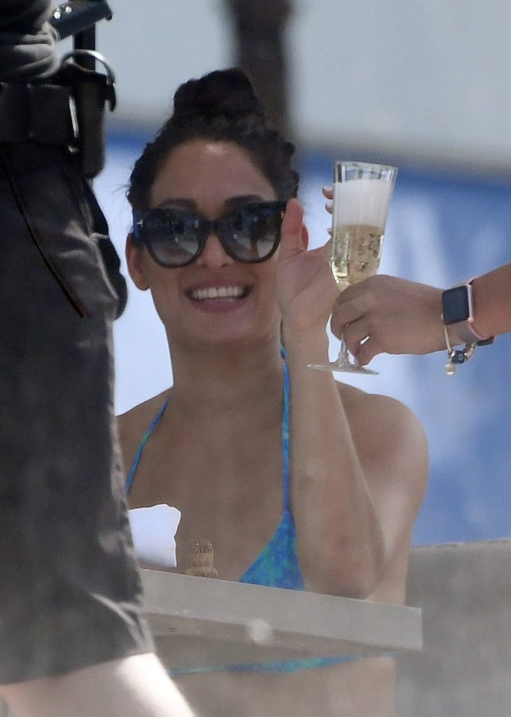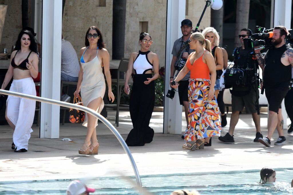 La star della WWE Nikki Bella, 34 anni, attira l’attenzione con un sexy bikini blu mentre si tuffa in piscina durante le riprese con altre ragazze per Total Divas a Miami, 30/05/2018.