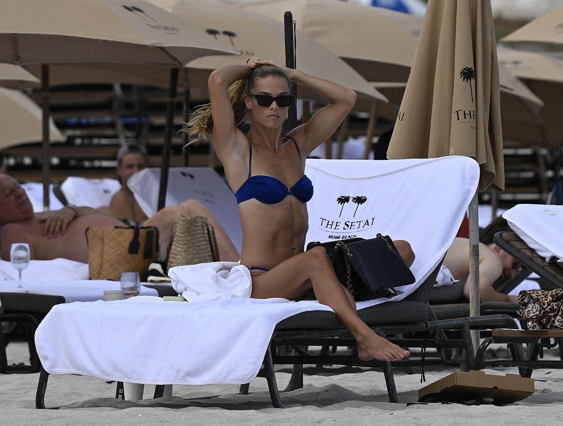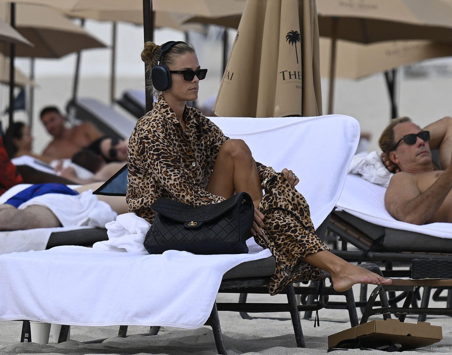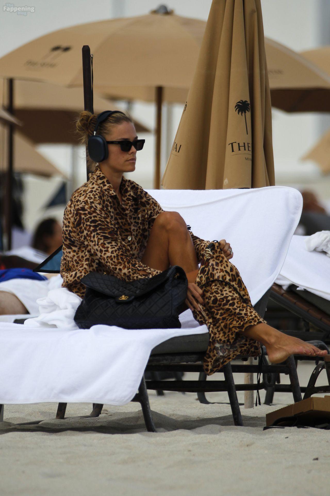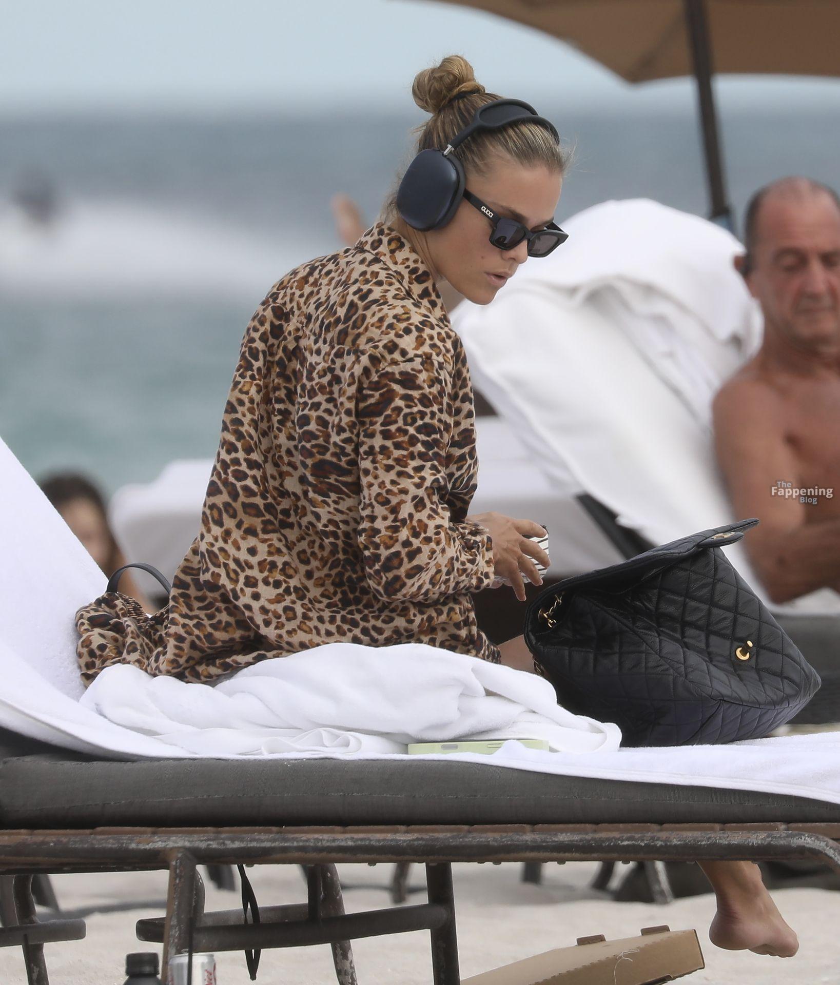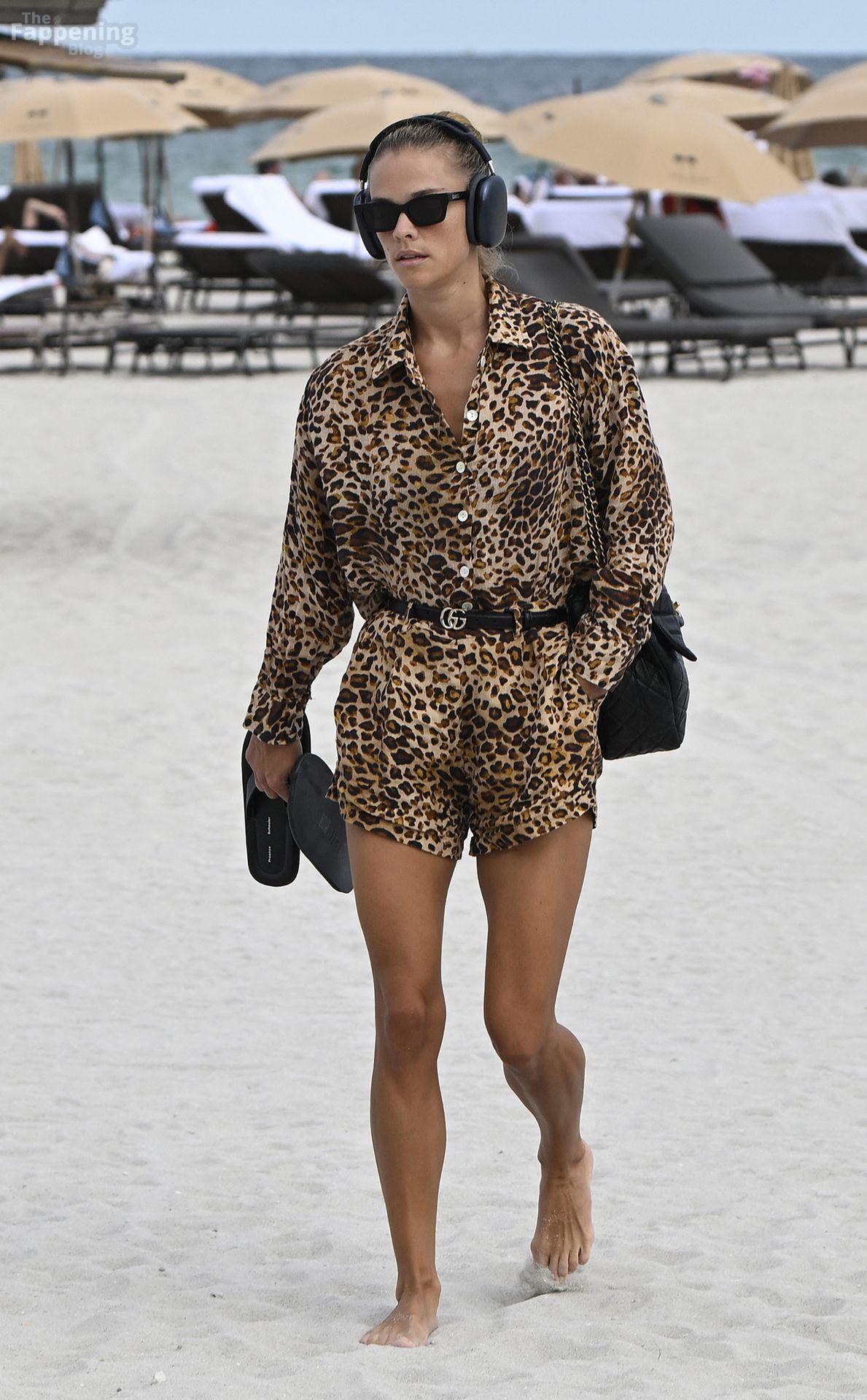 La modella danese Nina Agdal è stata vista mentre si godeva il sole a Miami Beach, indossando un bikini blu prima di cambiarsi in un elegante outfit con stampa leopardata.