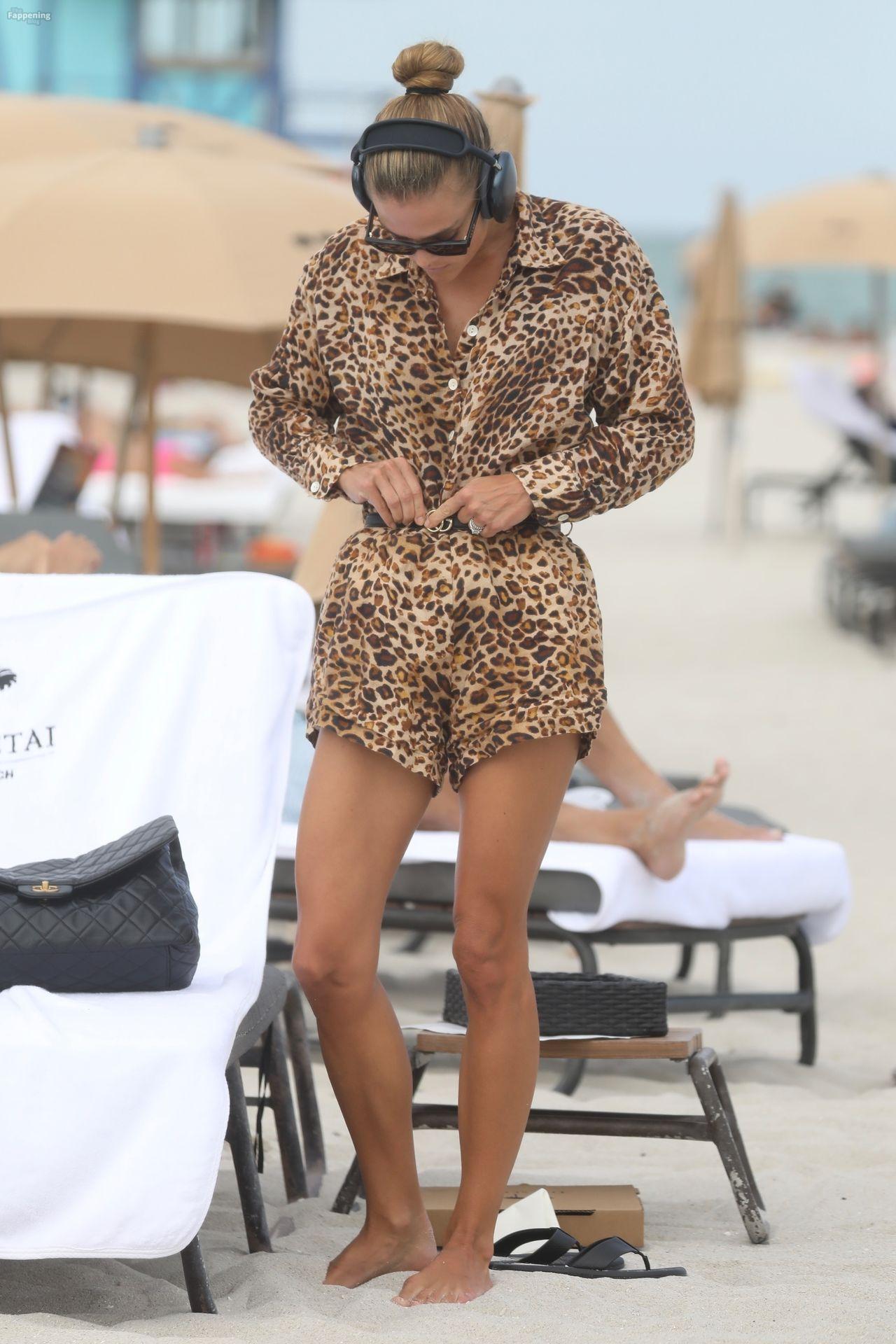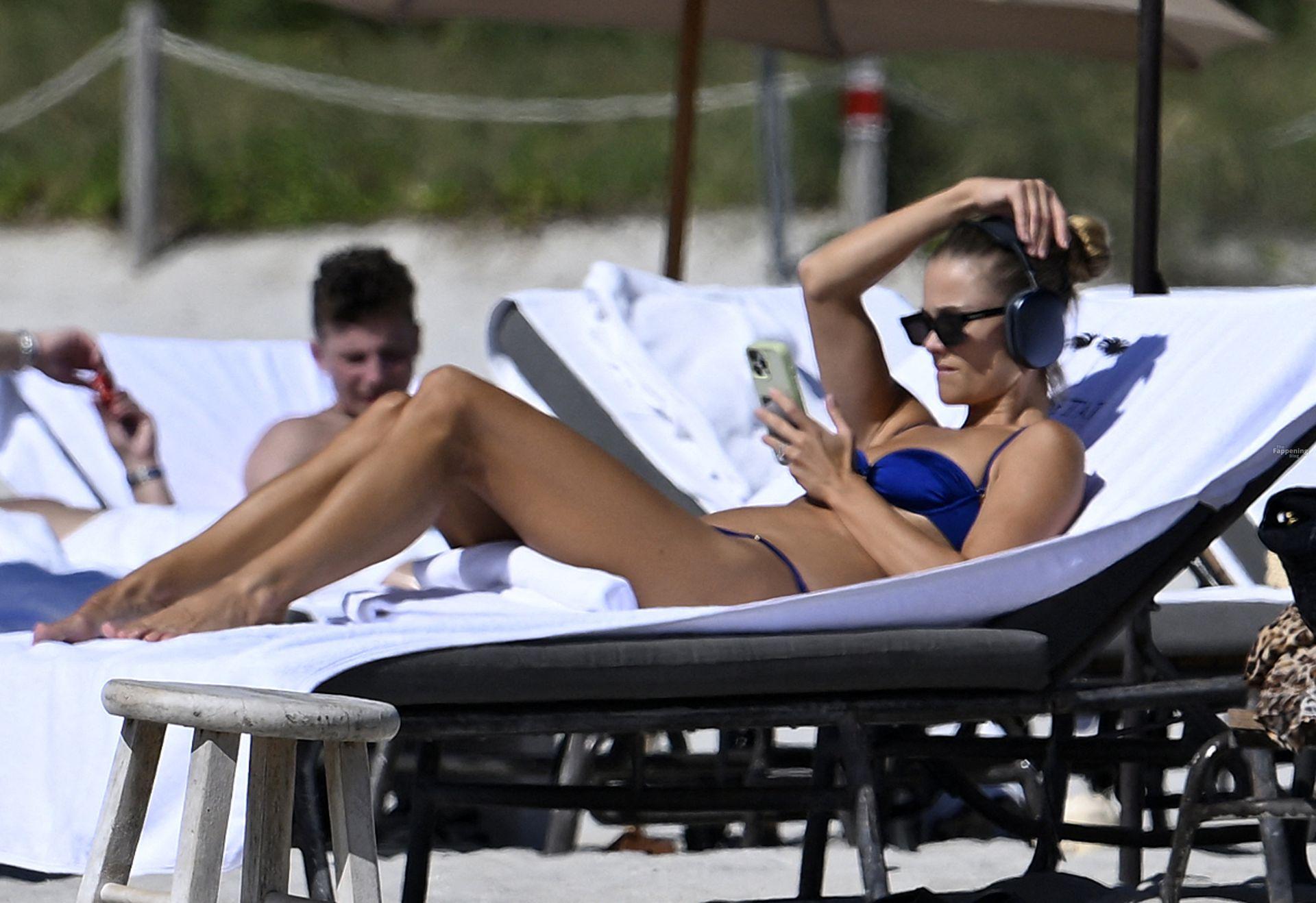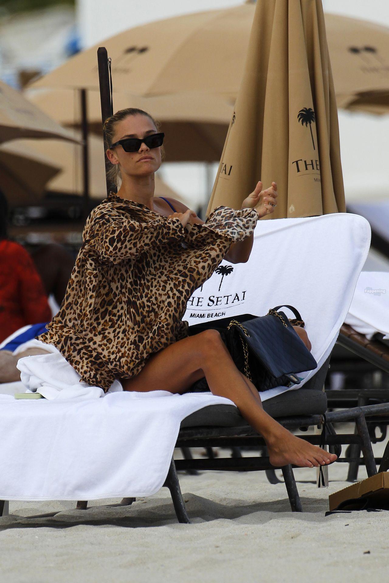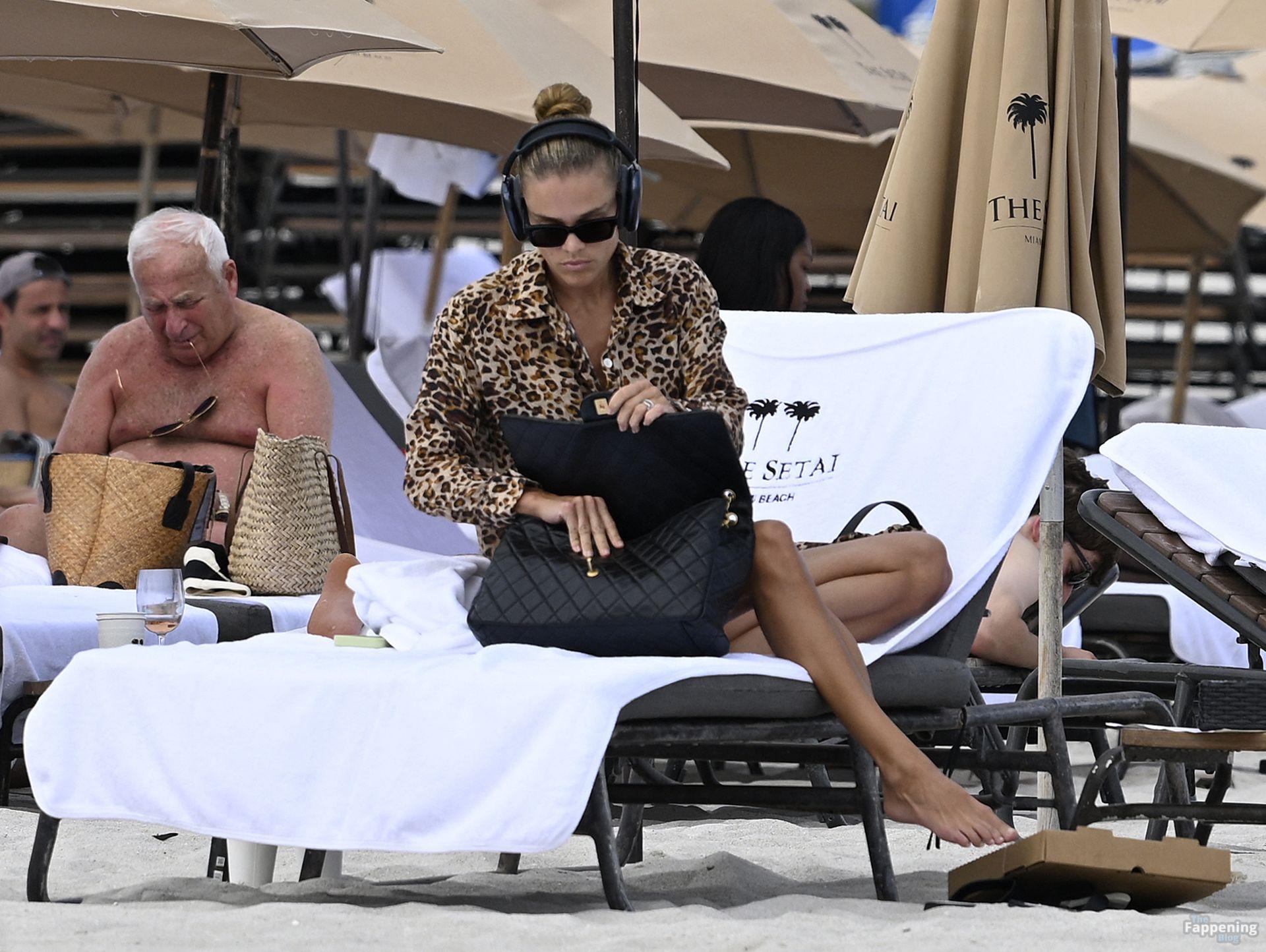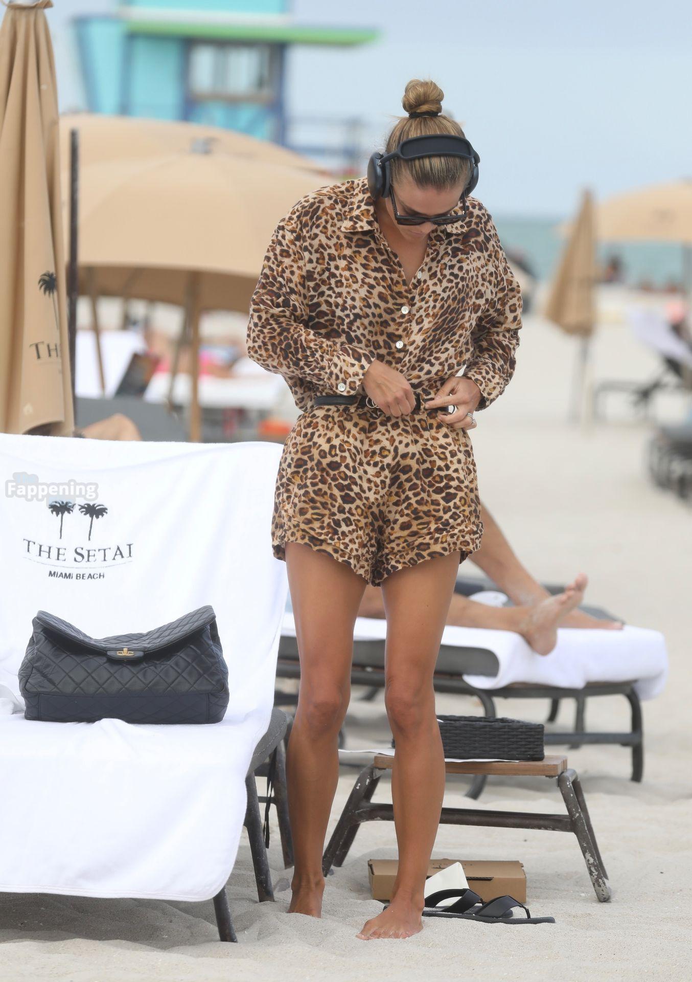 La modella danese Nina Agdal è stata vista mentre si godeva il sole a Miami Beach, indossando un bikini blu prima di cambiarsi in un elegante outfit con stampa leopardata.