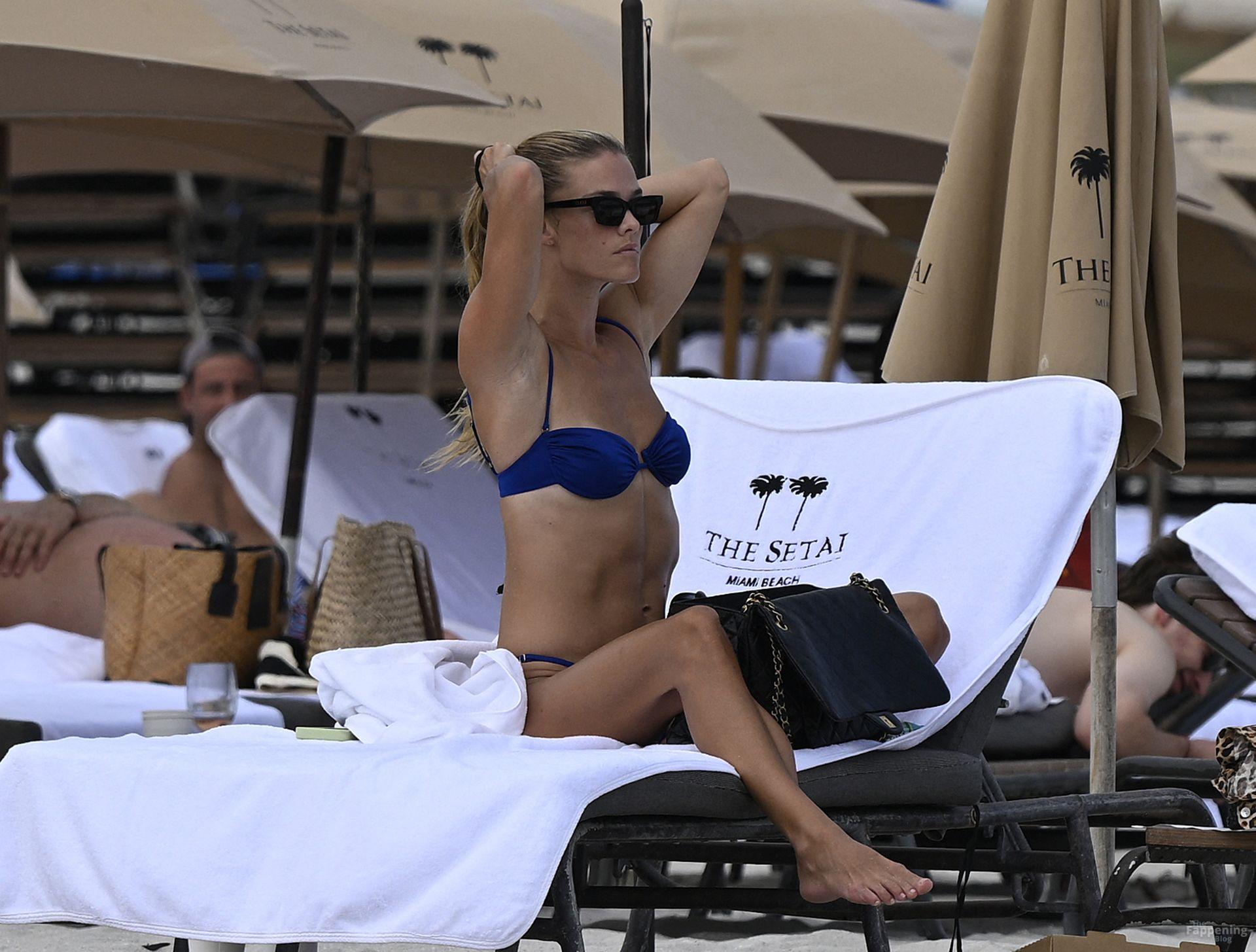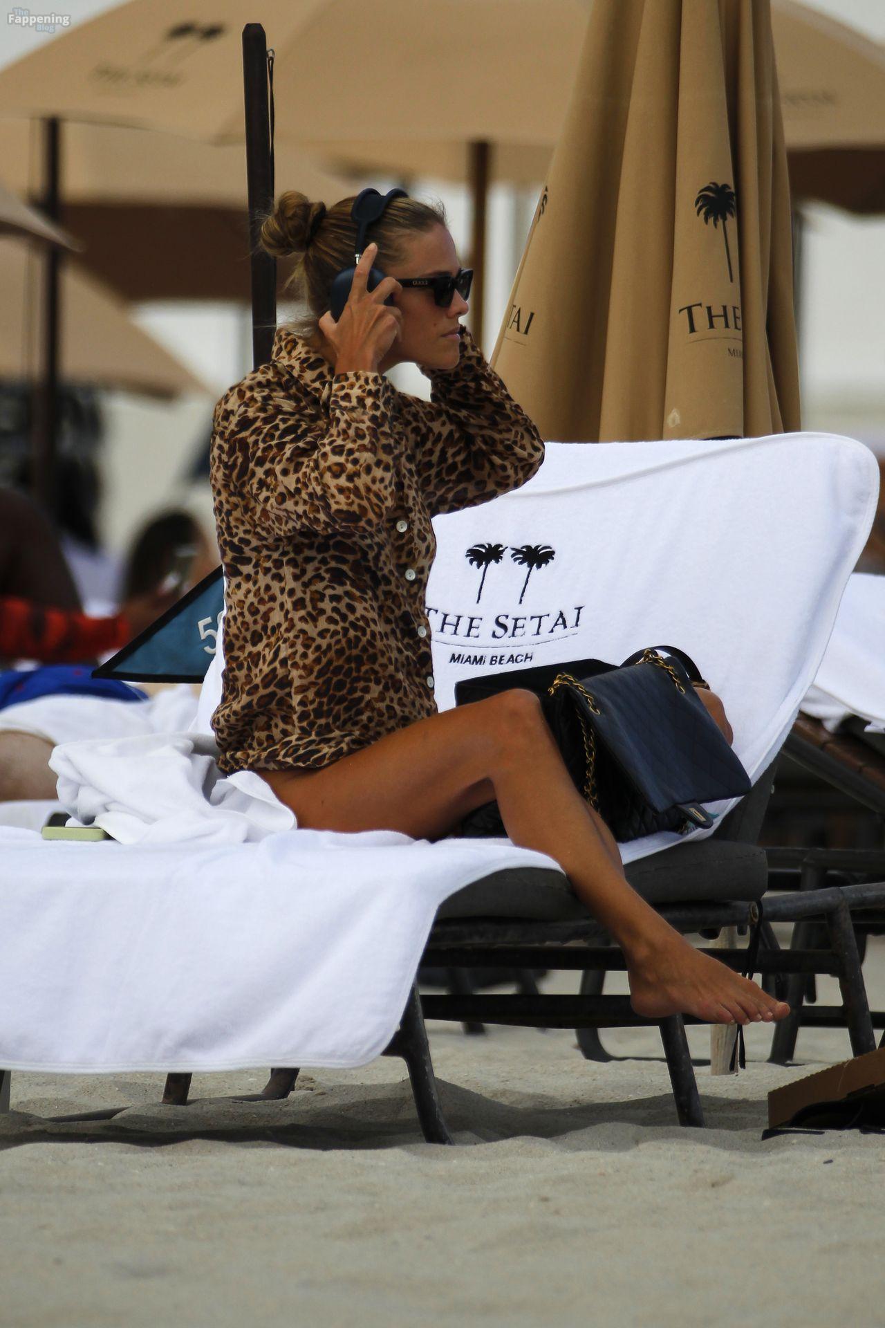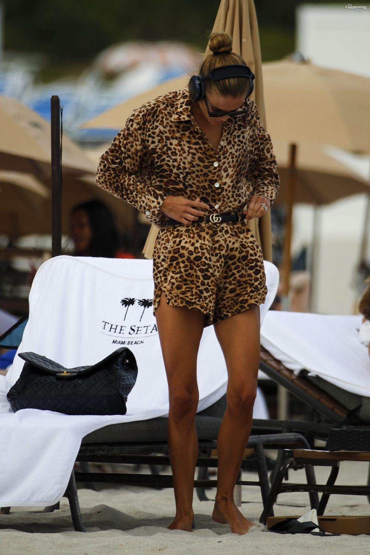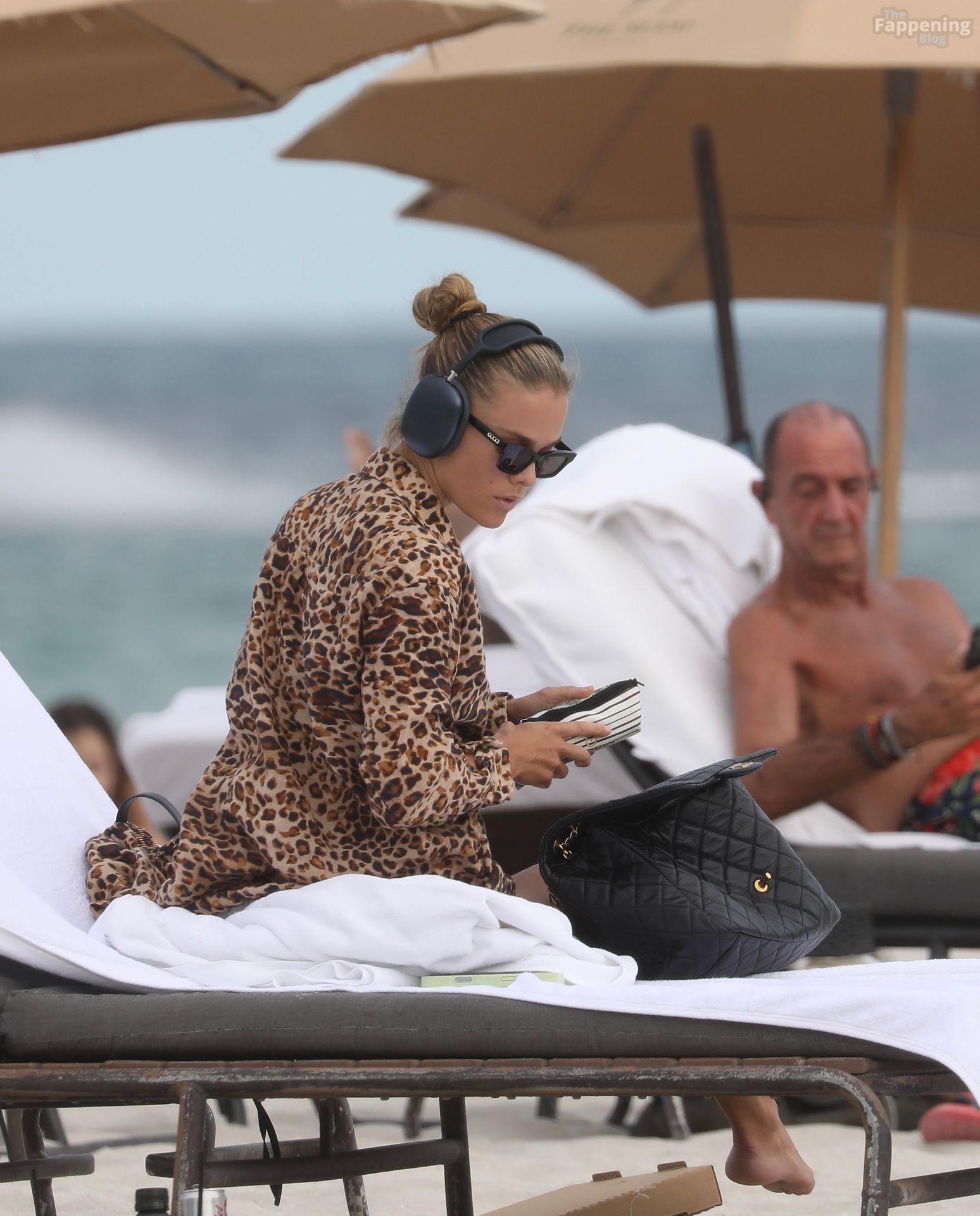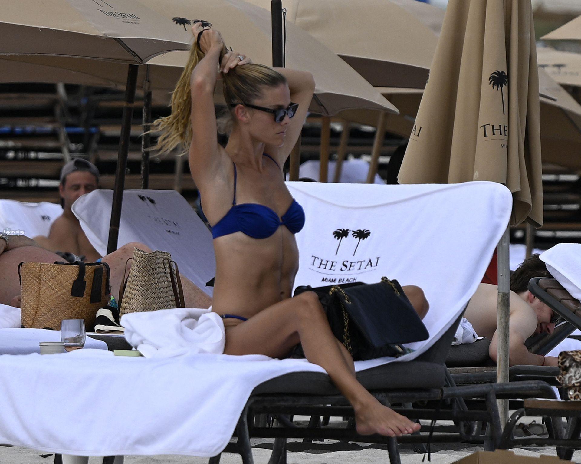 La modella danese Nina Agdal è stata vista mentre si godeva il sole a Miami Beach, indossando un bikini blu prima di cambiarsi in un elegante outfit con stampa leopardata.
