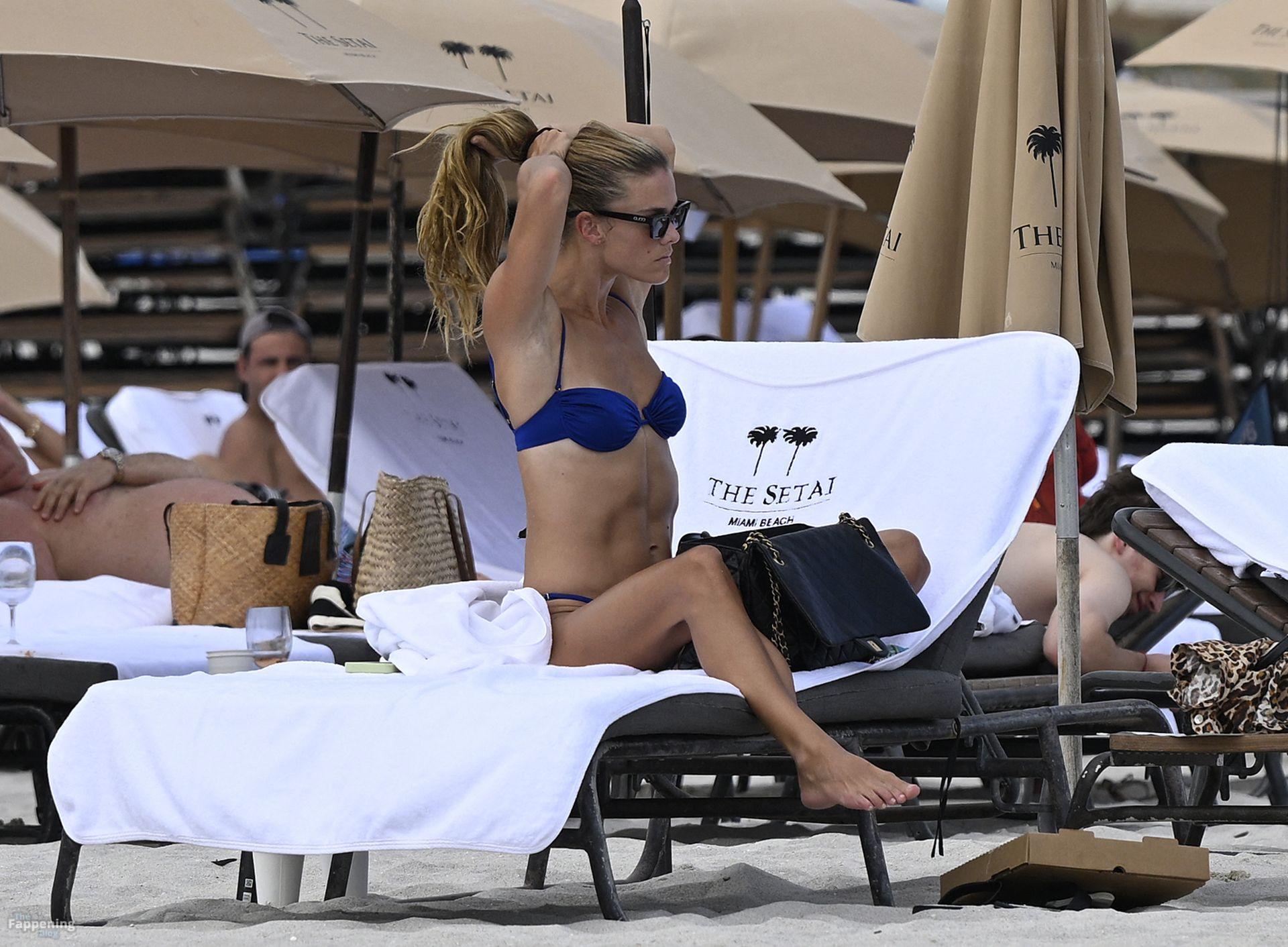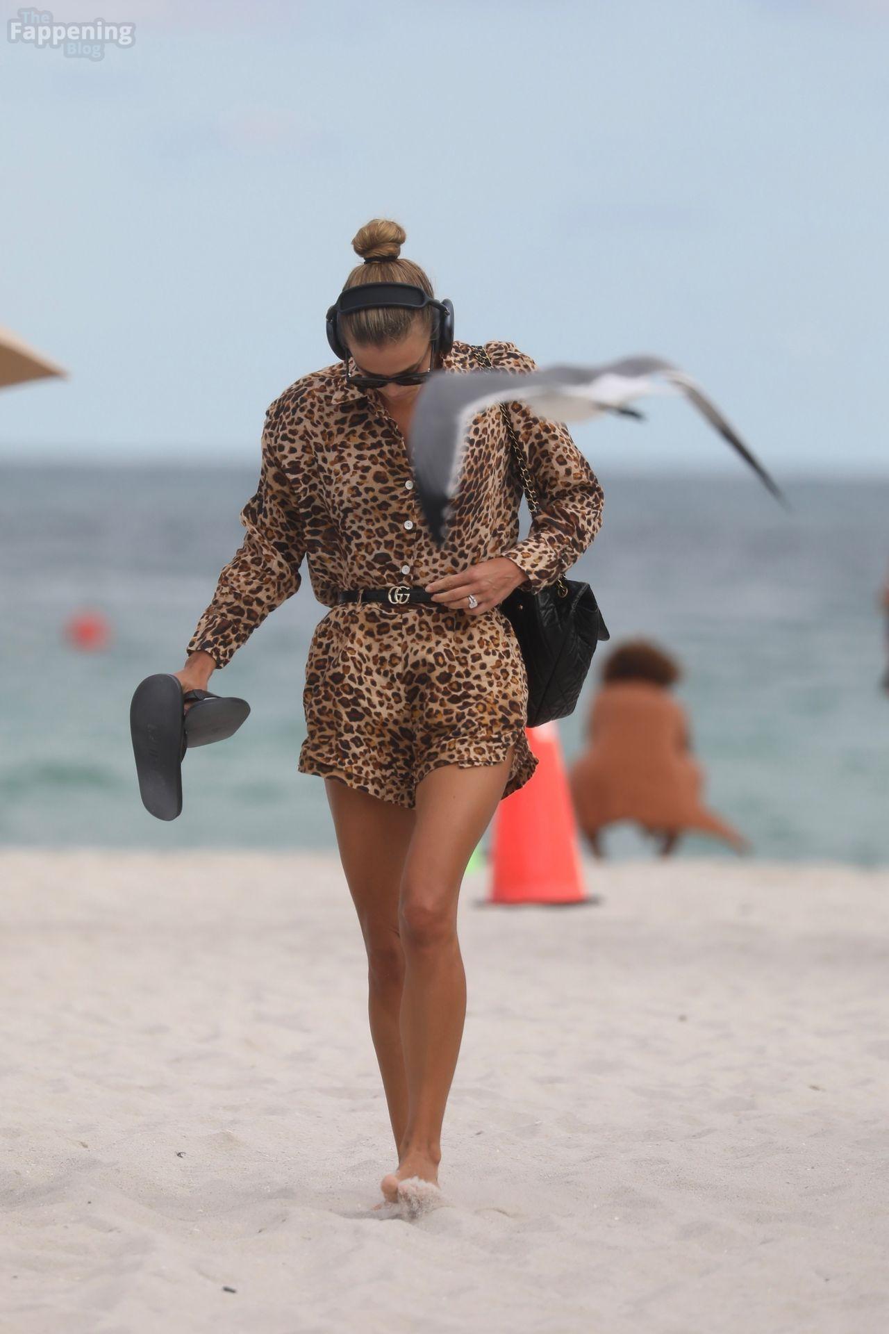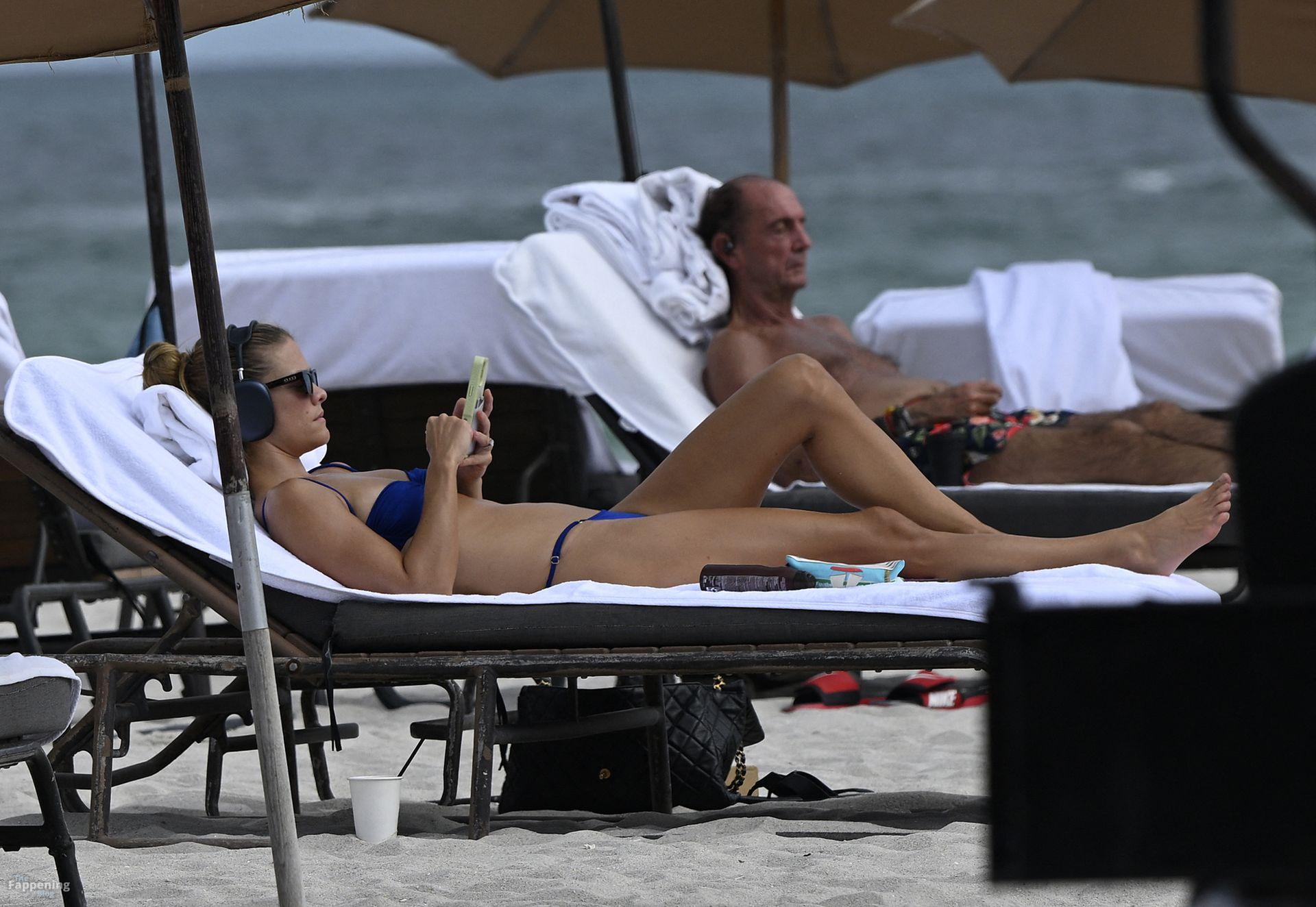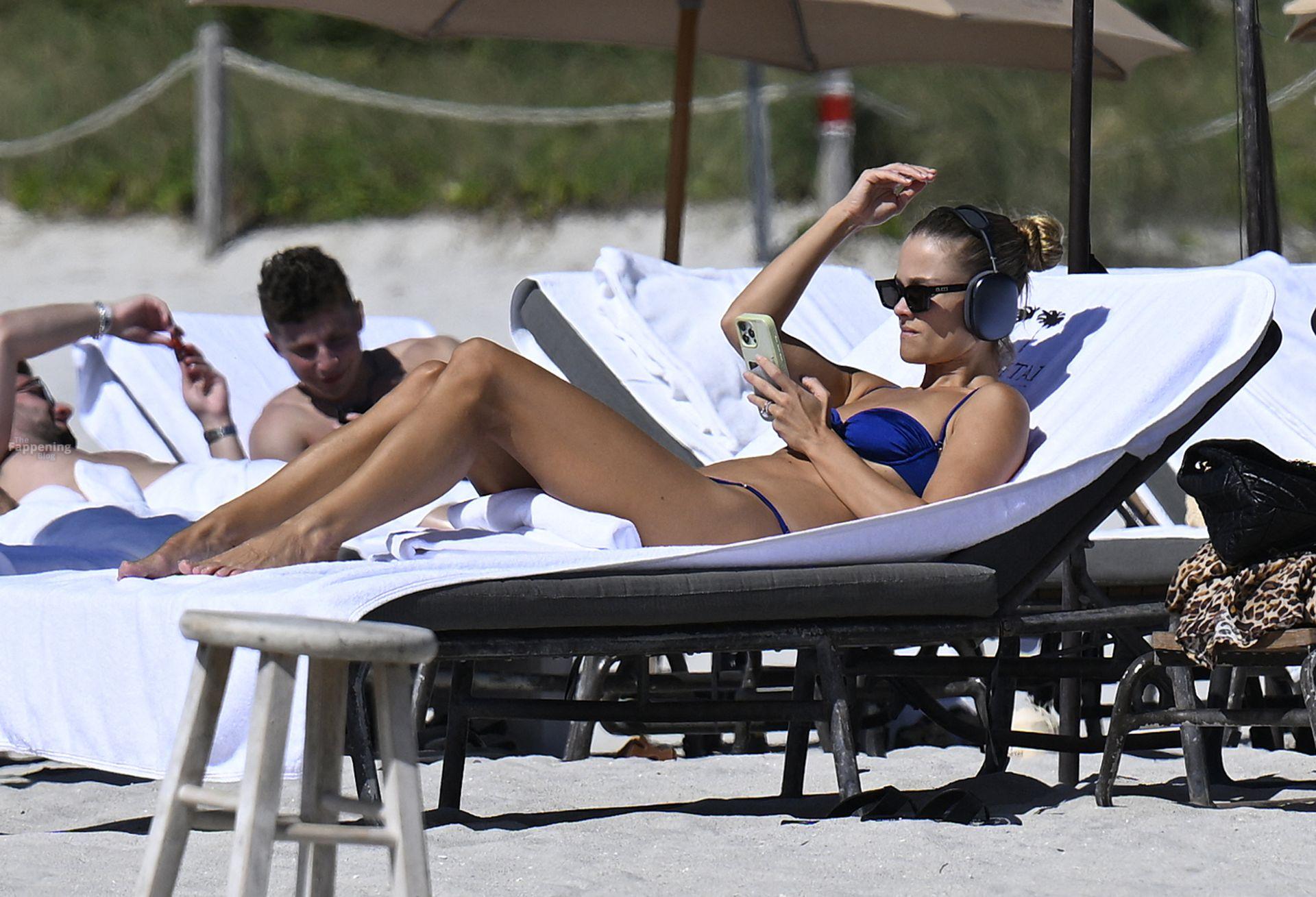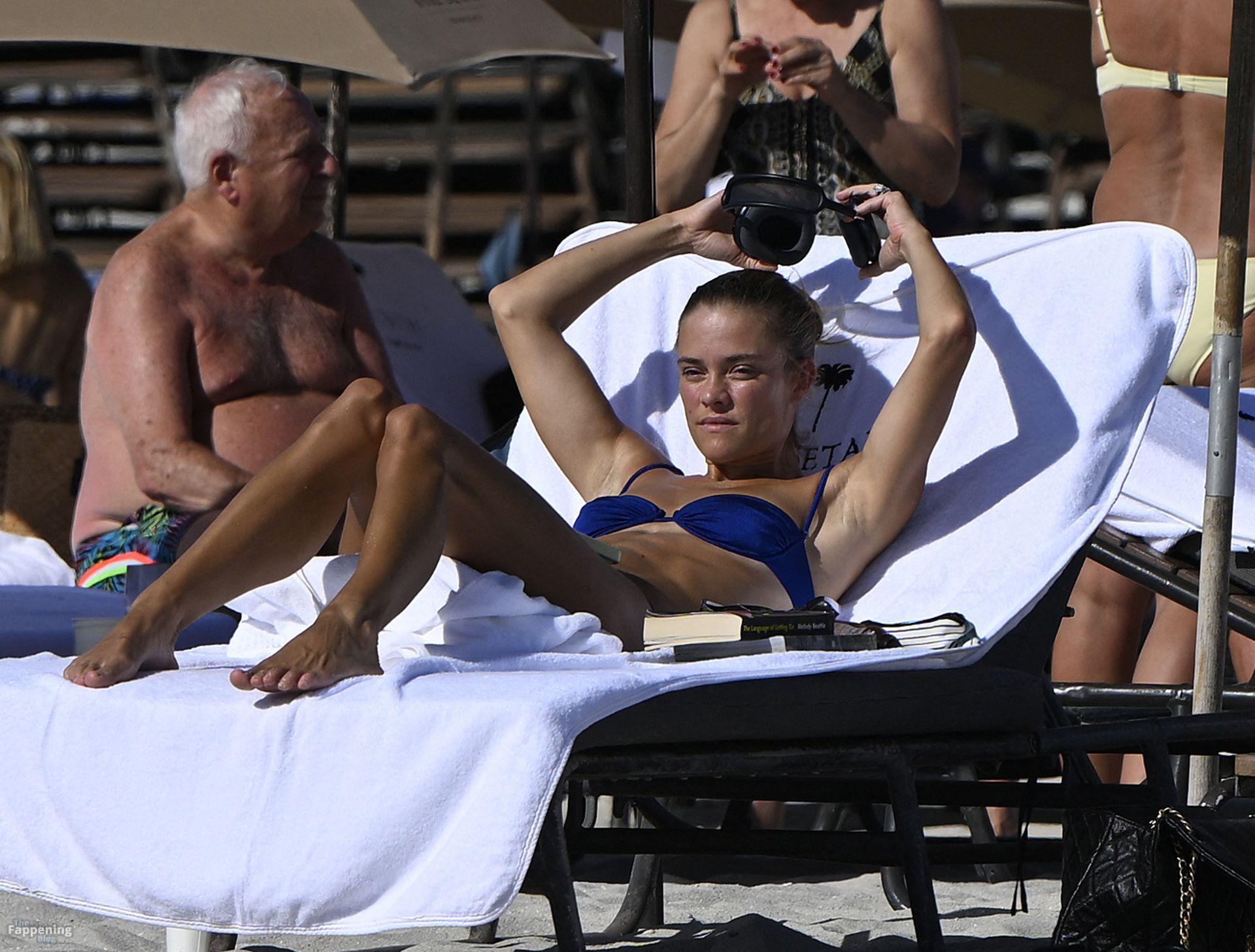 La modella danese Nina Agdal è stata vista mentre si godeva il sole a Miami Beach, indossando un bikini blu prima di cambiarsi in un elegante outfit con stampa leopardata.