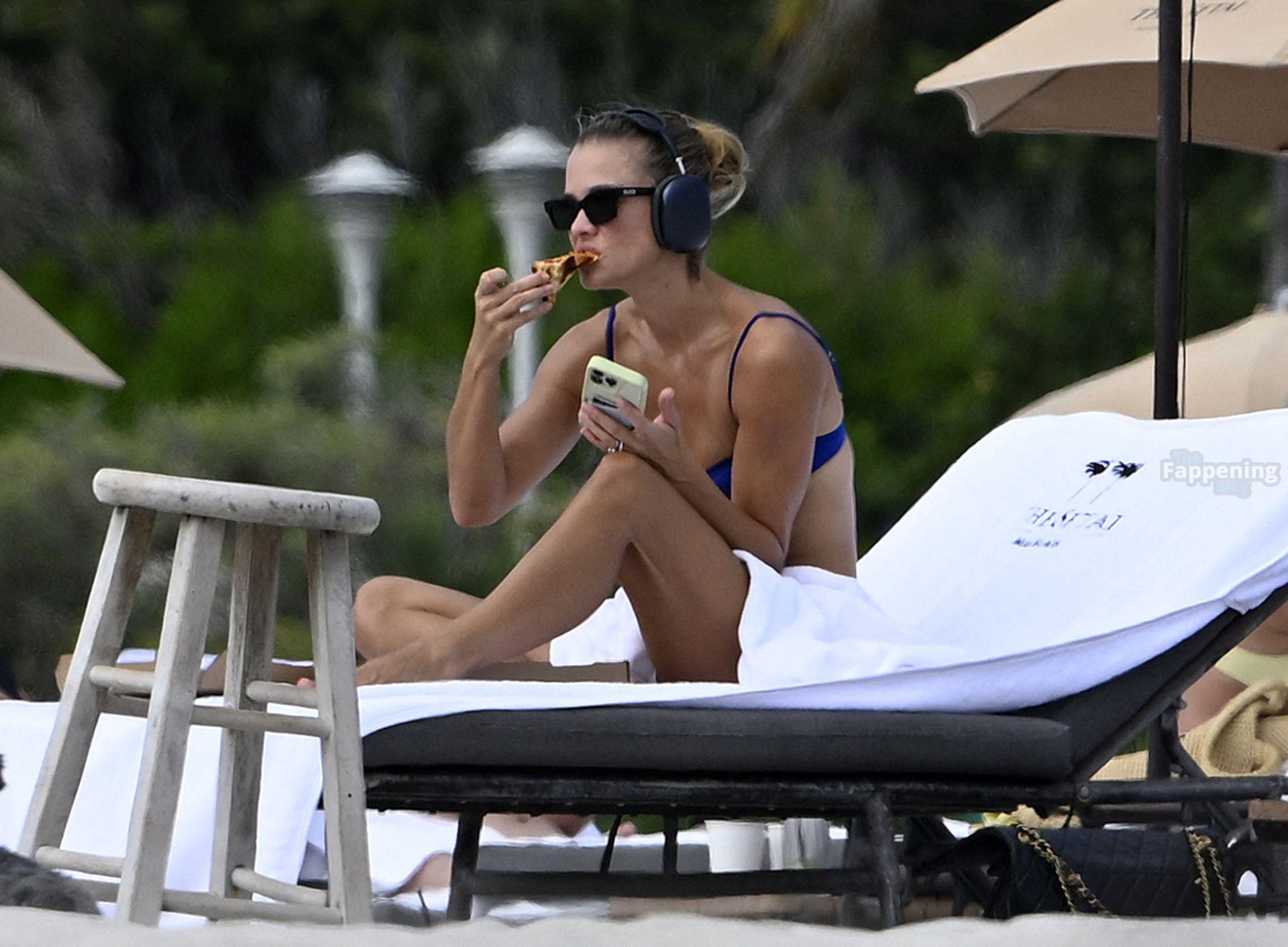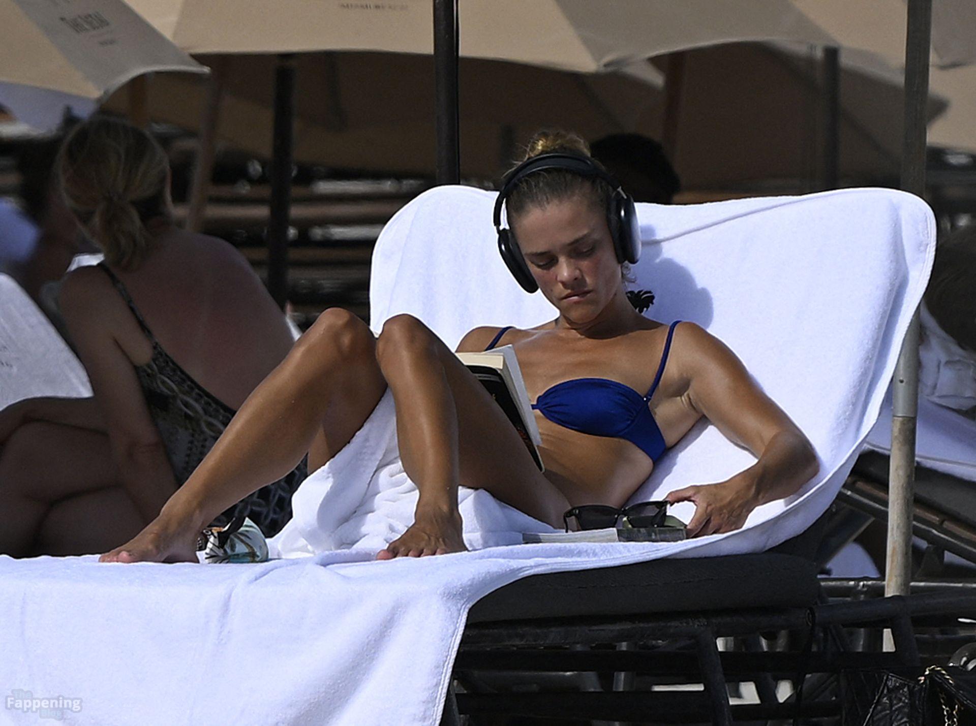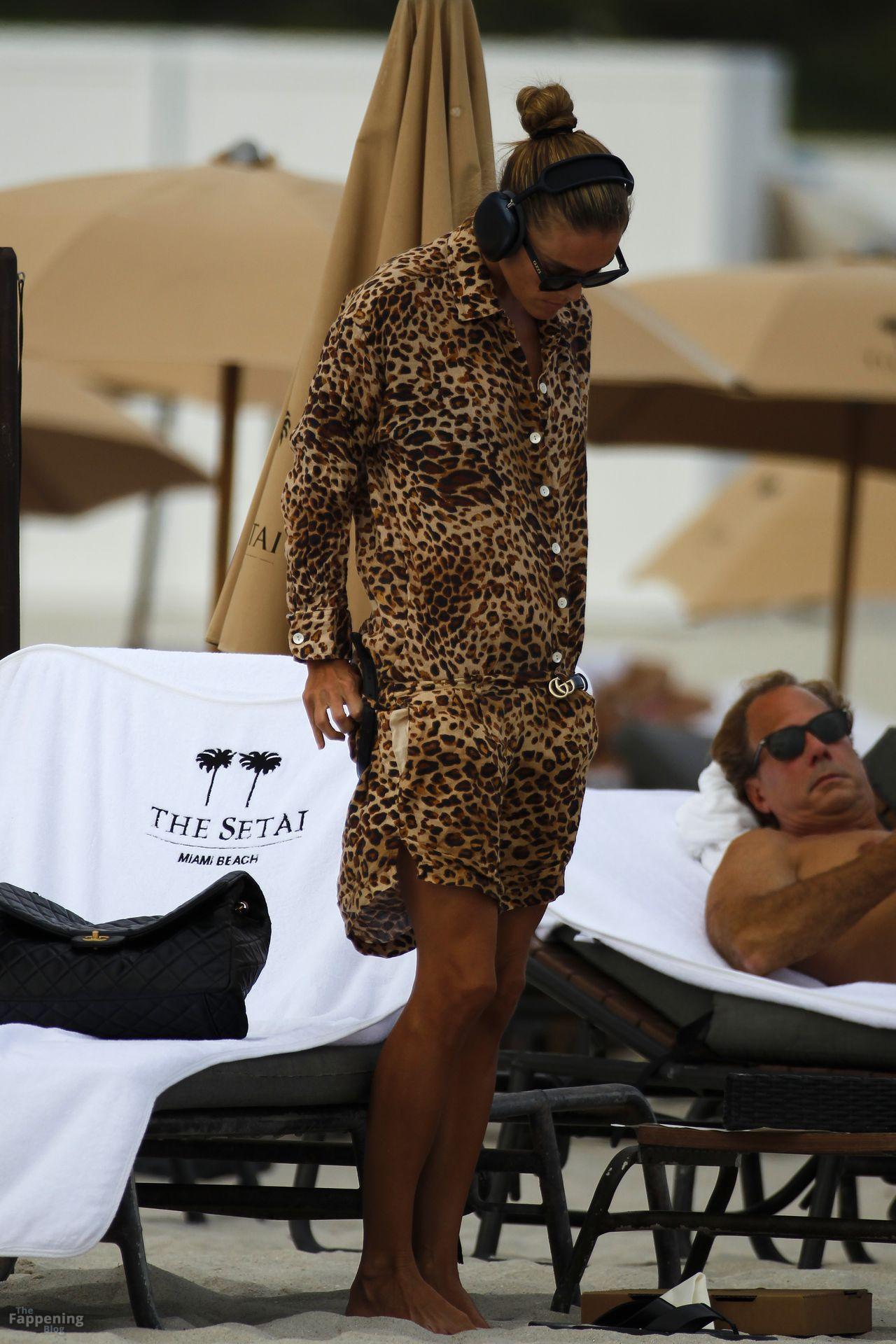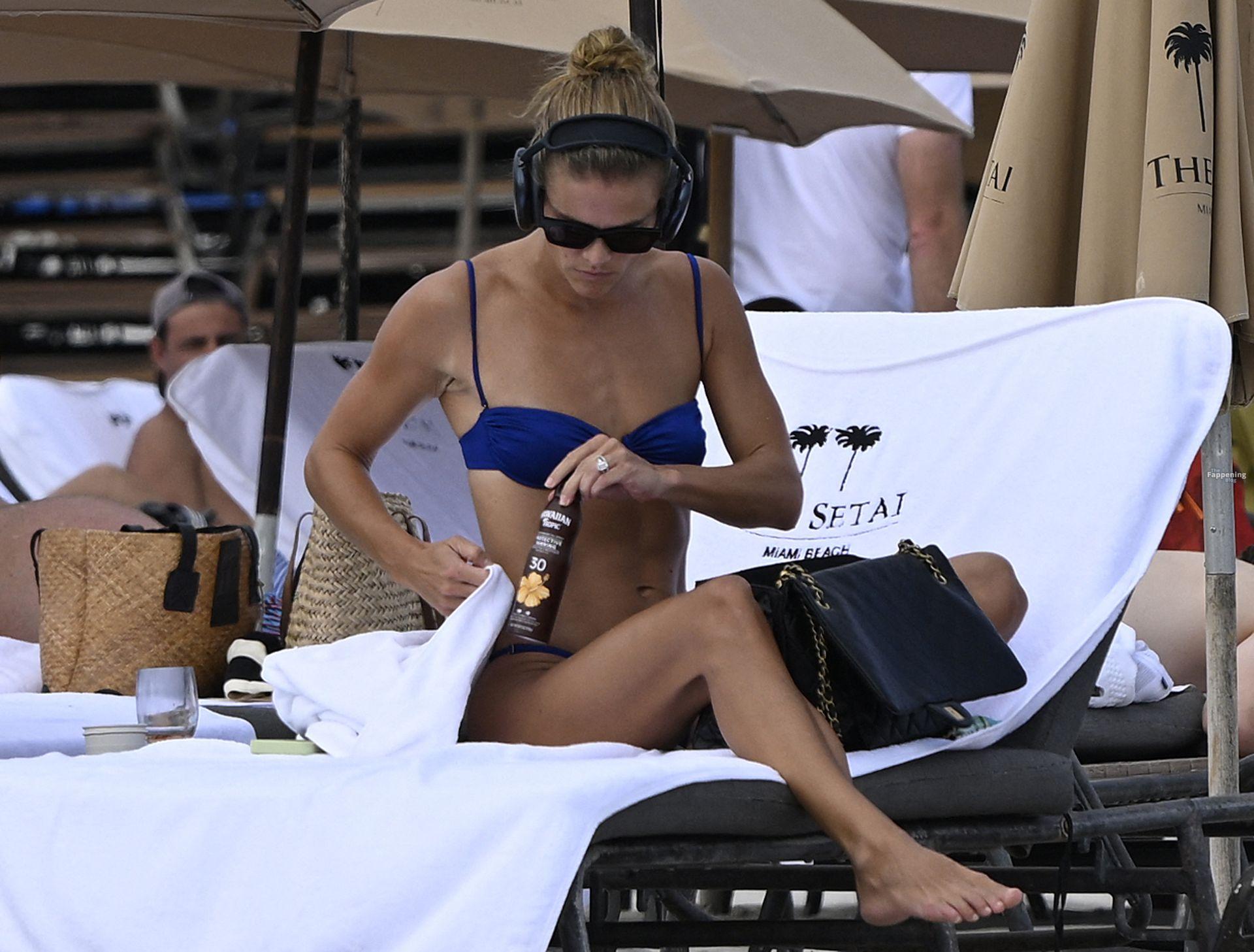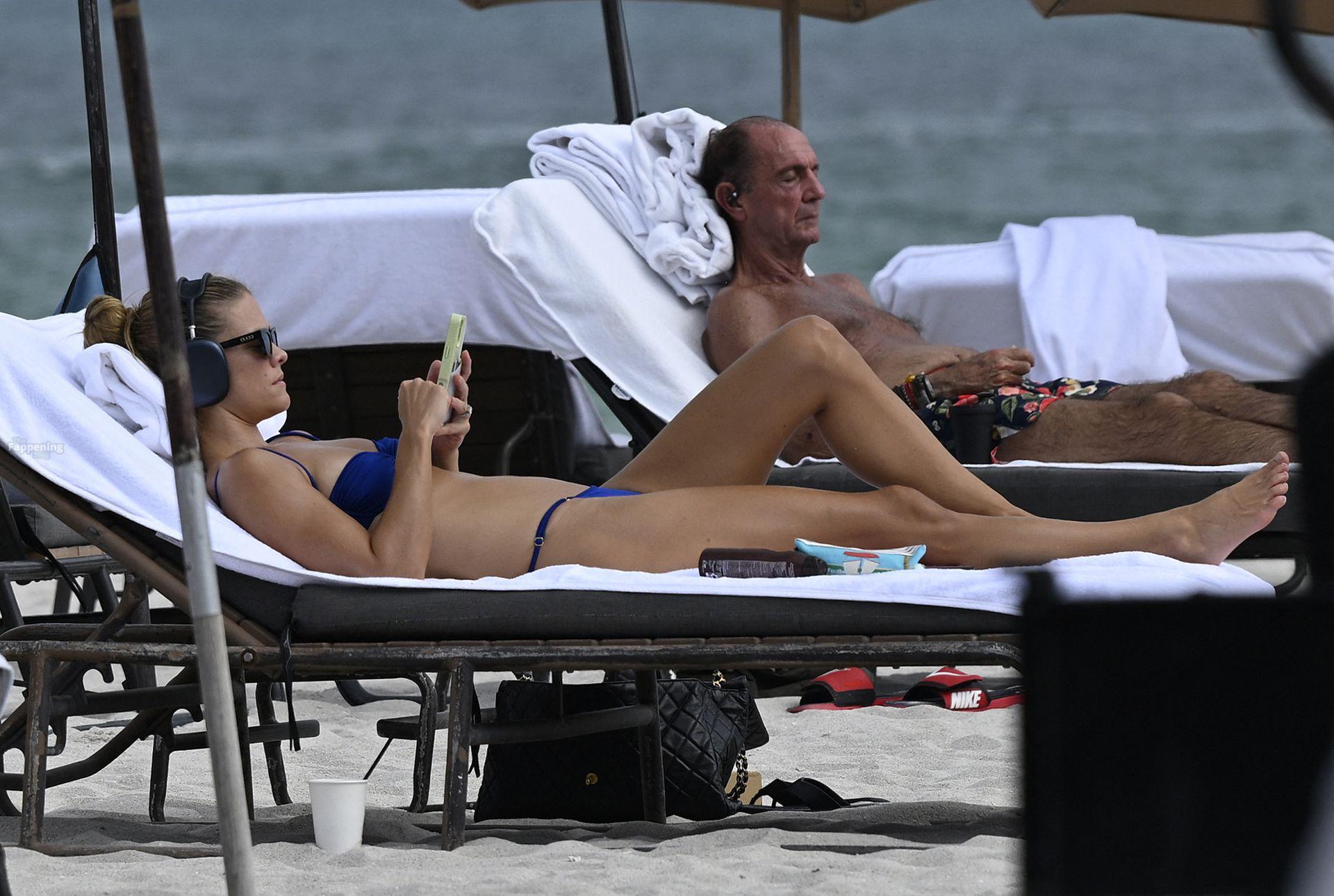 La modella danese Nina Agdal è stata vista mentre si godeva il sole a Miami Beach, indossando un bikini blu prima di cambiarsi in un elegante outfit con stampa leopardata.