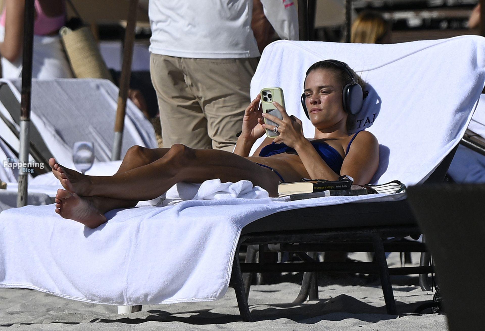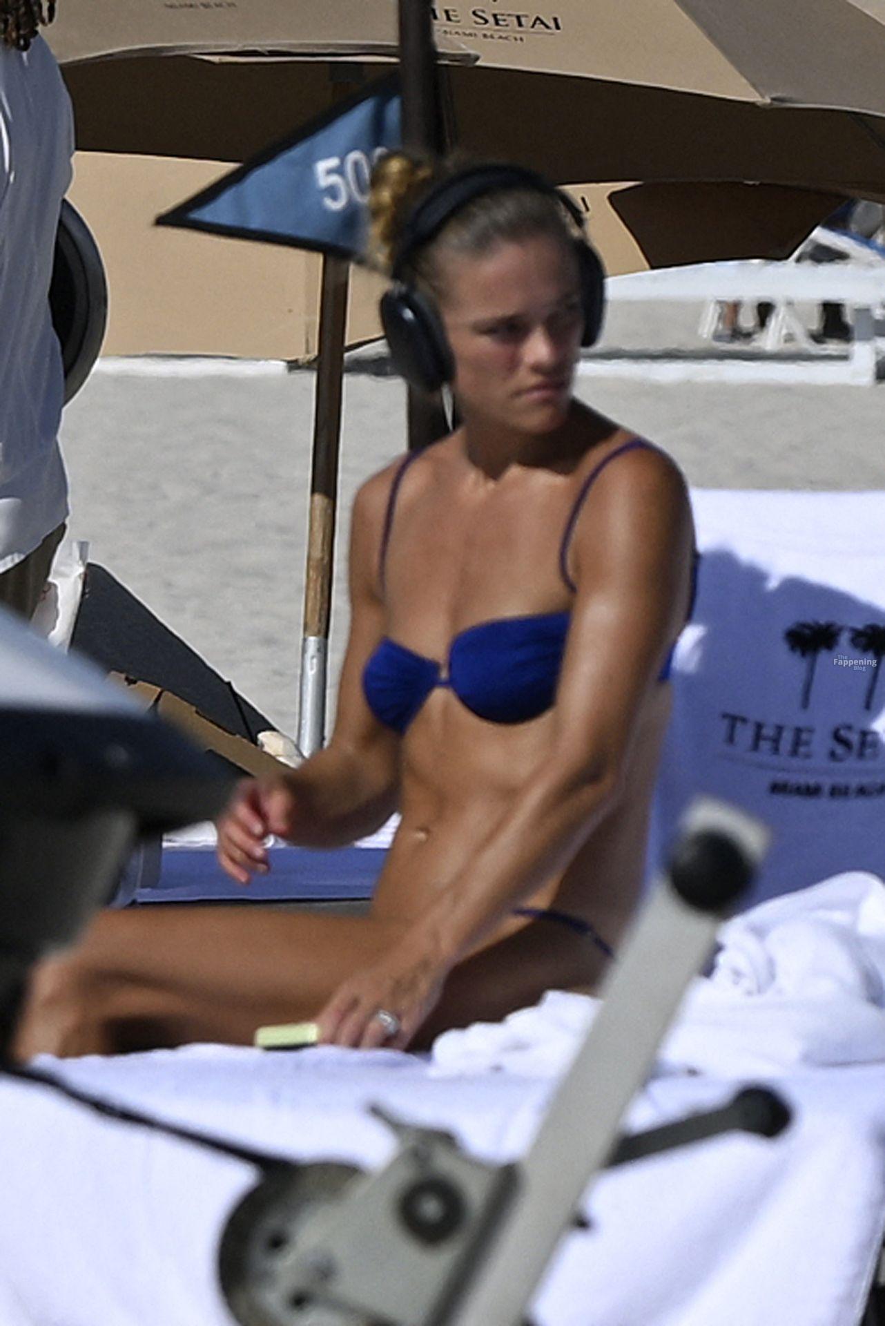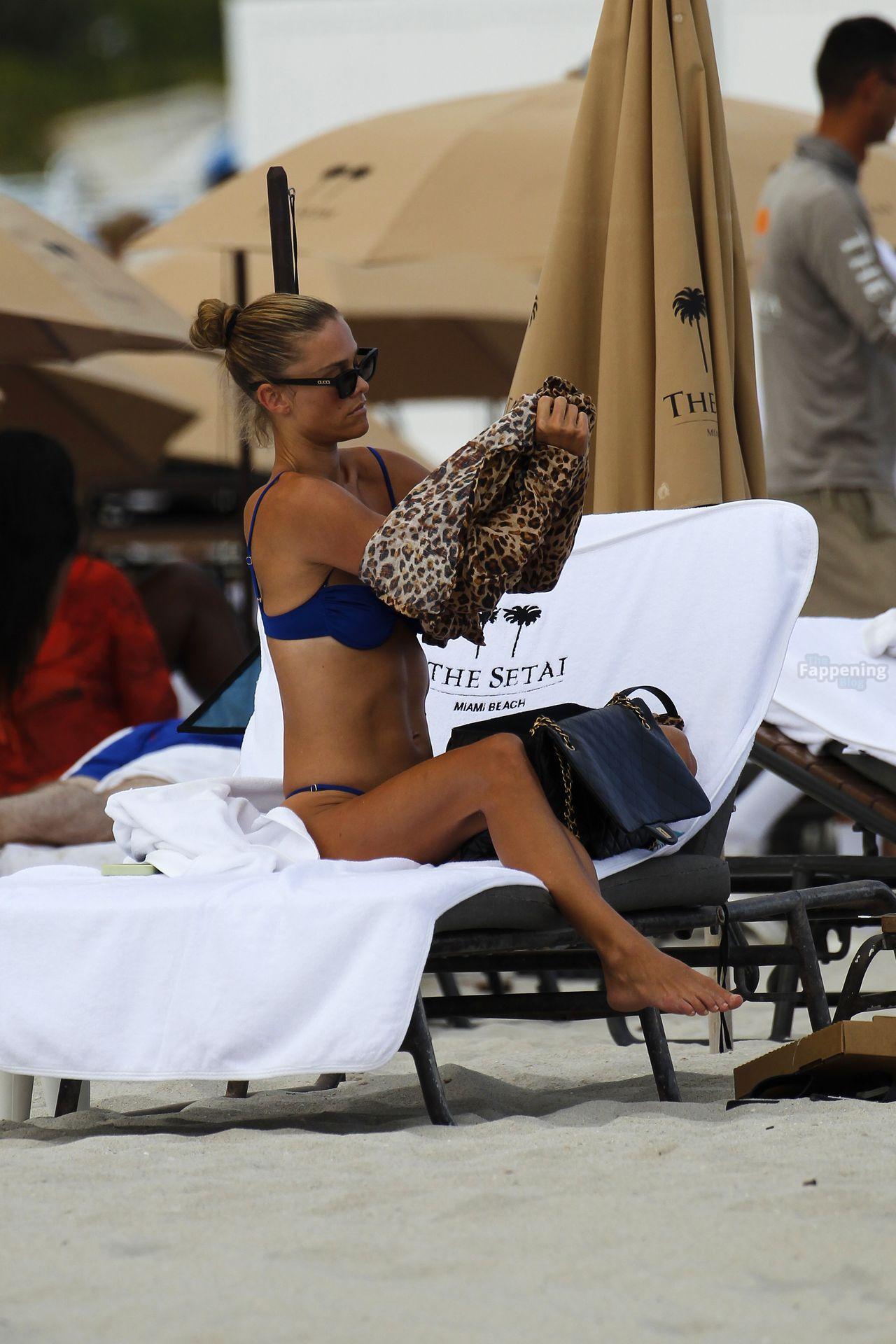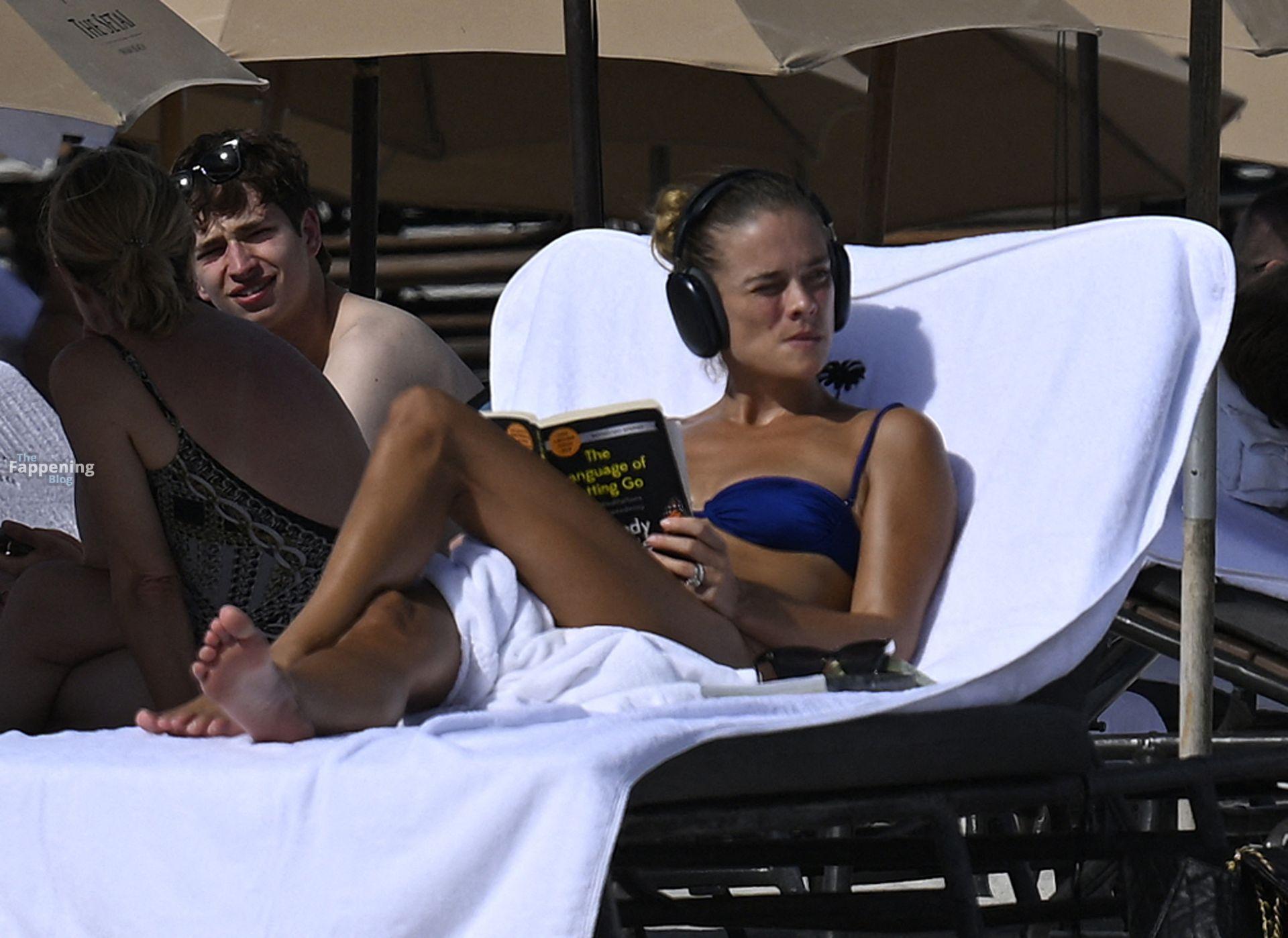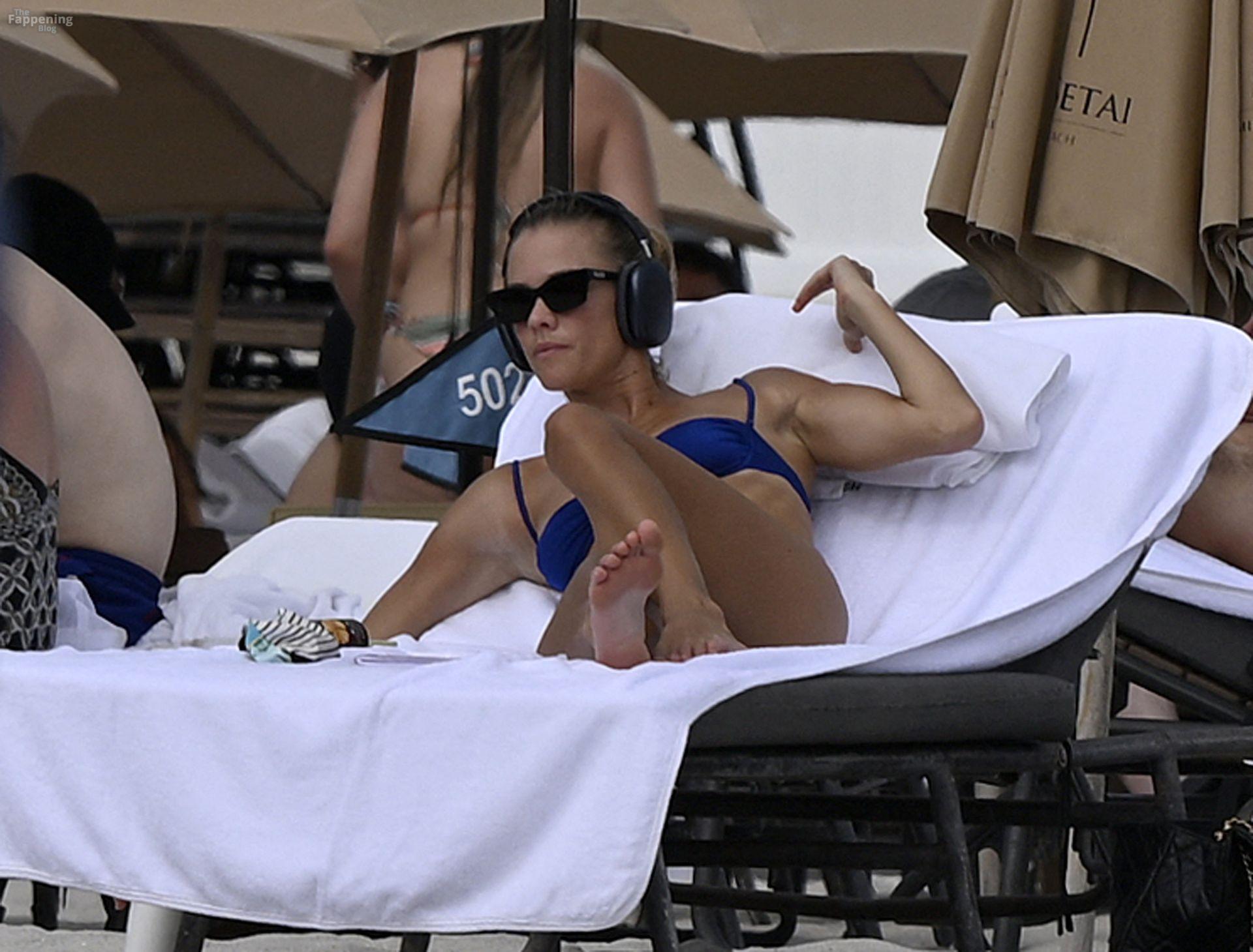 La modella danese Nina Agdal è stata vista mentre si godeva il sole a Miami Beach, indossando un bikini blu prima di cambiarsi in un elegante outfit con stampa leopardata.