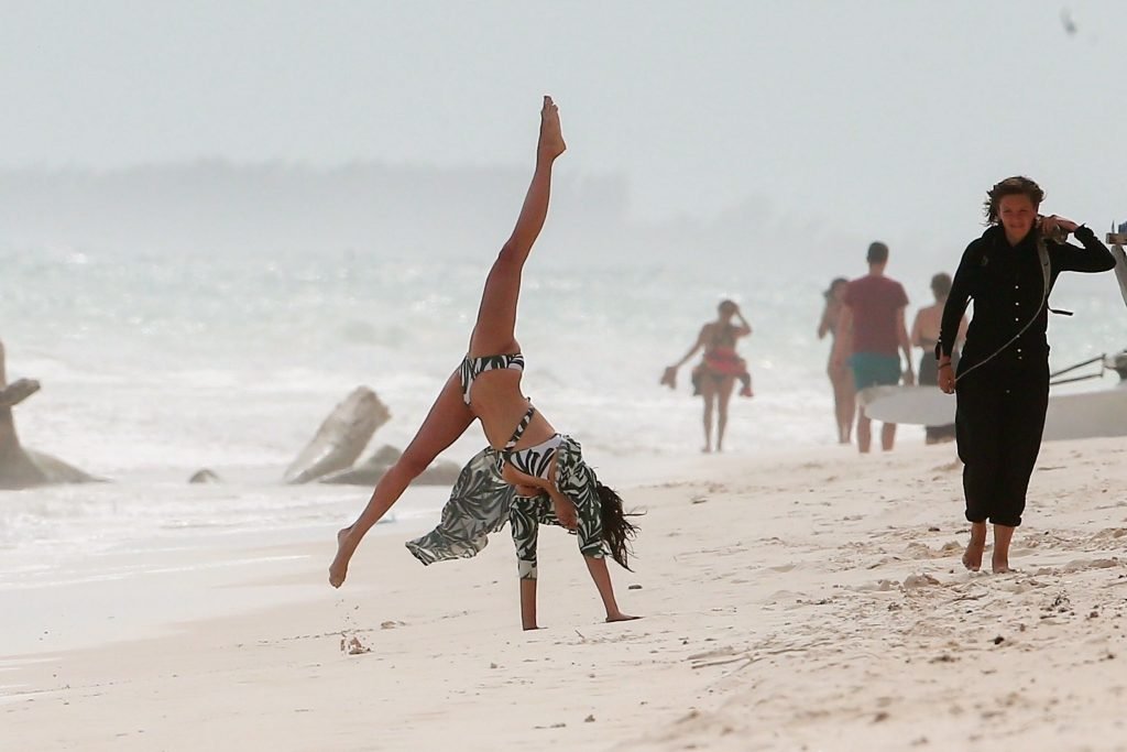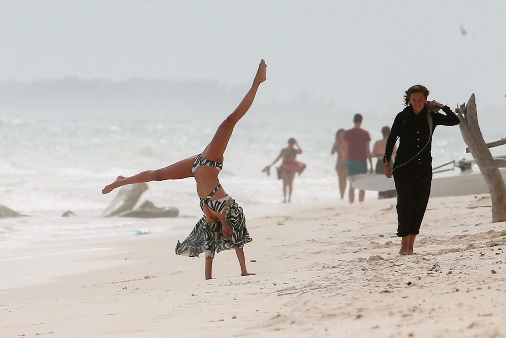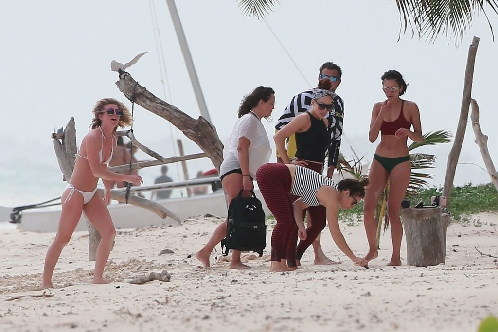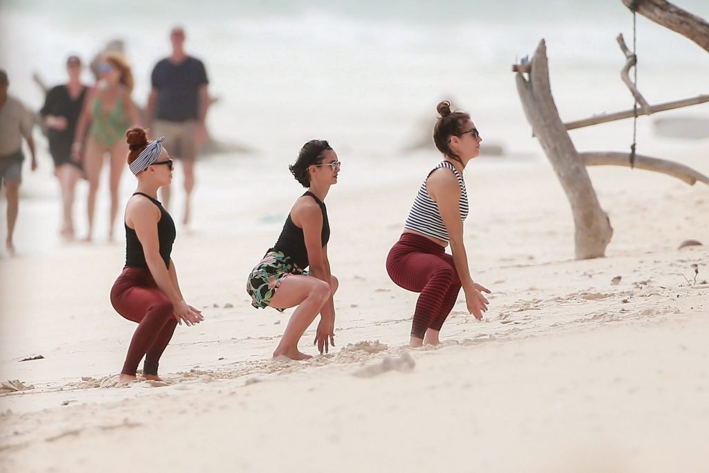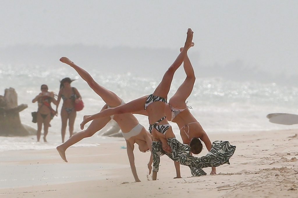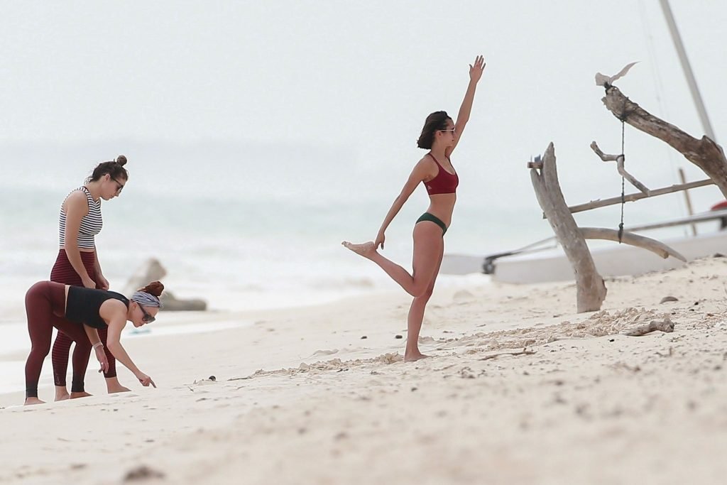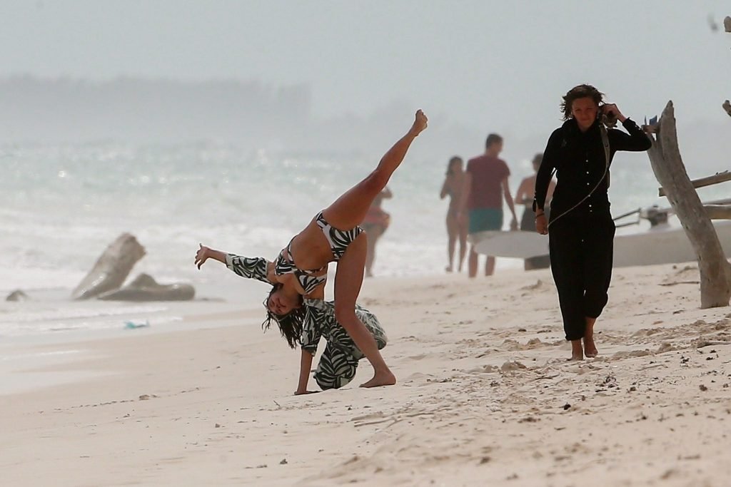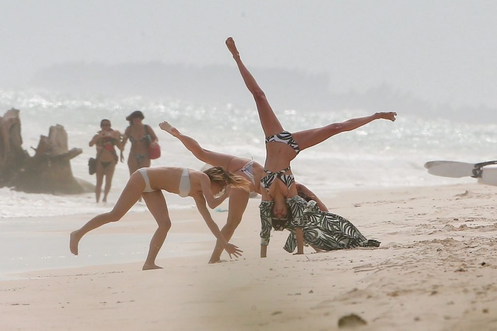 L’attrice bulgaro-canadese fa yoga e capriole sulla spiaggia in compagnia della sua famiglia, degli amici e di Kayla Ewell.