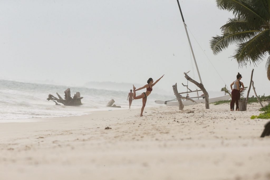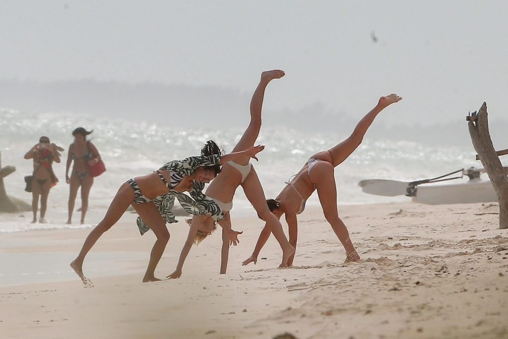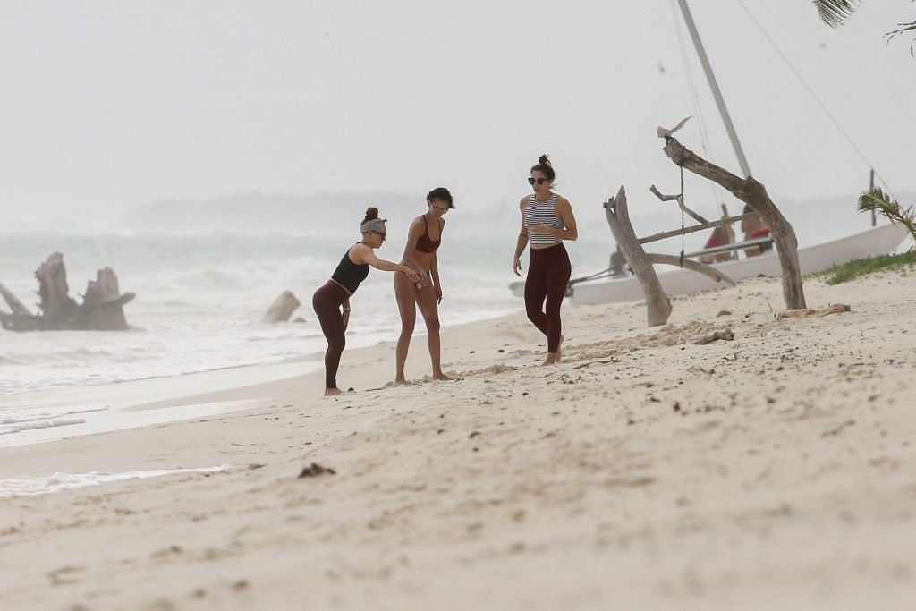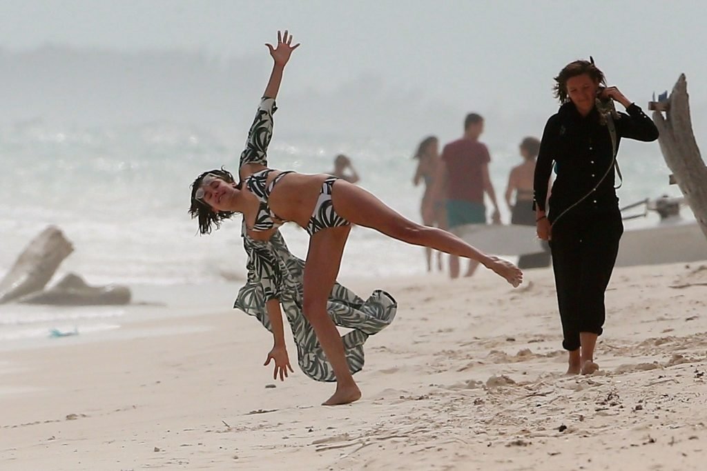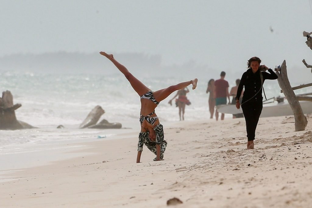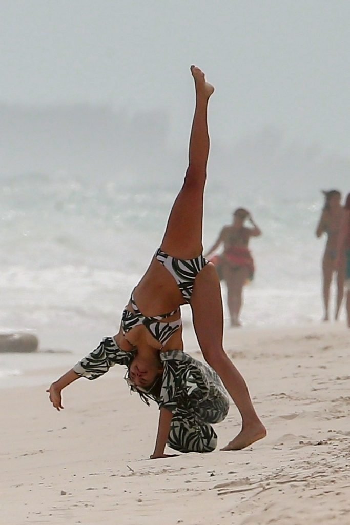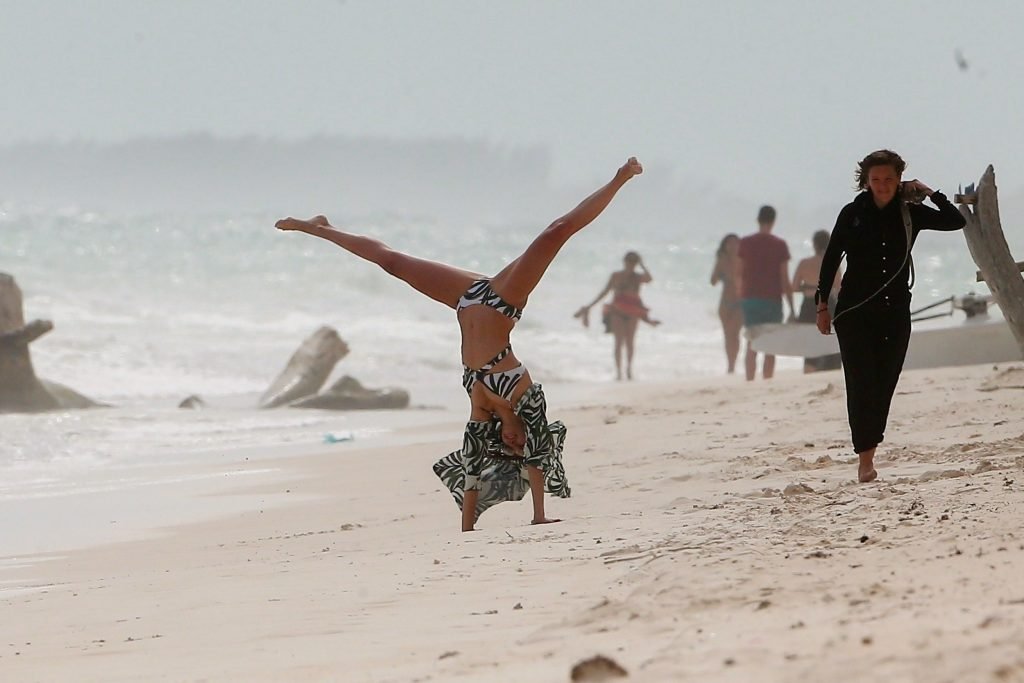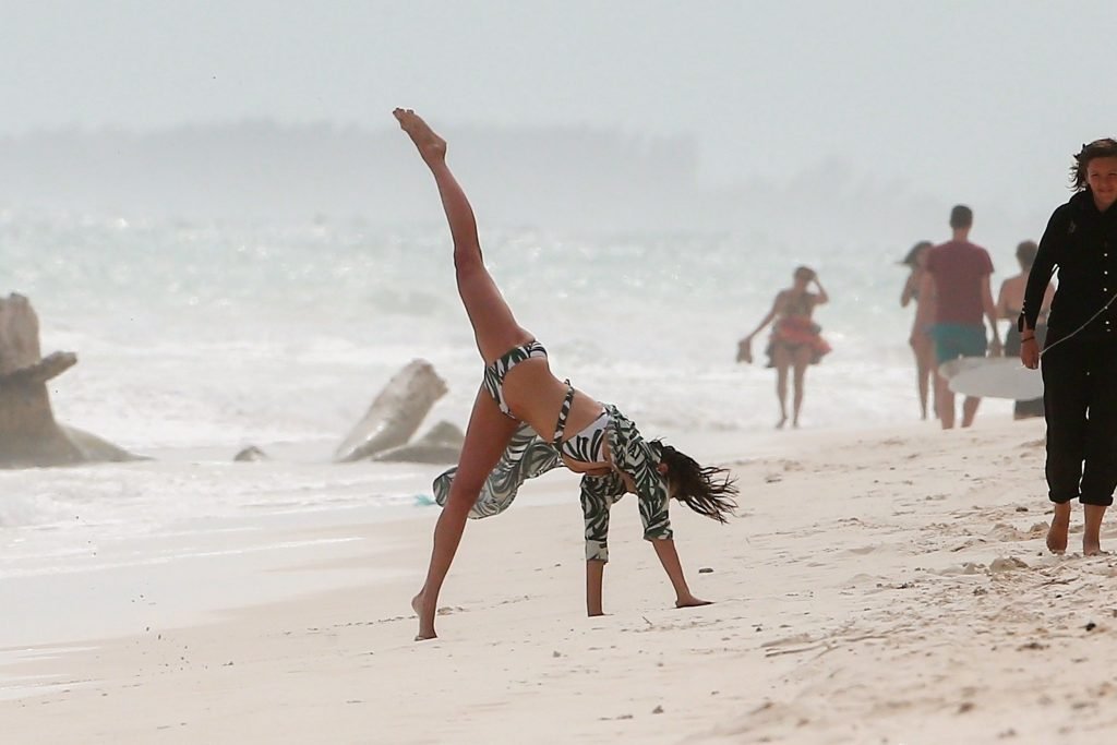 L’attrice bulgaro-canadese fa yoga e capriole sulla spiaggia in compagnia della sua famiglia, degli amici e di Kayla Ewell.