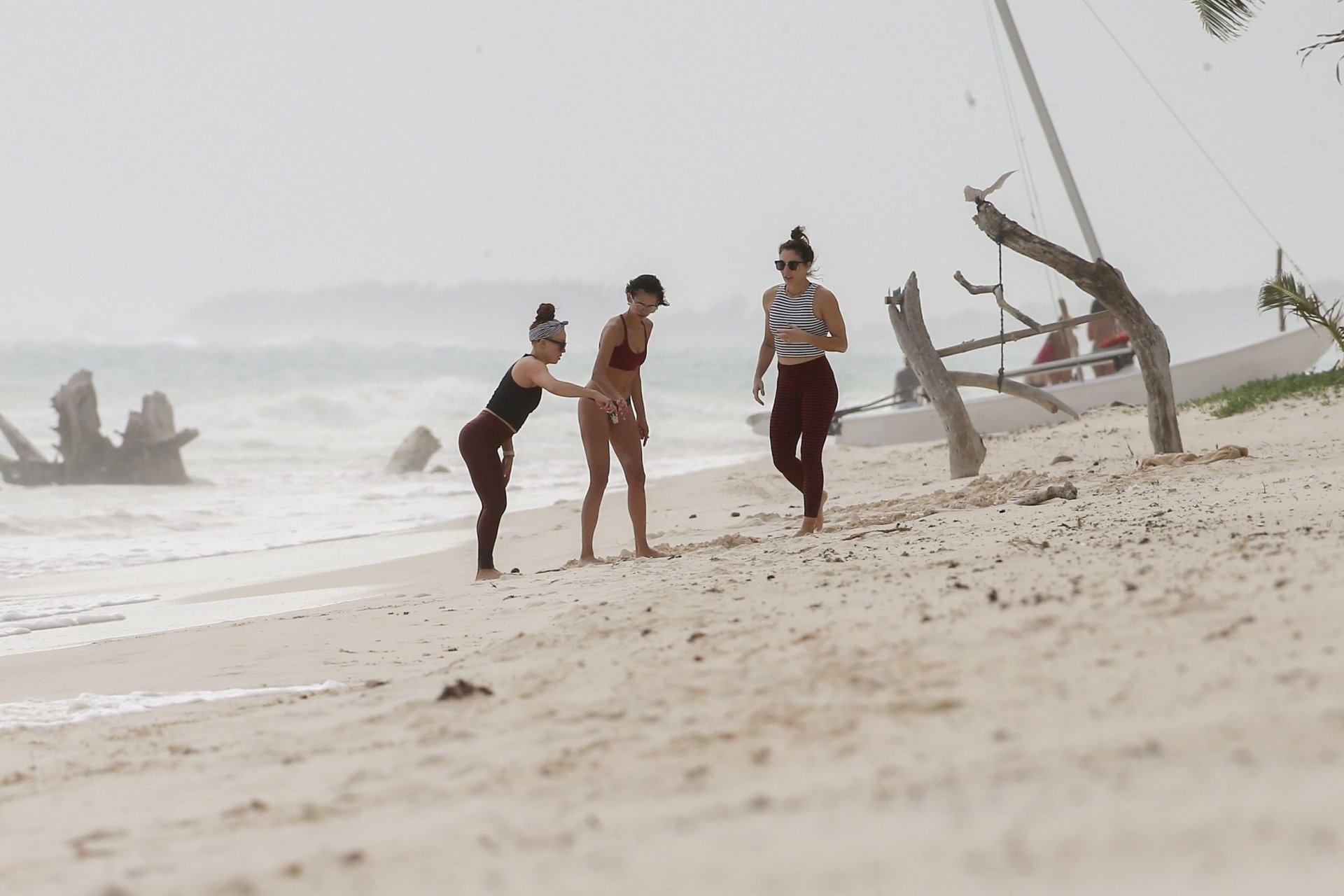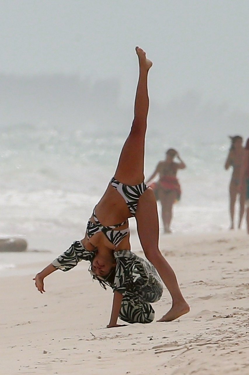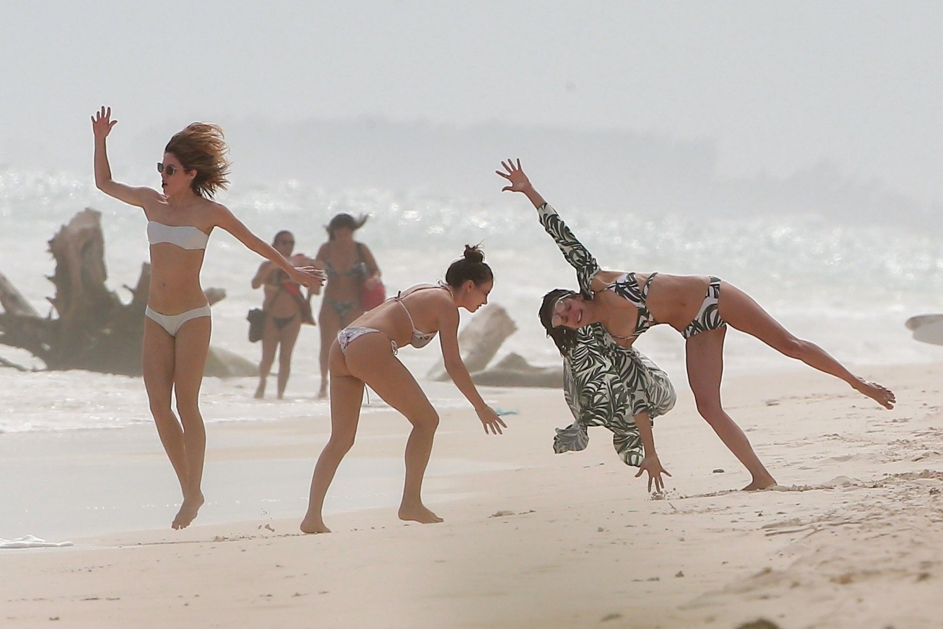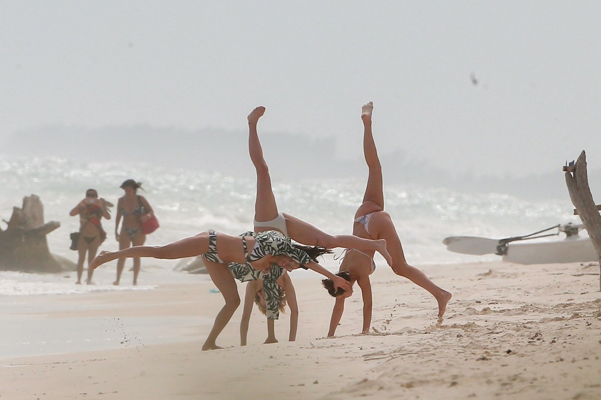 L’attrice bulgaro-canadese fa yoga e capriole sulla spiaggia in compagnia della sua famiglia, degli amici e di Kayla Ewell.