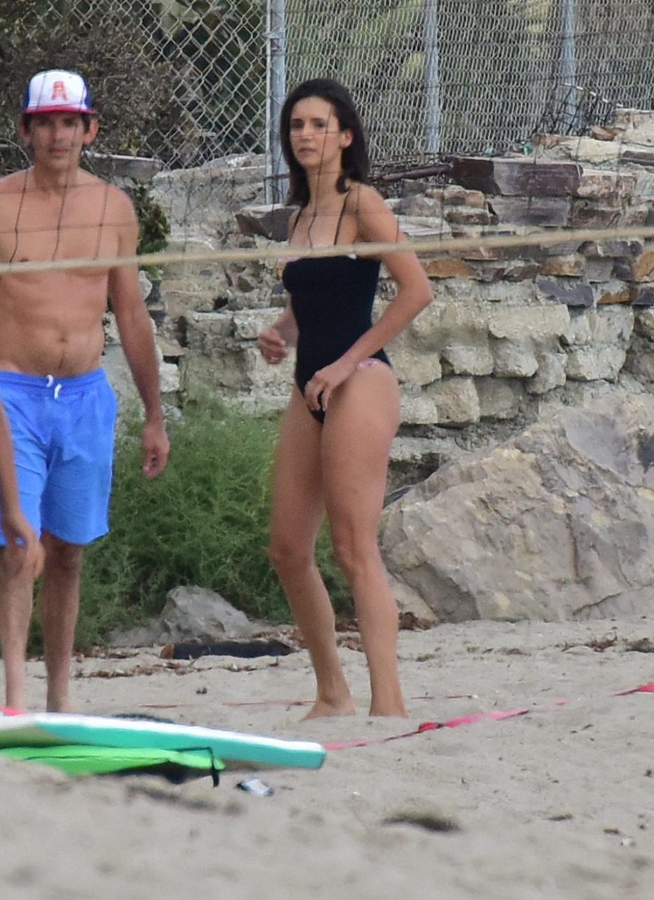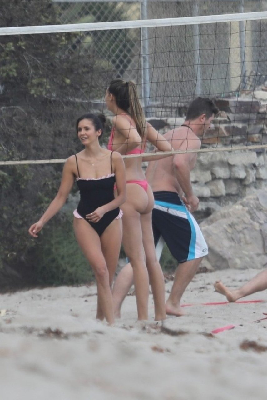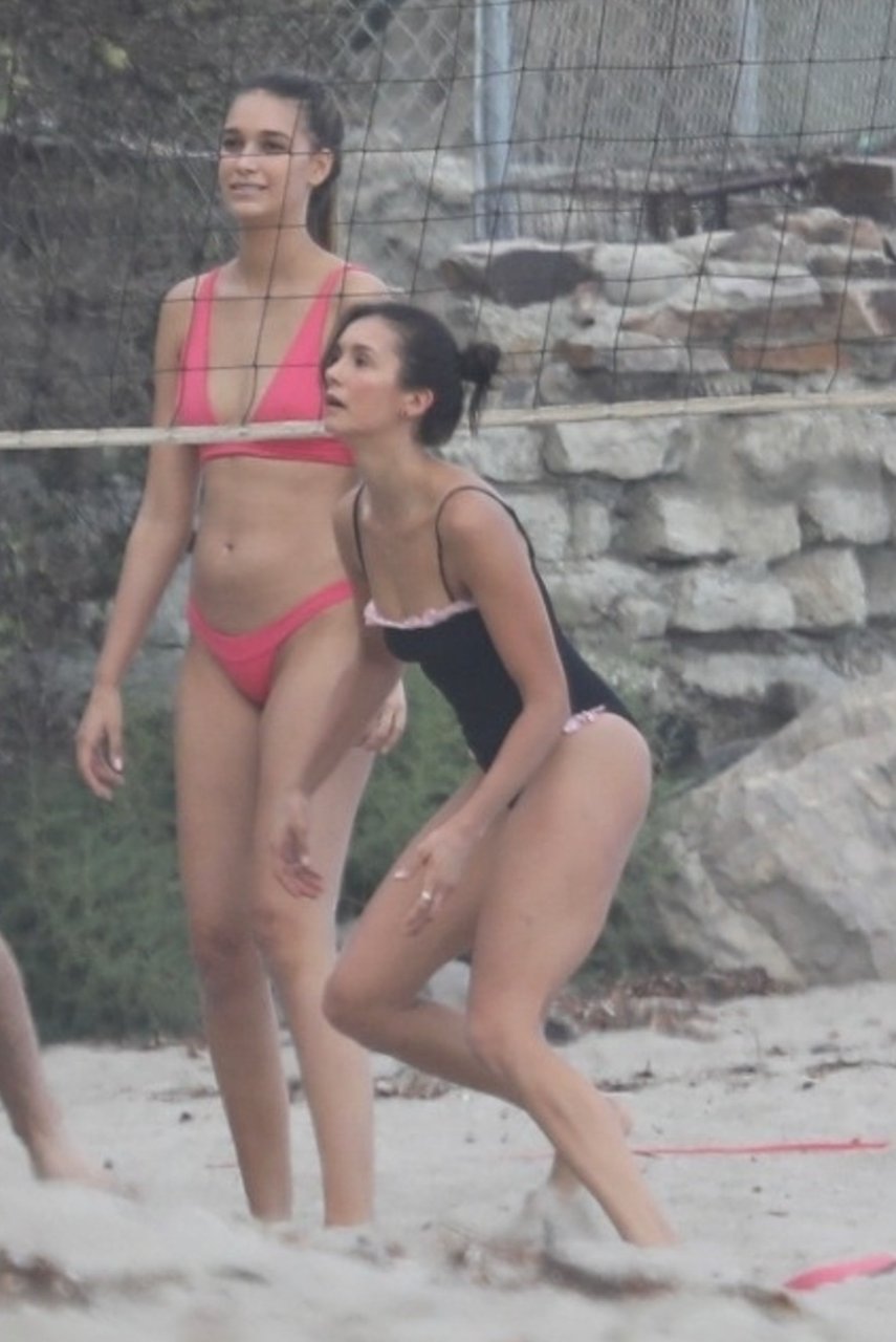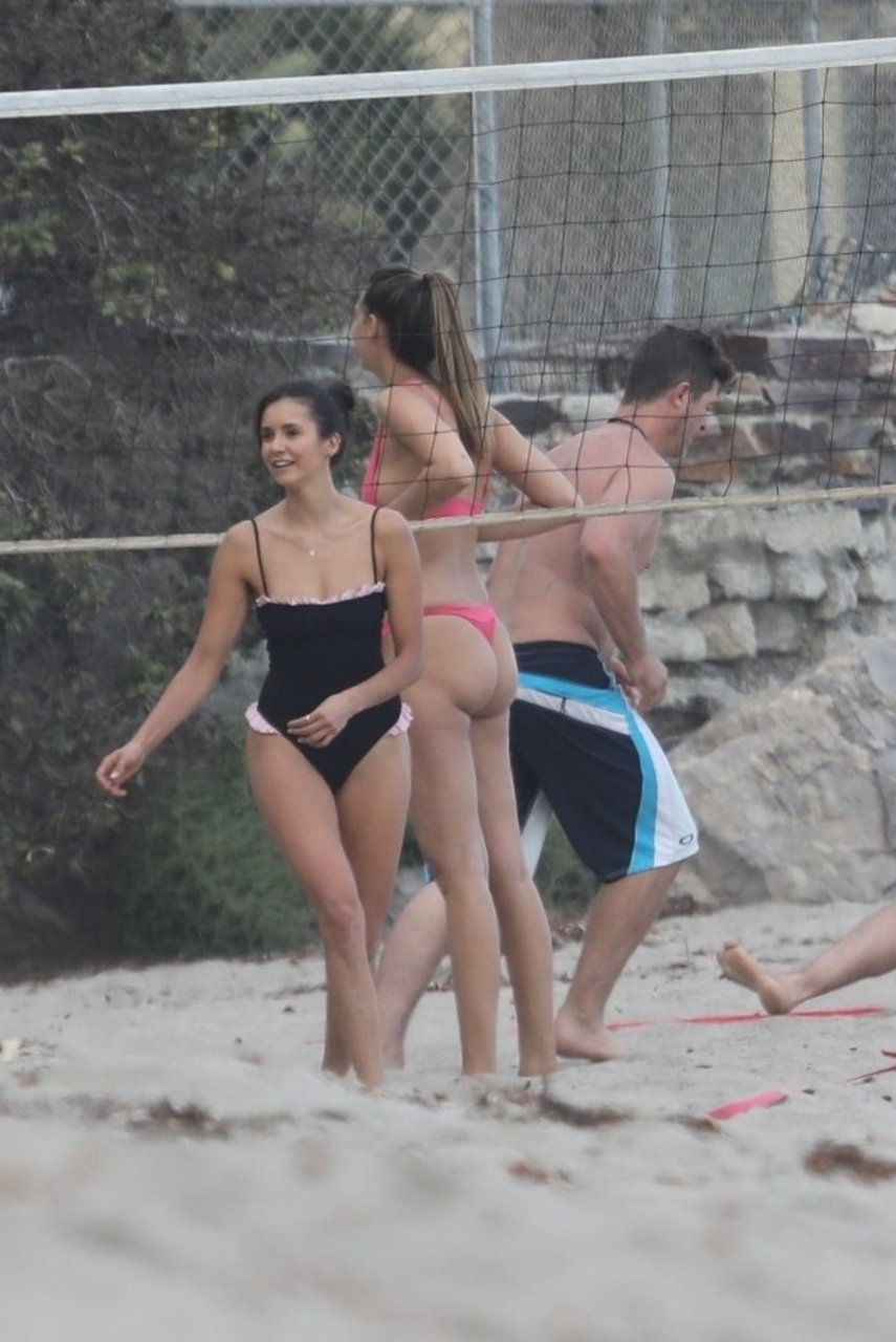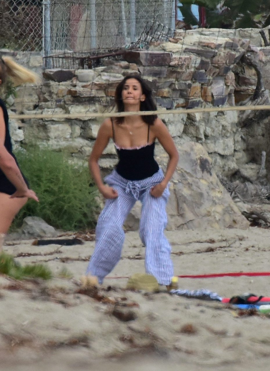 Attrice Nina Dobrev è stata vista con un costume da bagno nero mentre giocava a pallavolo con amici sulla spiaggia di Malibu, 09/02/2018.