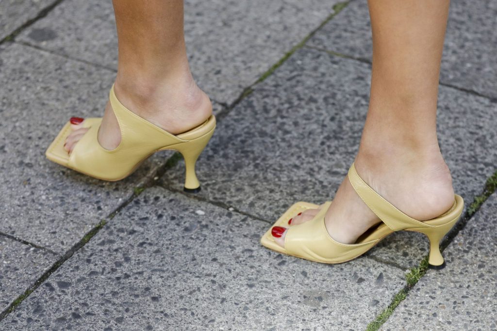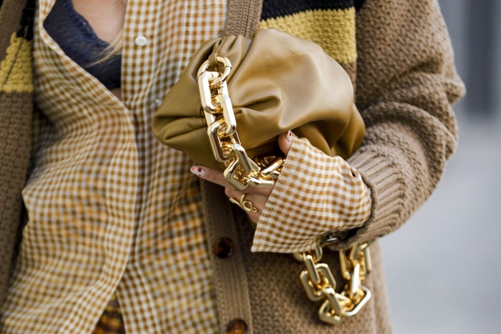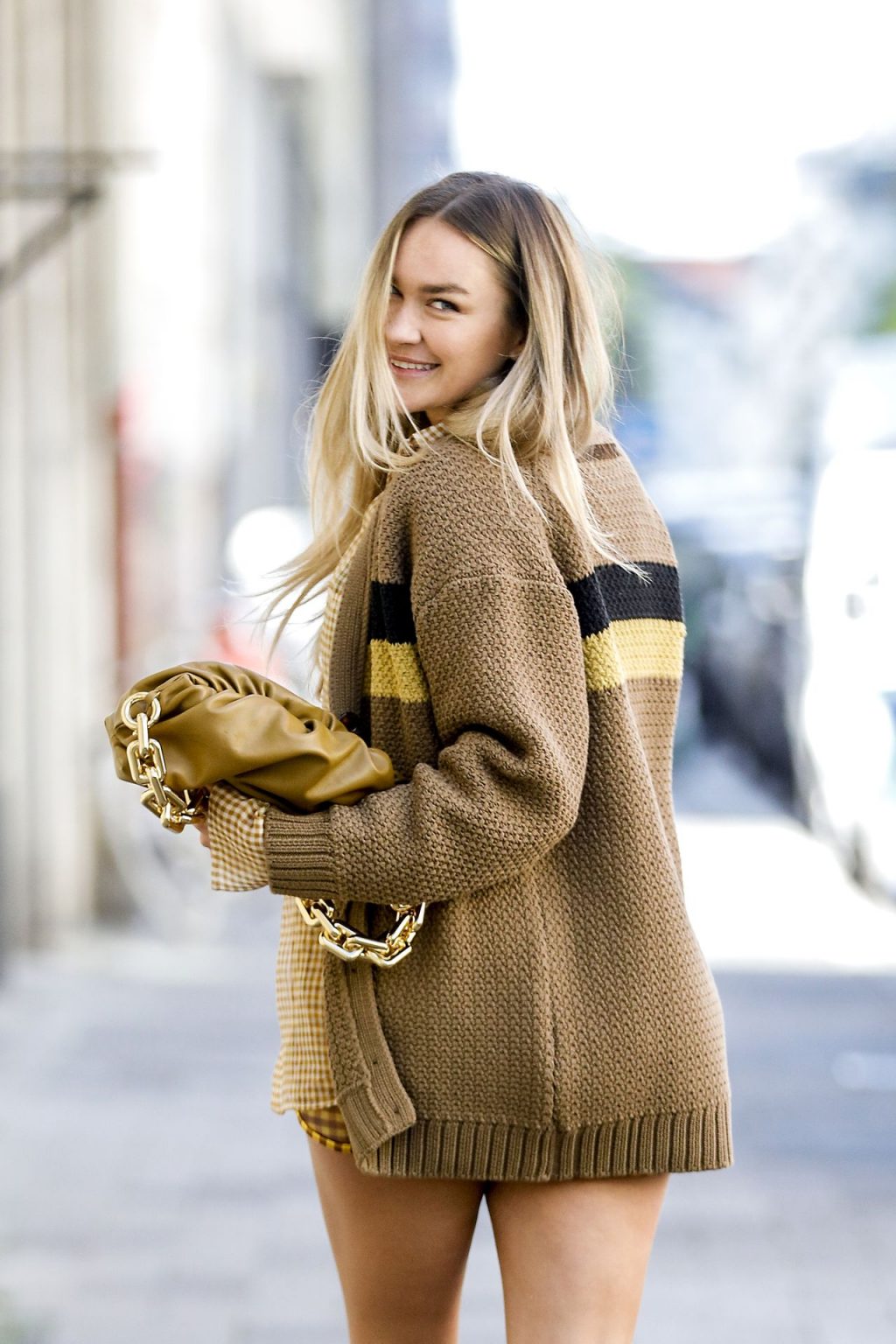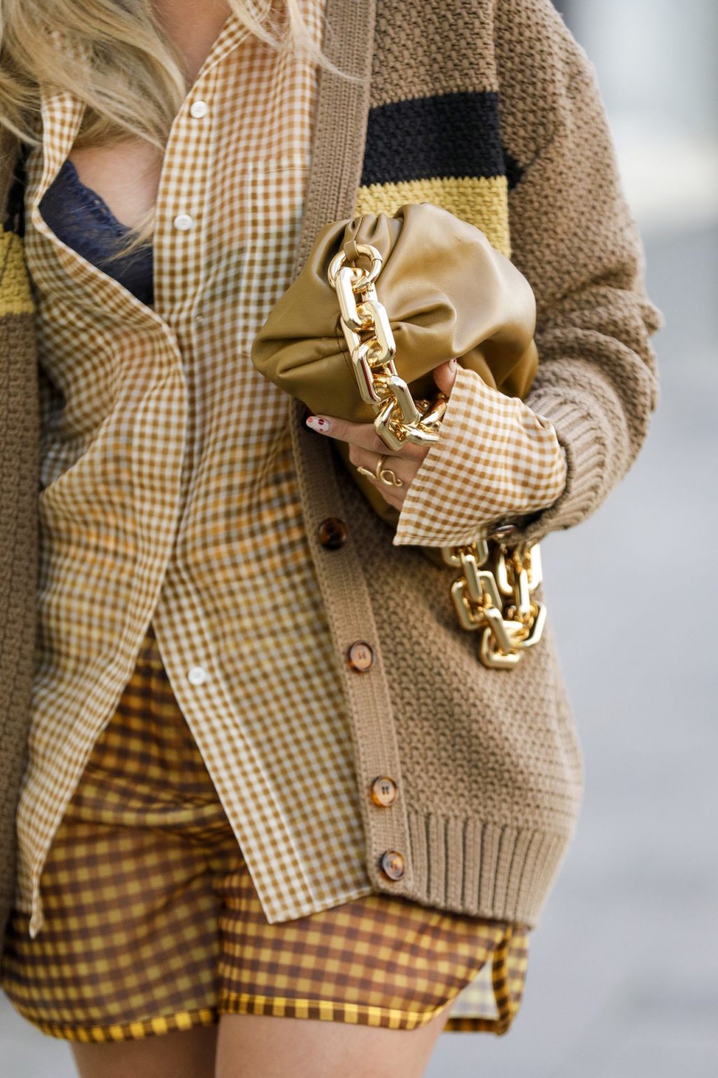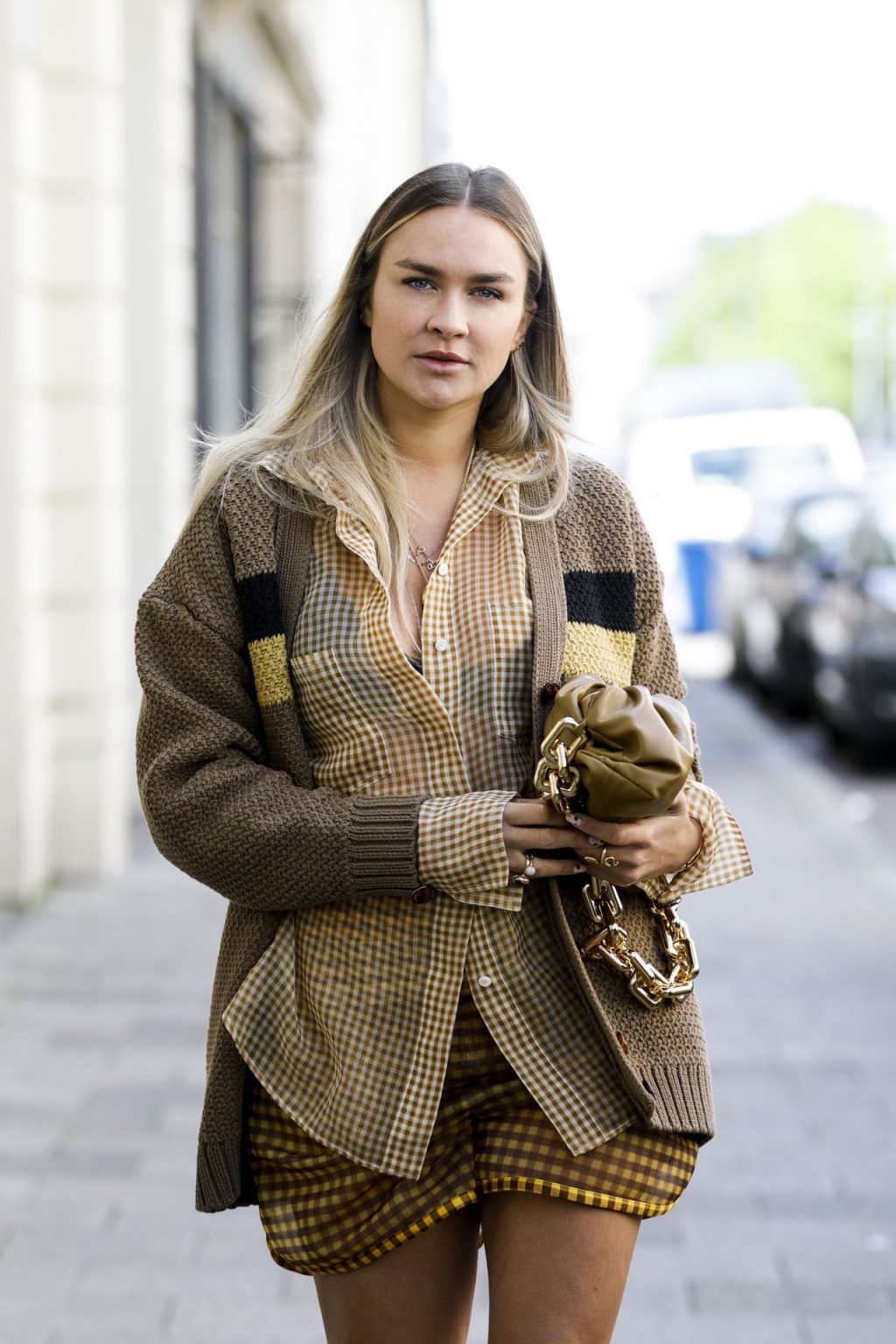 Influencer Nina Suess, indossando un cardigan beige con una striscia a blocchi nero/giallo all’altezza del petto, una camicetta beige a quadri bianchi e pantaloncini a quadri giallo marrone, sandali gialli e una borsa a tracolla color cognac con catena durante uno shooting di street style a Monaco, Germania, 27/05/2020.