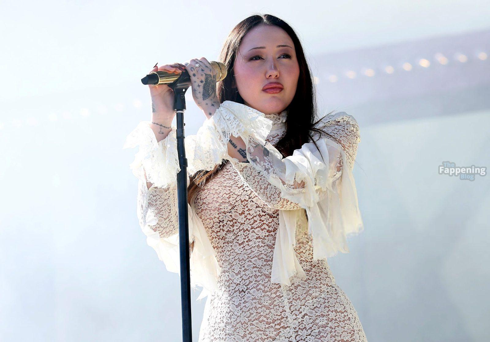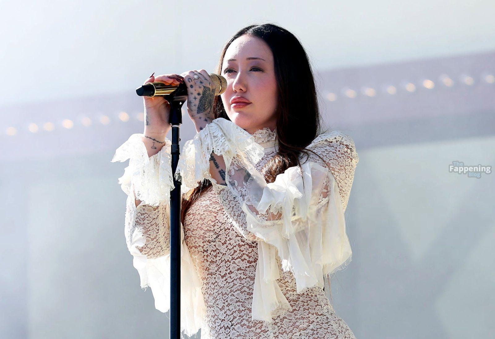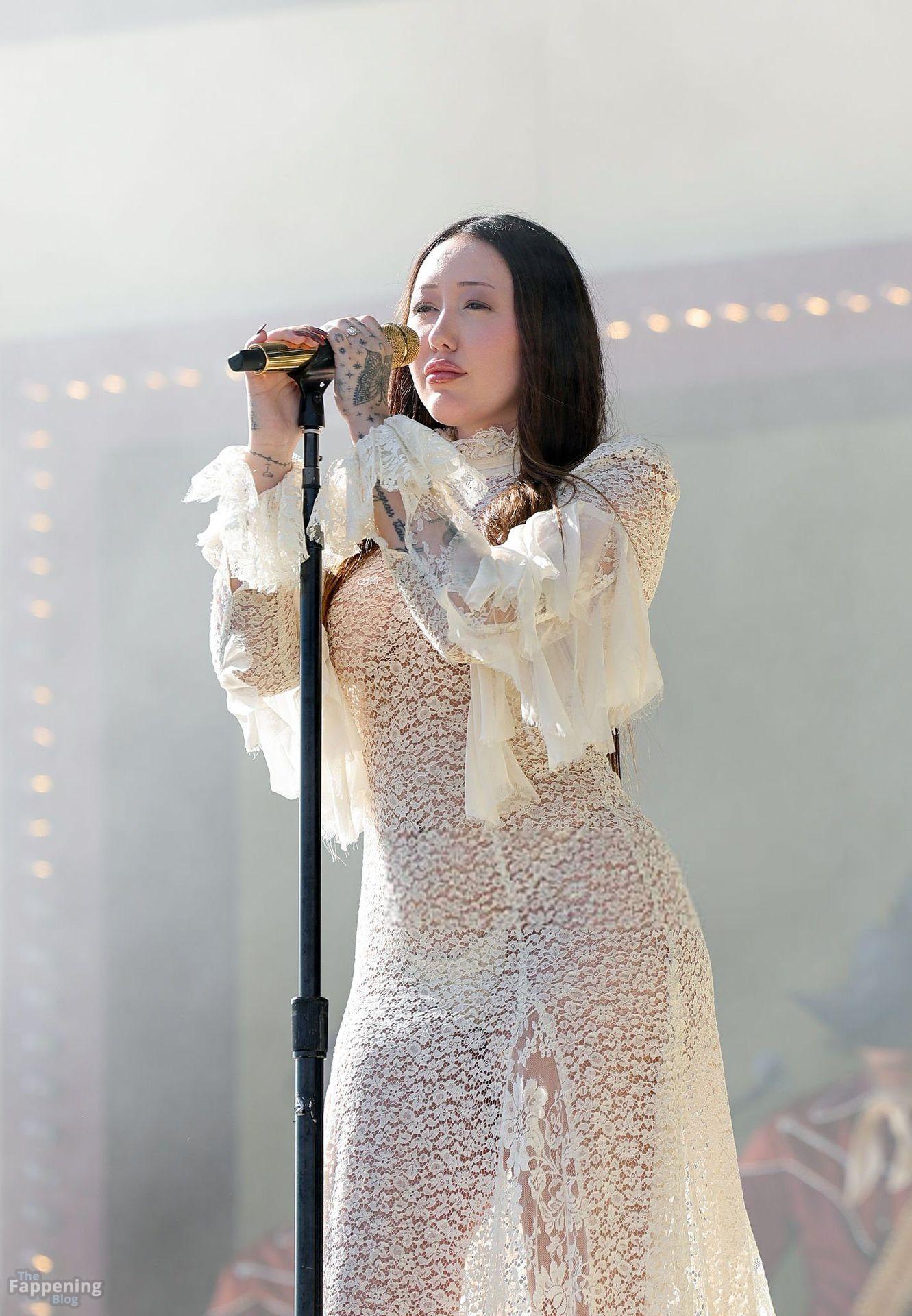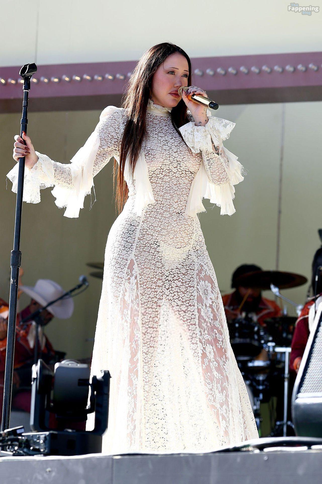 Noah Cyrus senza reggiseno al Coachella 2025, con un abito di pizzo trasparente. La cantante mostra il seno e i capezzoli.
