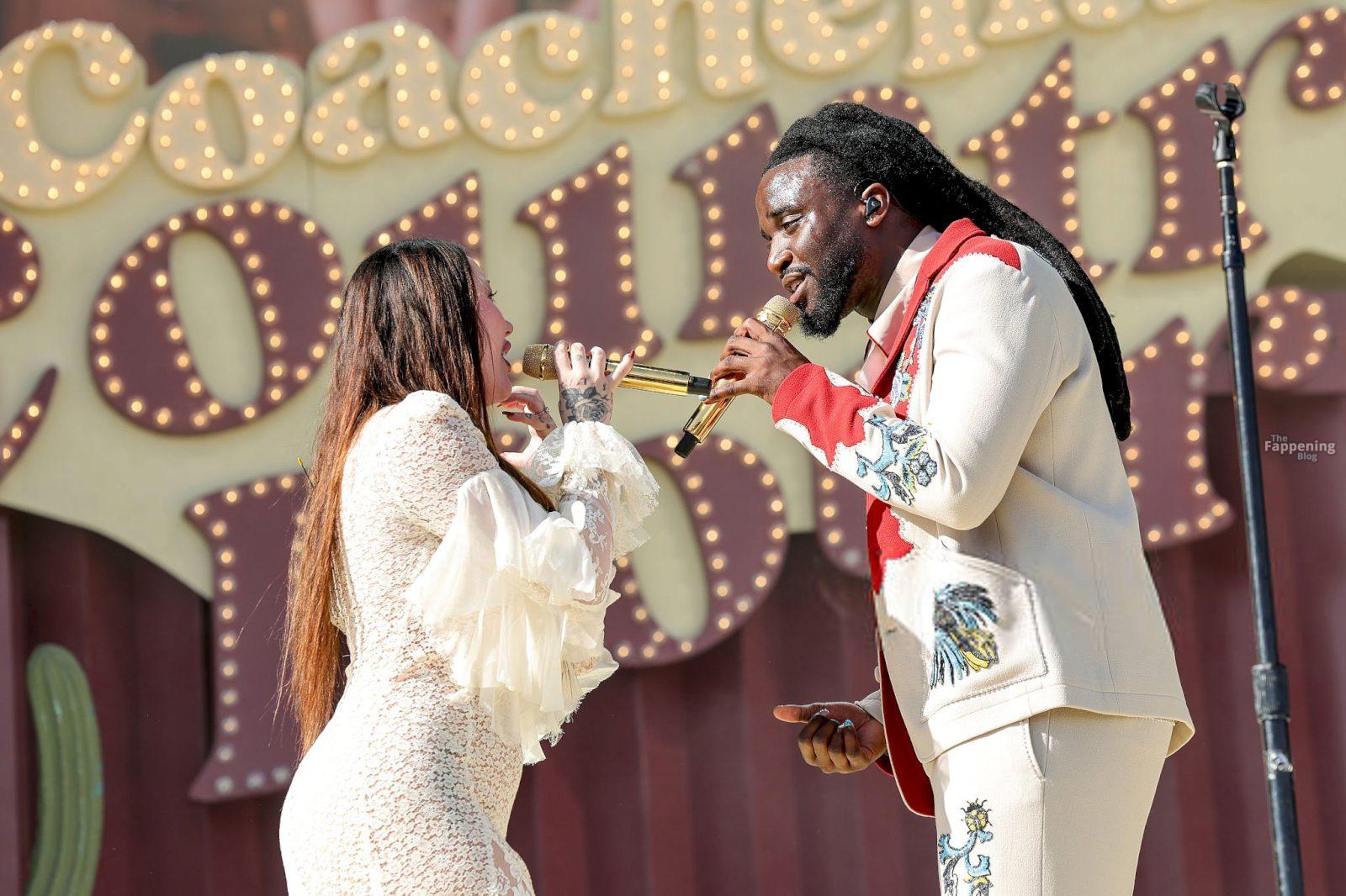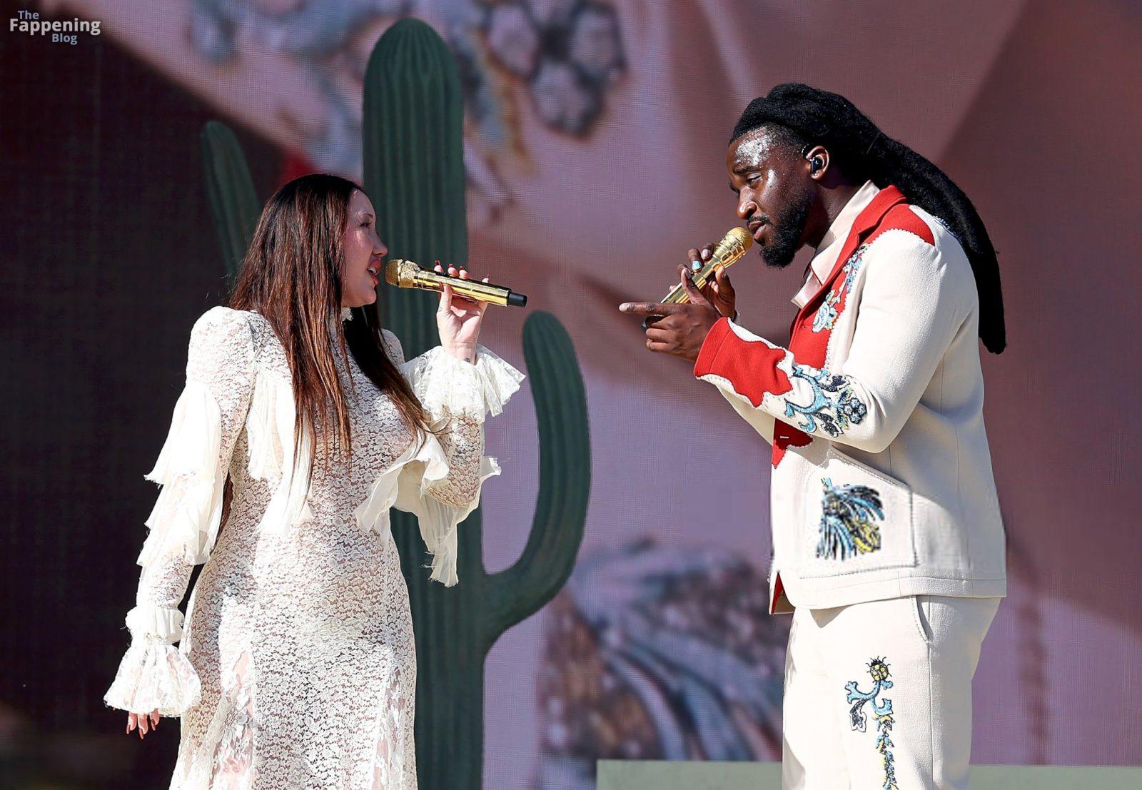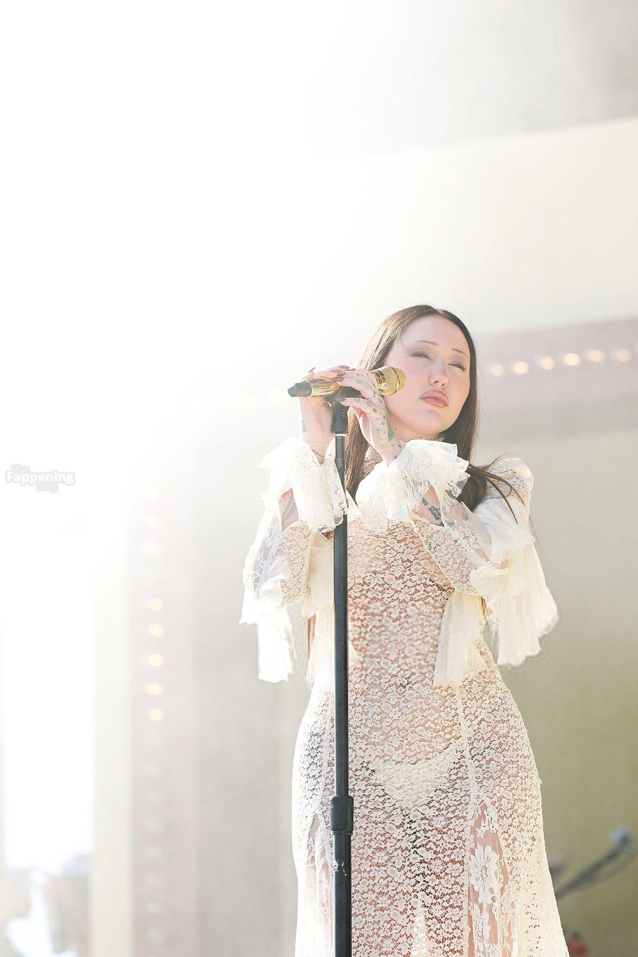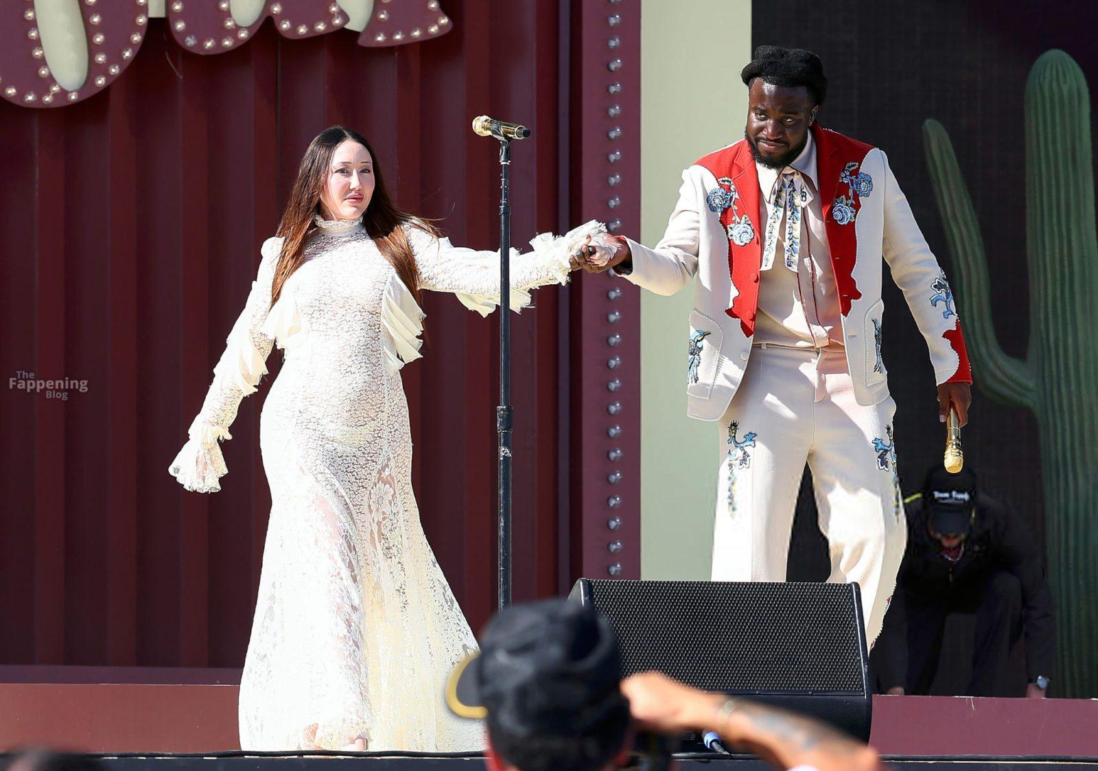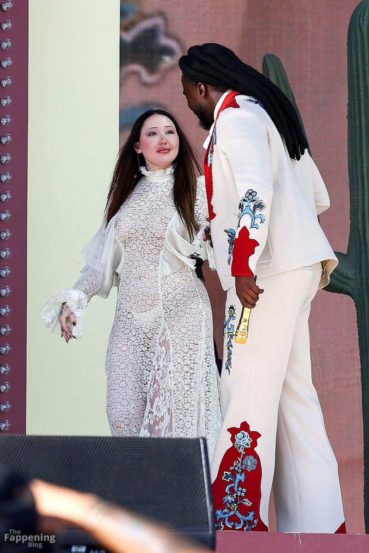 Noah Cyrus senza reggiseno al Coachella 2025, con un abito di pizzo trasparente. La cantante mostra il seno e i capezzoli.