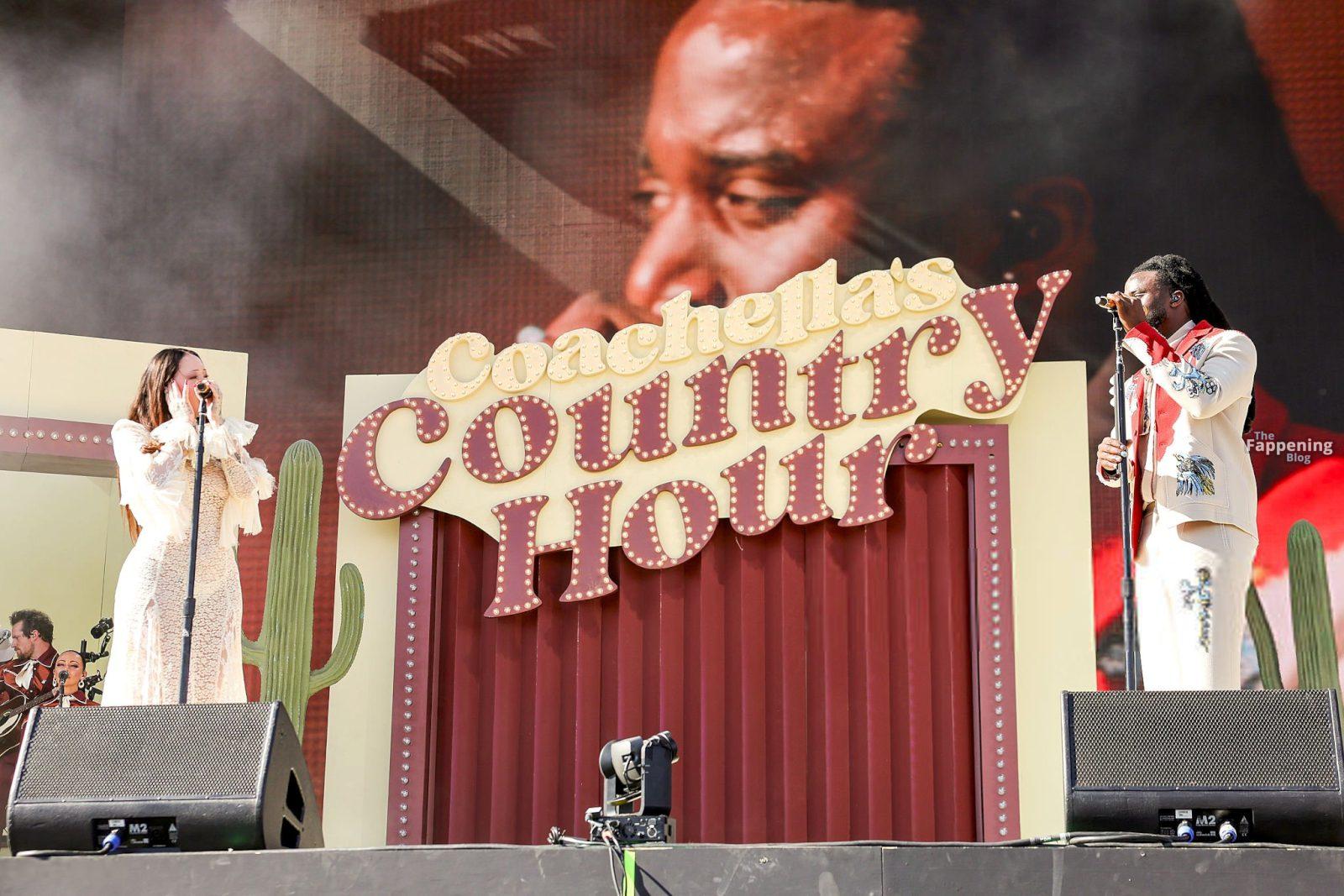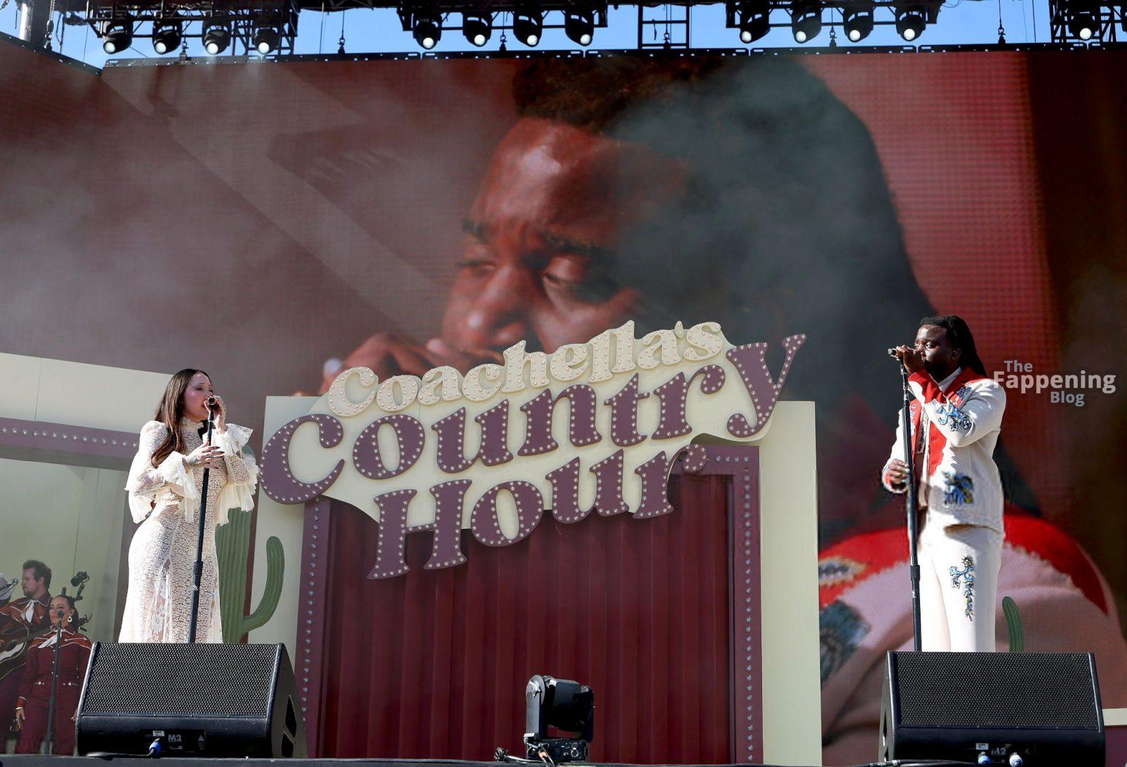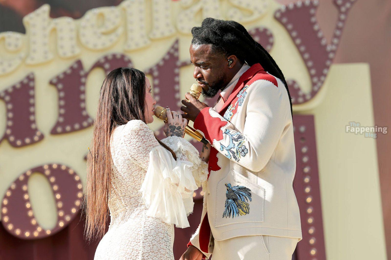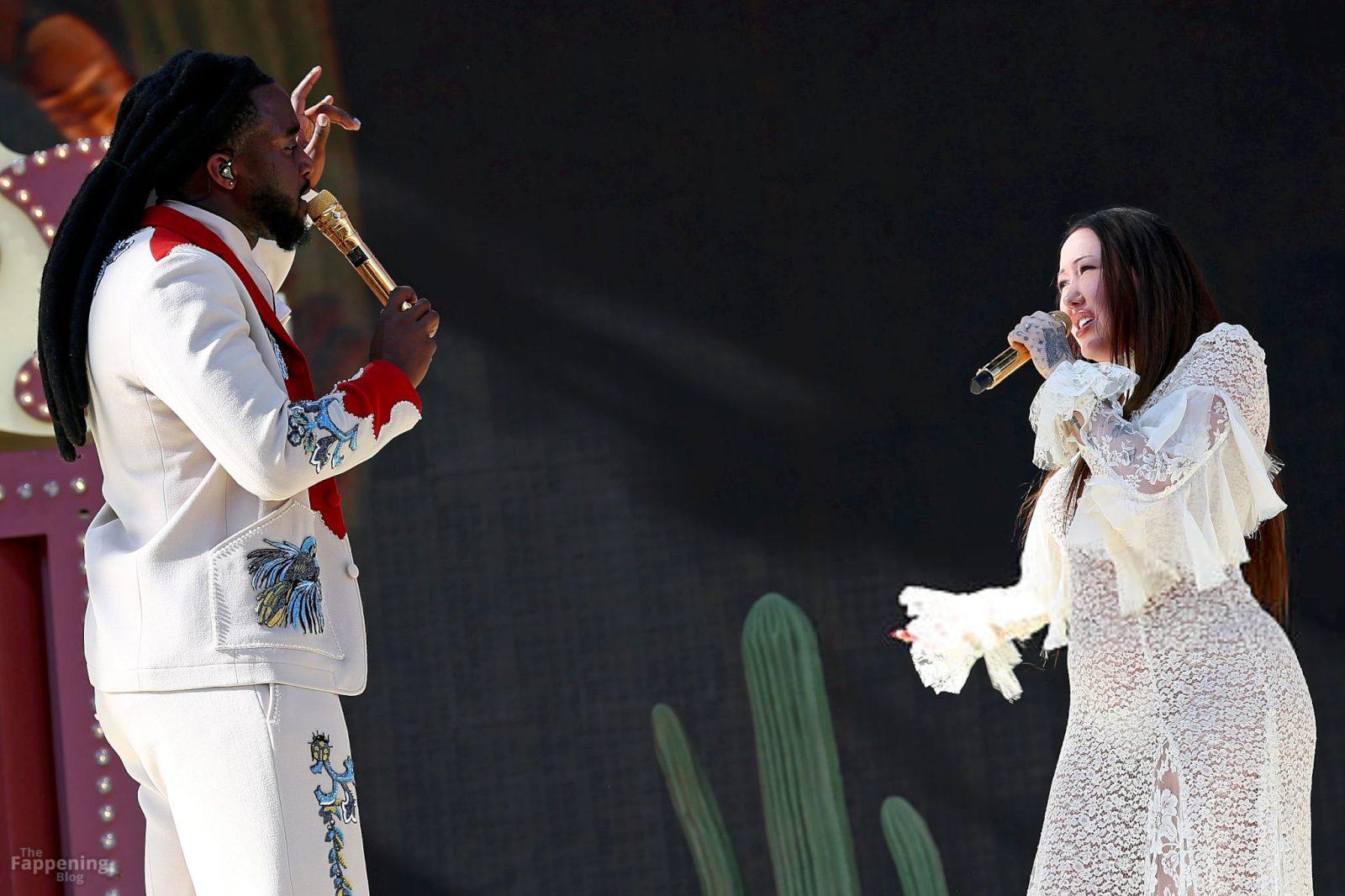 Noah Cyrus senza reggiseno al Coachella 2025, con un abito di pizzo trasparente. La cantante mostra il seno e i capezzoli.