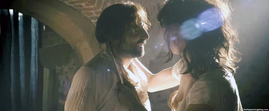 And now comes the third and the final scene from the ‘Angélique’ movie. Nora Arnezeder kneels on some cushions and speaks to a man before he attacks her with a knife while wearing a loose-fitting dress that hangs open to reveal flashes of her breasts. Then we see Nora seated in front of him, holding the knife herself, her right breast visible.