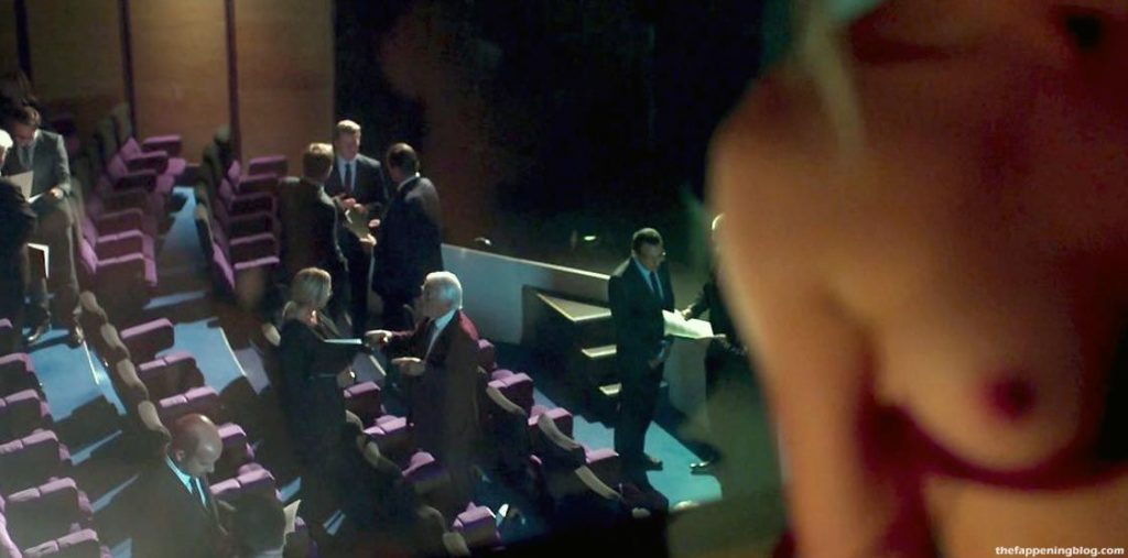 The following few scenes that I have to show you are from a TV show called ‘Riviera’. I’ve already mentioned them above, and these two might be my favorite ones! In the first scene, Nora Arnezeder is having sex with a guy on a desk in a booth above a movie theatre, first facing him with her right breast visible, then bending over with the guy behind her, her bra pulled down, revealing her left breast.