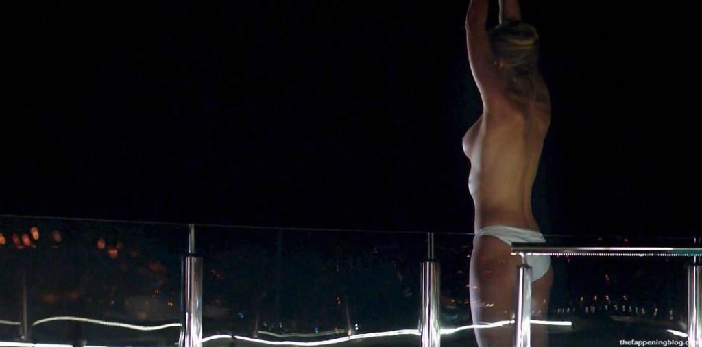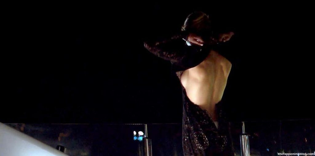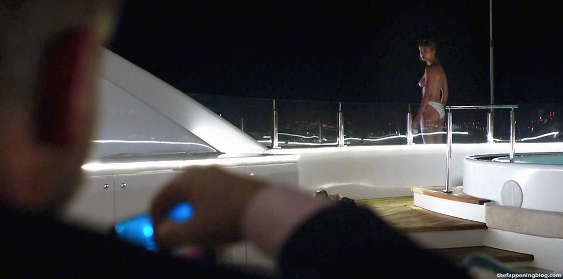 Here’s the second scene from the ‘Riviera’ show! In this scene, Nora Arnezeder is standing on the deck of a luxurious yacht at night, removing her dress and exposing her left breast from the side while she glances back over her shoulder at a man while wearing white panties.
