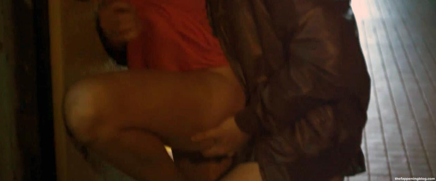 The next scene is from the ‘Maniac’ movie. In this scene, we see Nora Arnezeder as she stands with her dress hiked up to her hips and her left leg lifted while a man has sex with her from behind against a column, the man placing his palm on her buttocks.