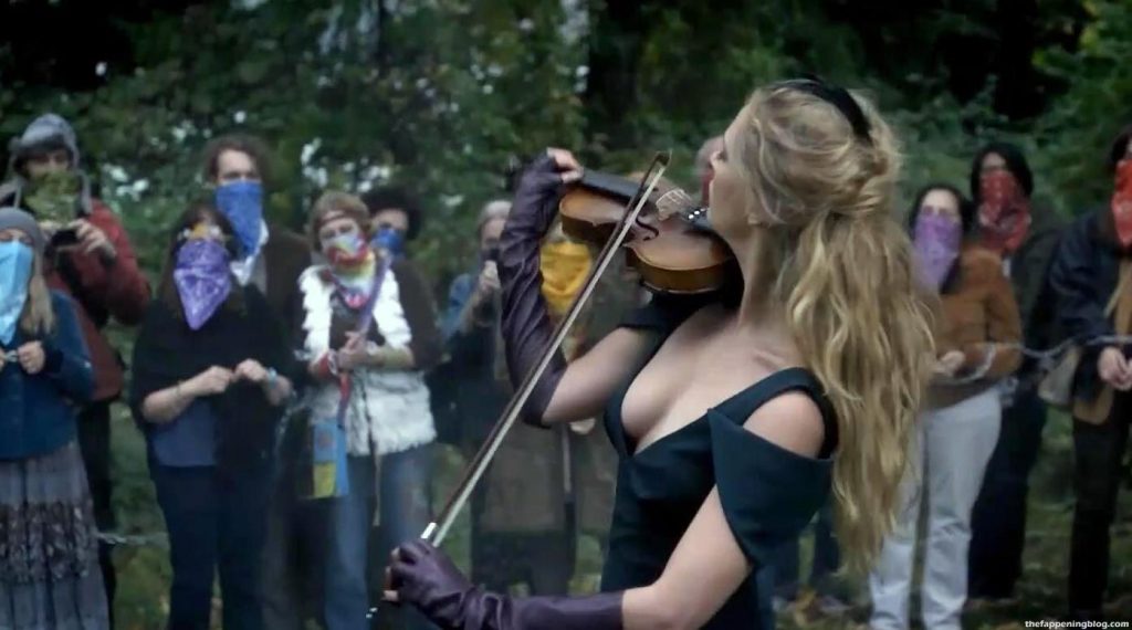 And the last scene that I have prepared for you is from the ‘Mozart in the Jungle’ series. In this scene, Nora Arnezeder first reveals her cleavage in a black gown while enthusiastically playing the violin in front of a crowd of people outside. Her dress then slips off her left leg, revealing a glimpse of her breast.