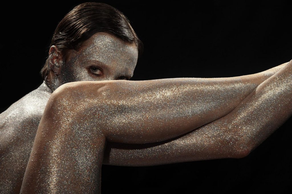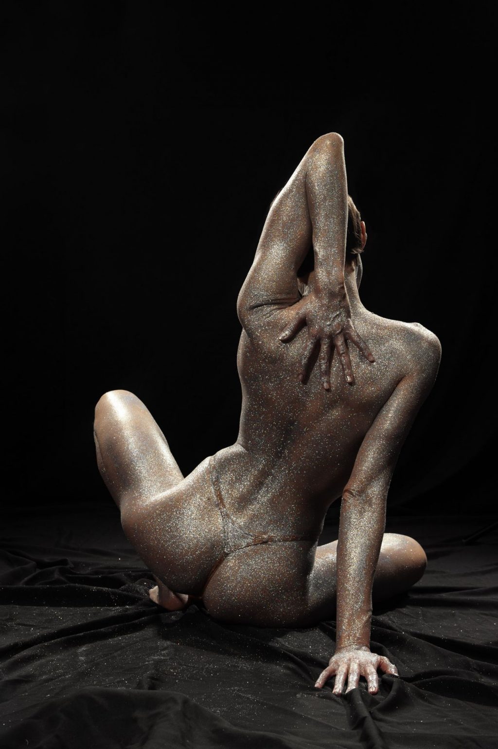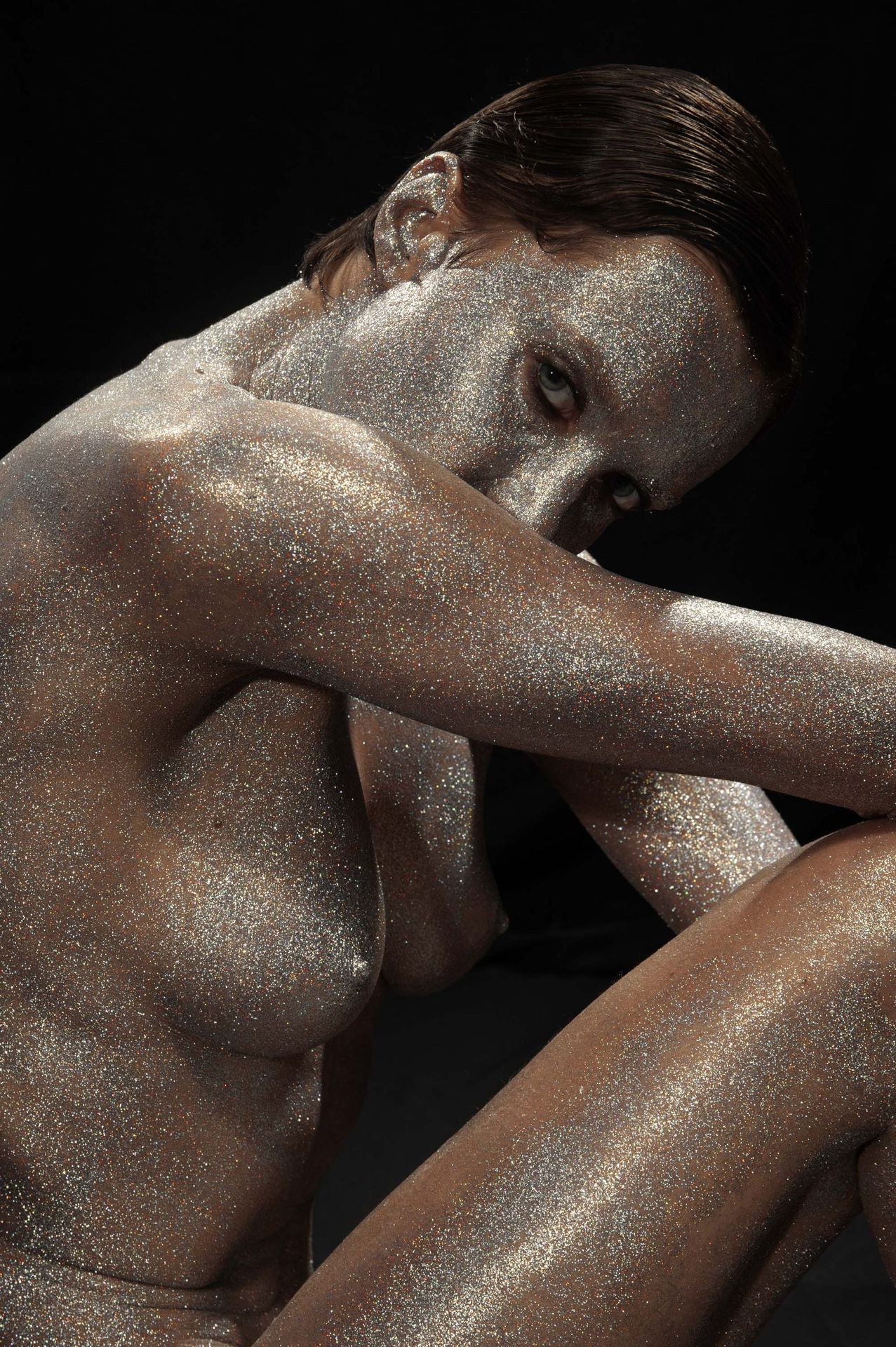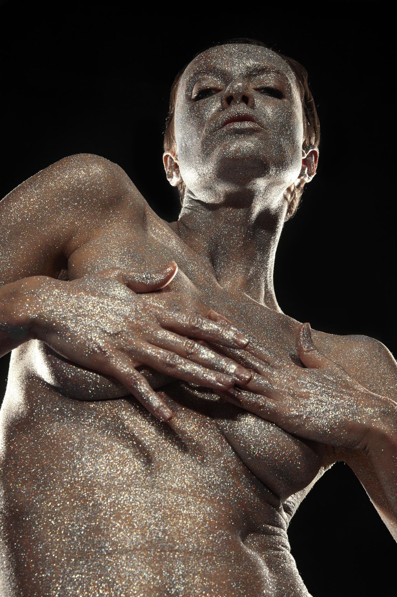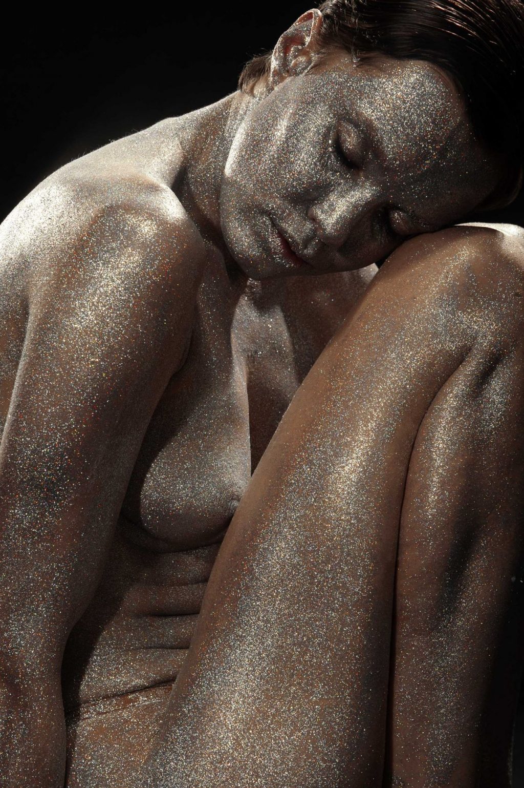 Modella russa Oksana Chucha posa nuda coperta di glitter in un nuovo servizio fotografico di Irina Neklyudova (maggio 2020). Ha mostrato i suoi seni perfetti in uno studio.