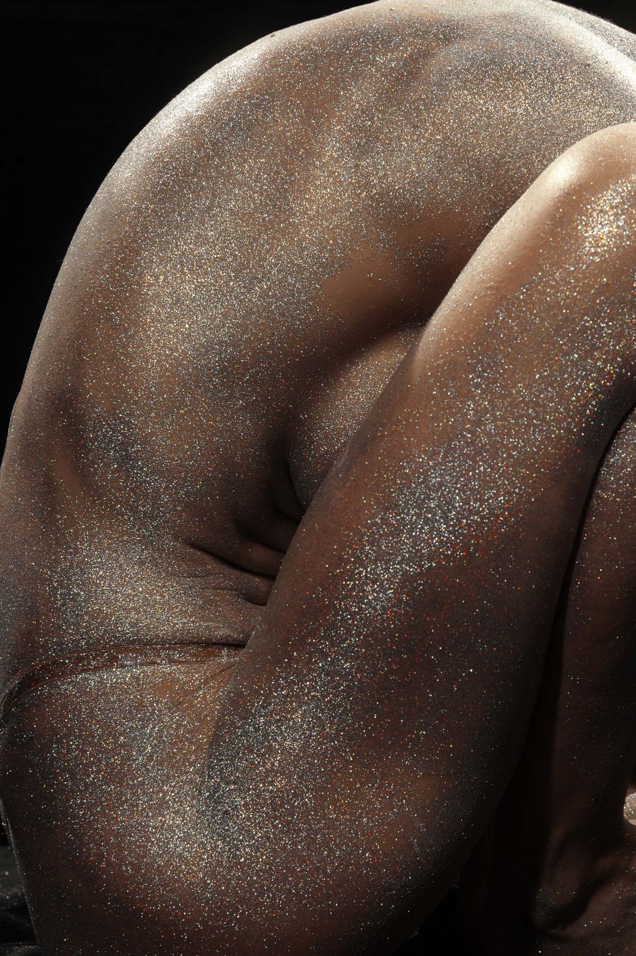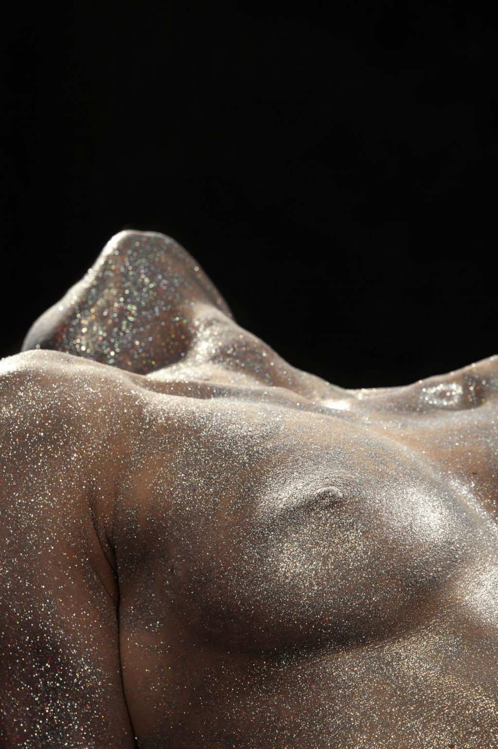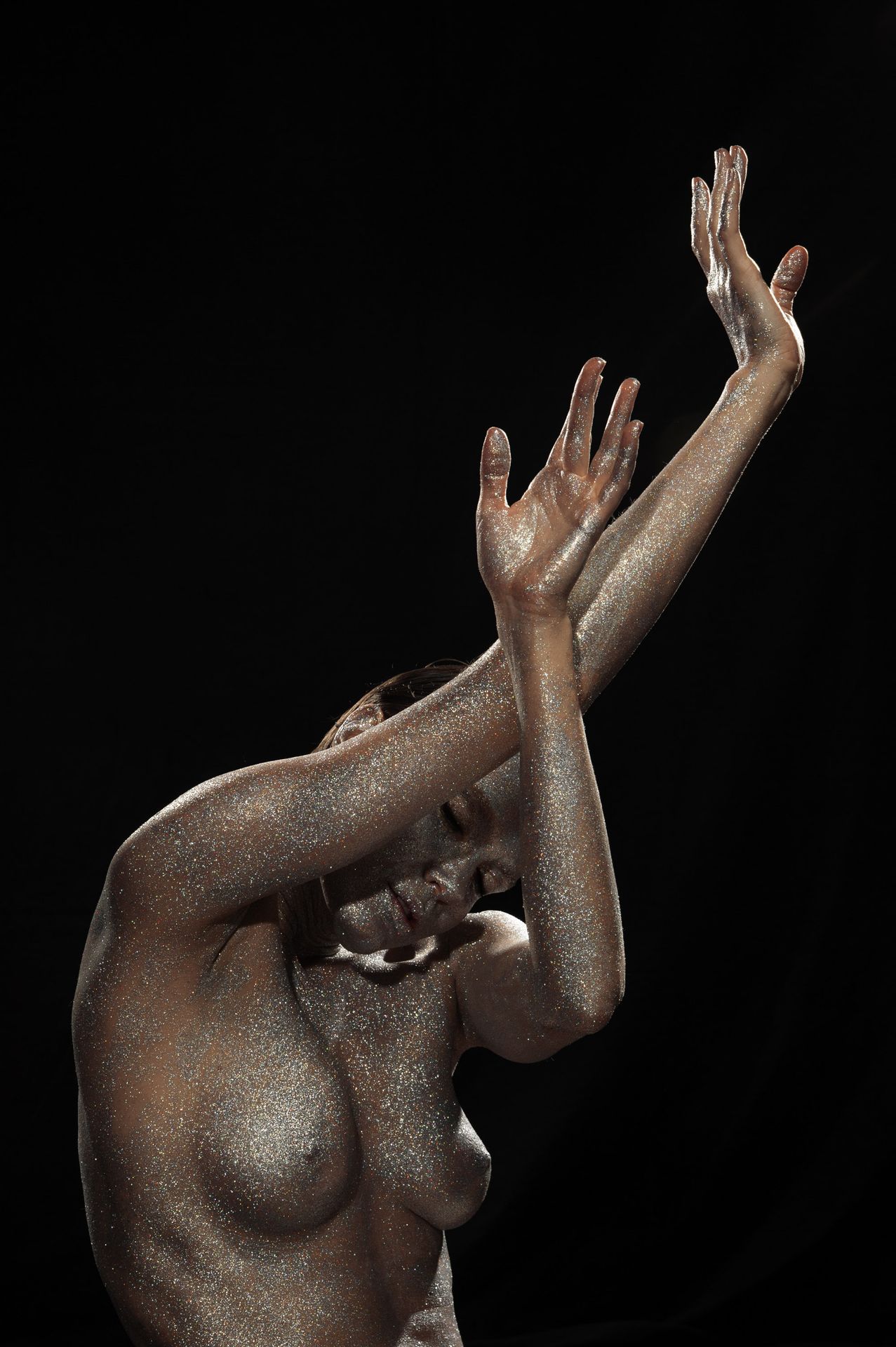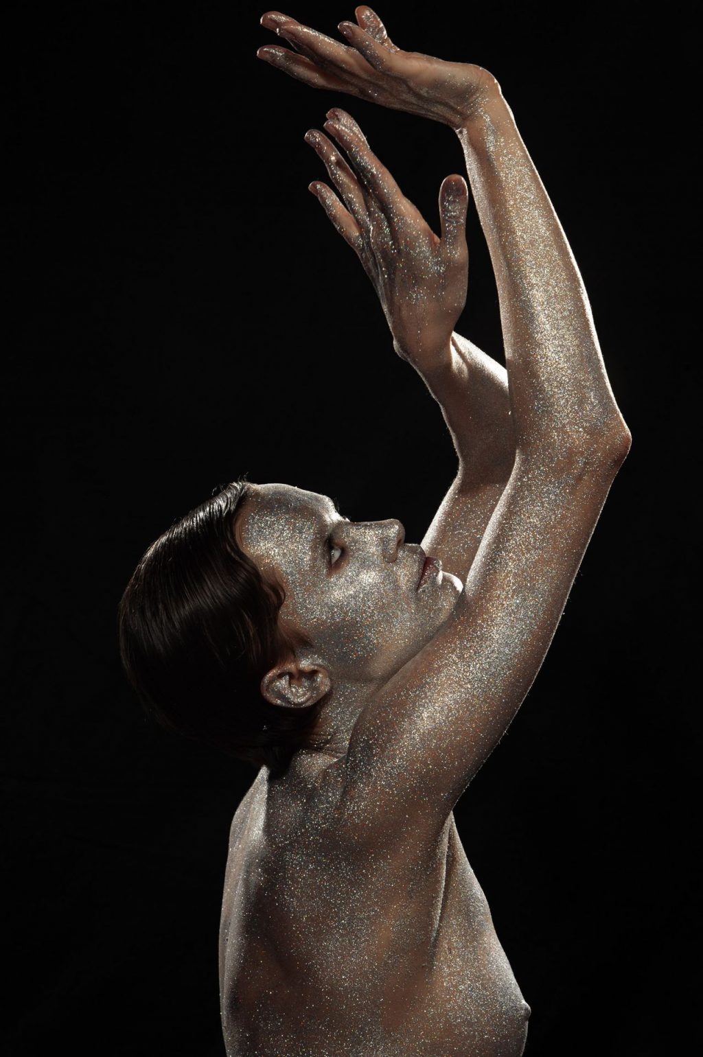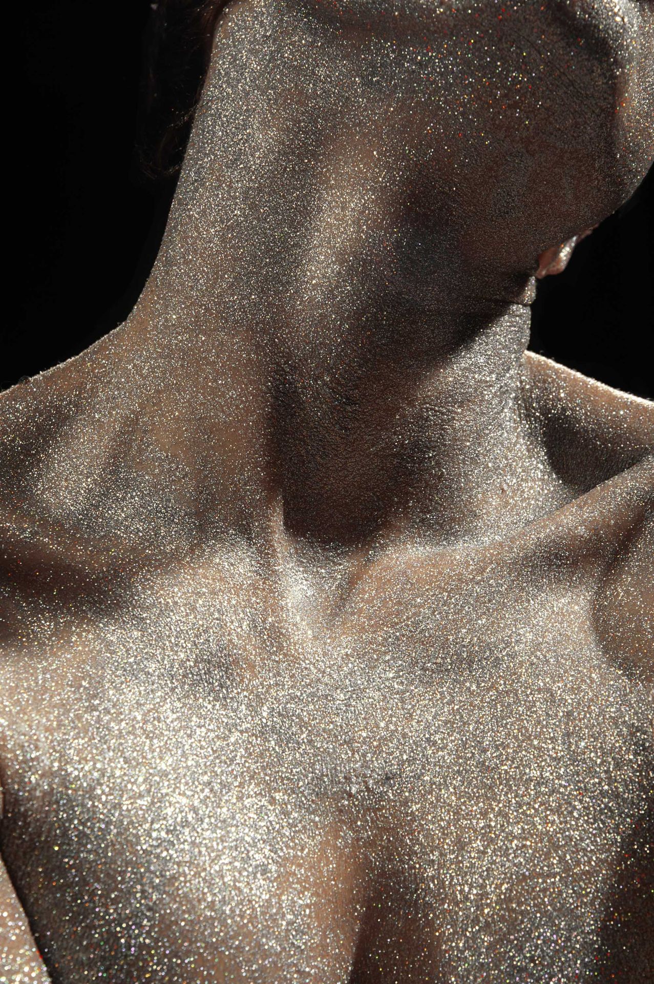 Modella russa Oksana Chucha posa nuda coperta di glitter in un nuovo servizio fotografico di Irina Neklyudova (maggio 2020). Ha mostrato i suoi seni perfetti in uno studio.