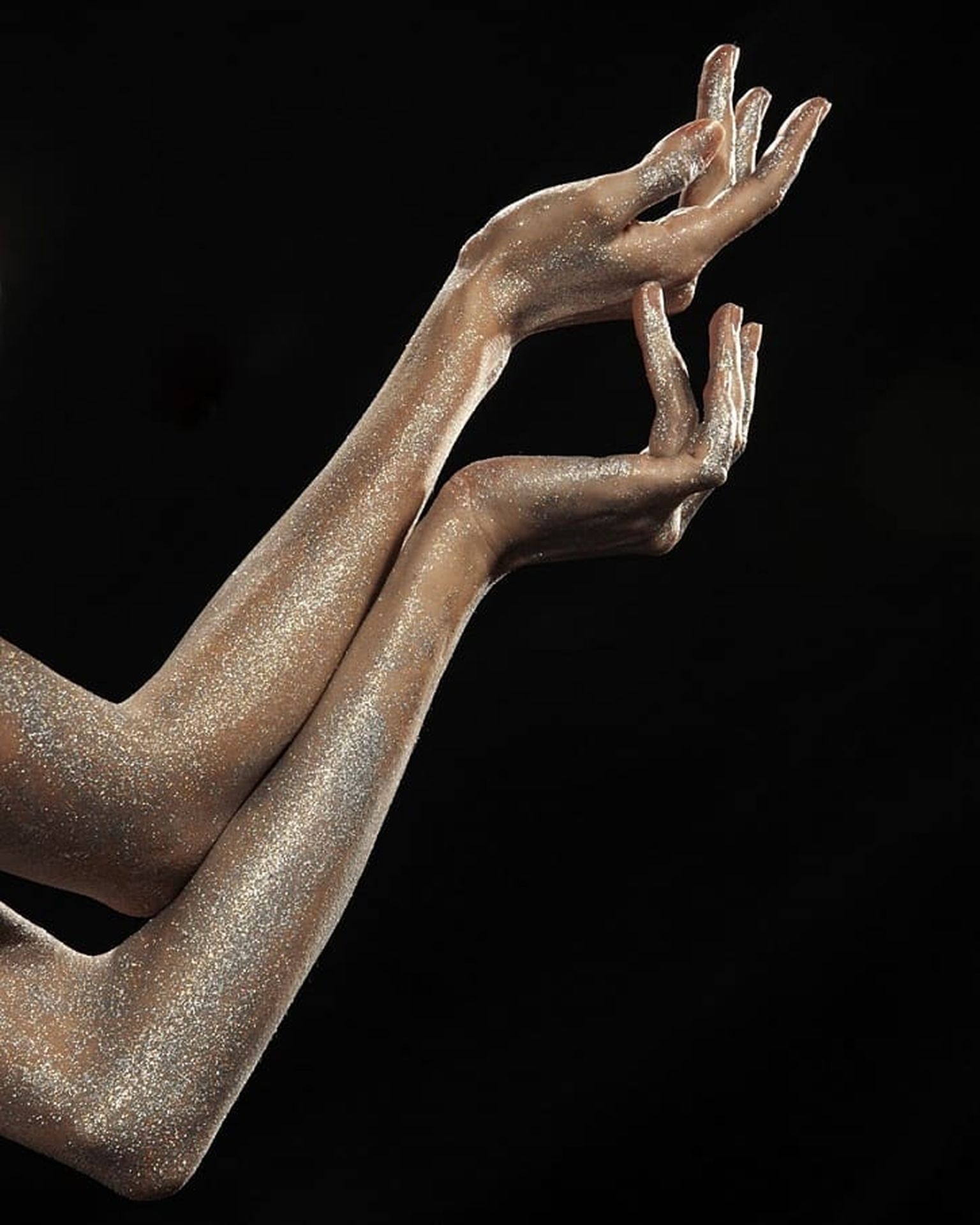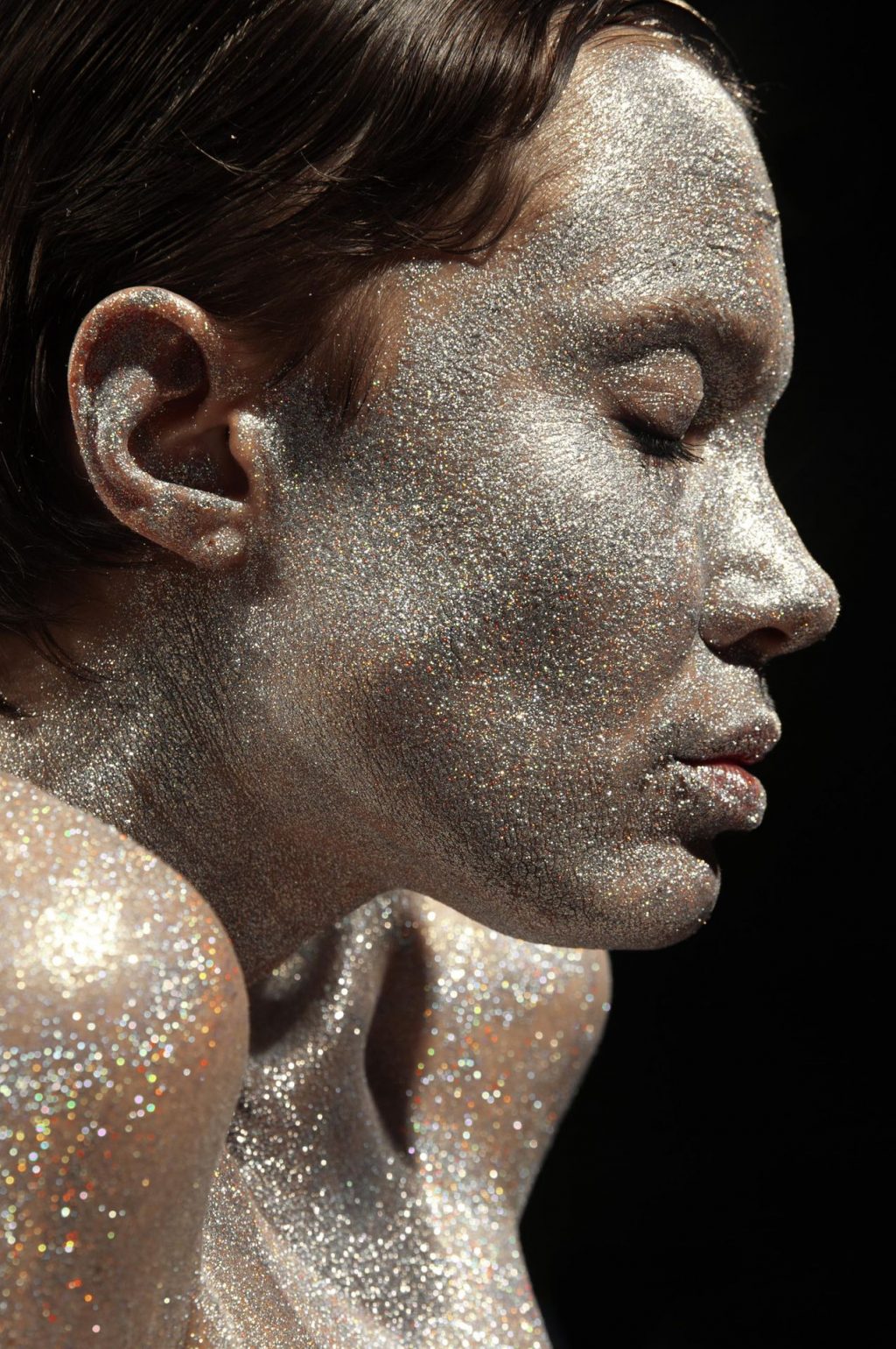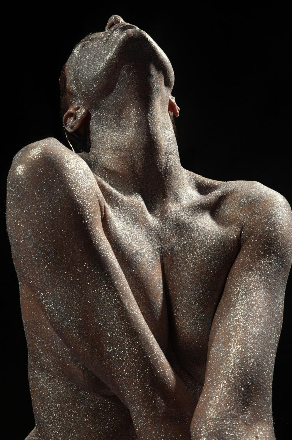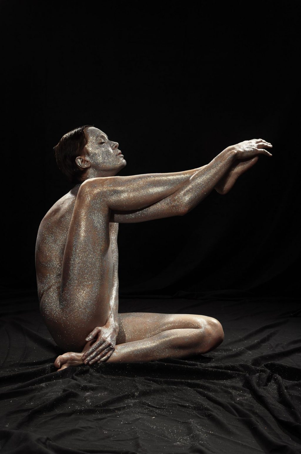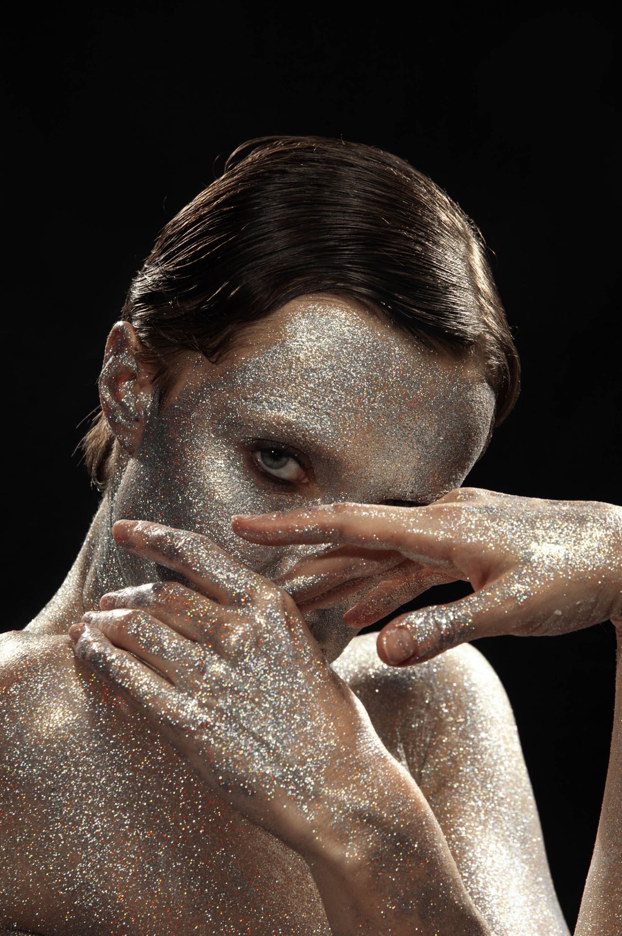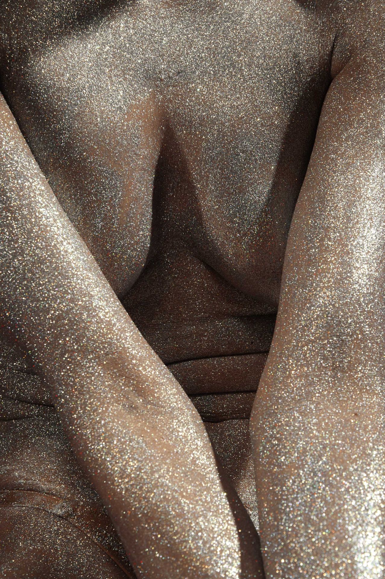Modella russa Oksana Chucha posa nuda coperta di glitter in un nuovo servizio fotografico di Irina Neklyudova (maggio 2020). Ha mostrato i suoi seni perfetti in uno studio.