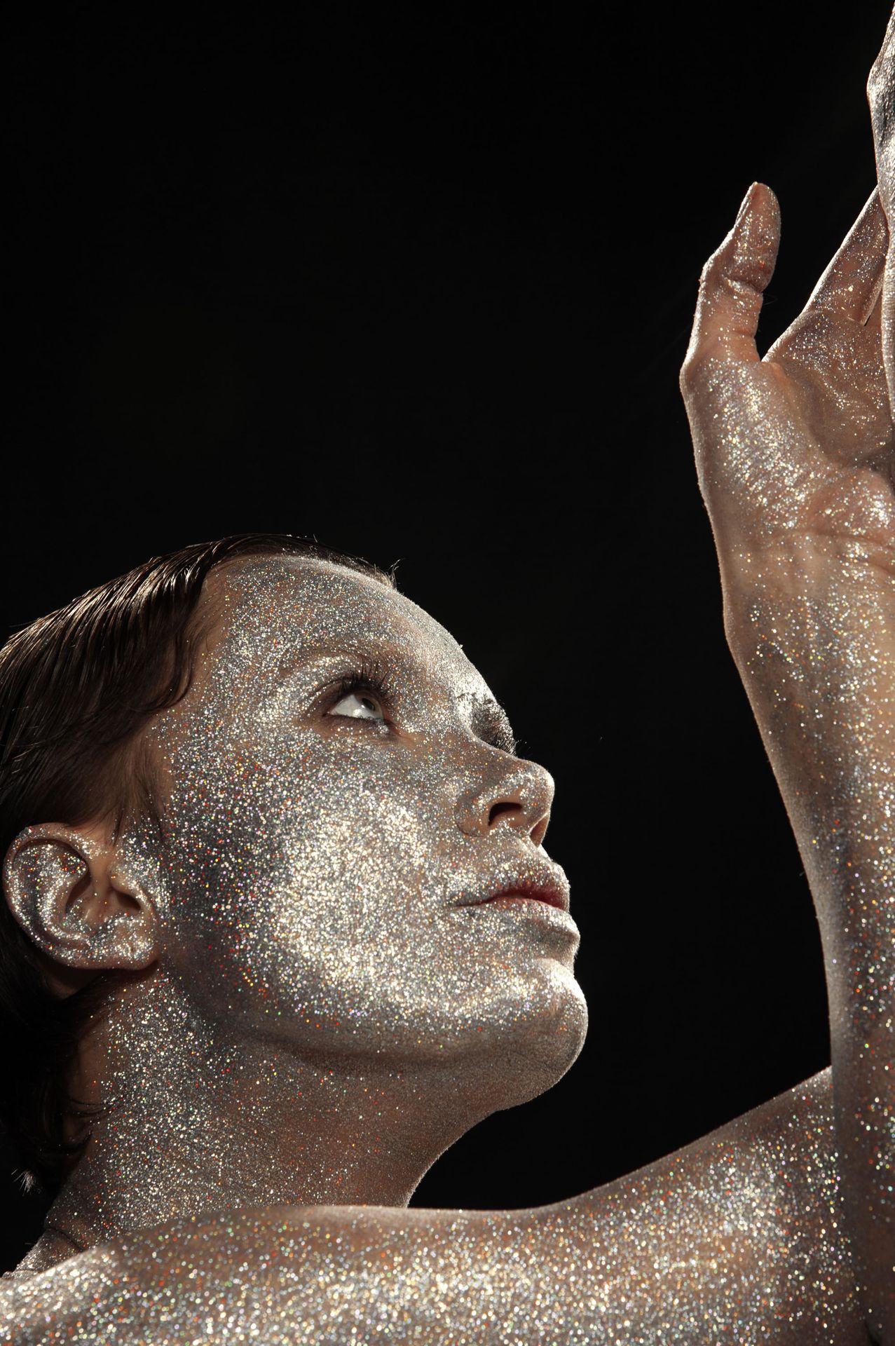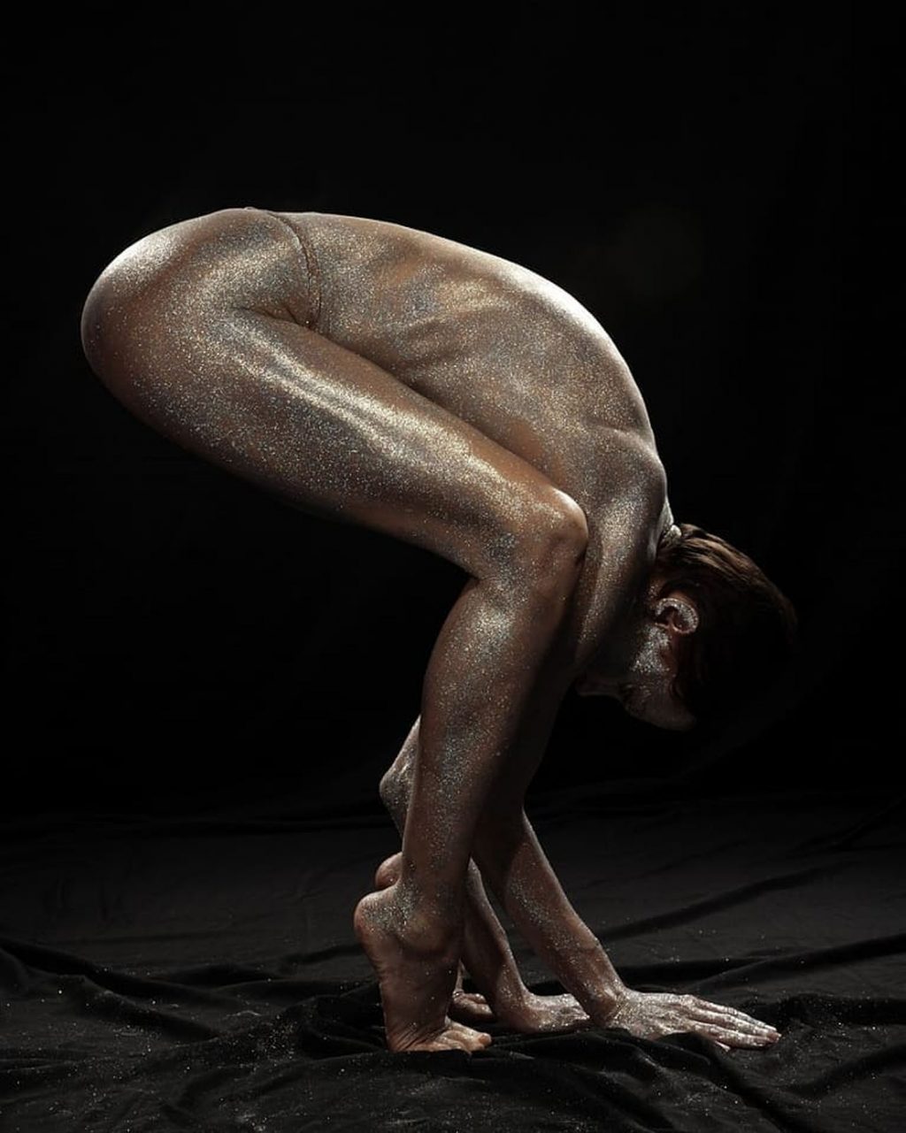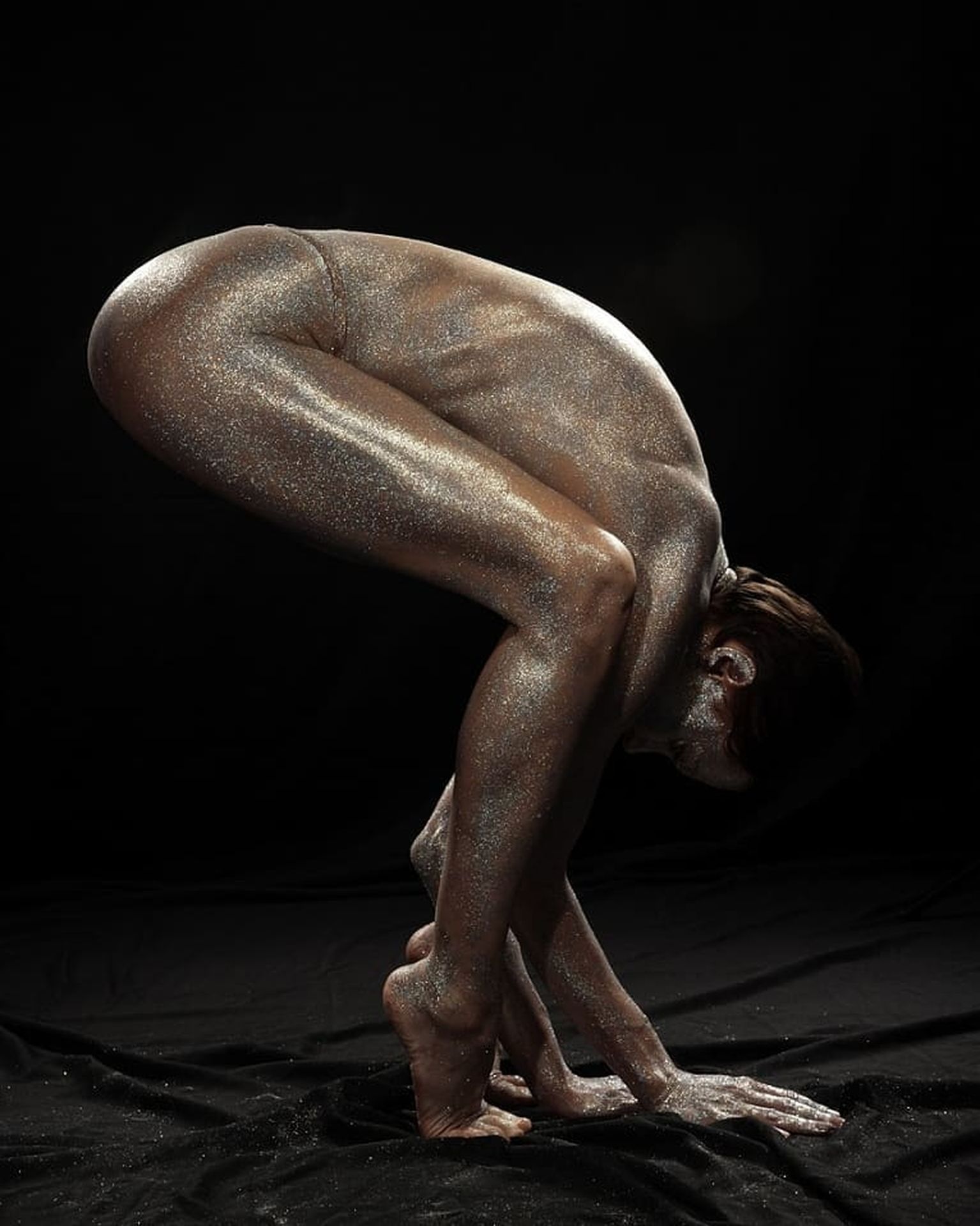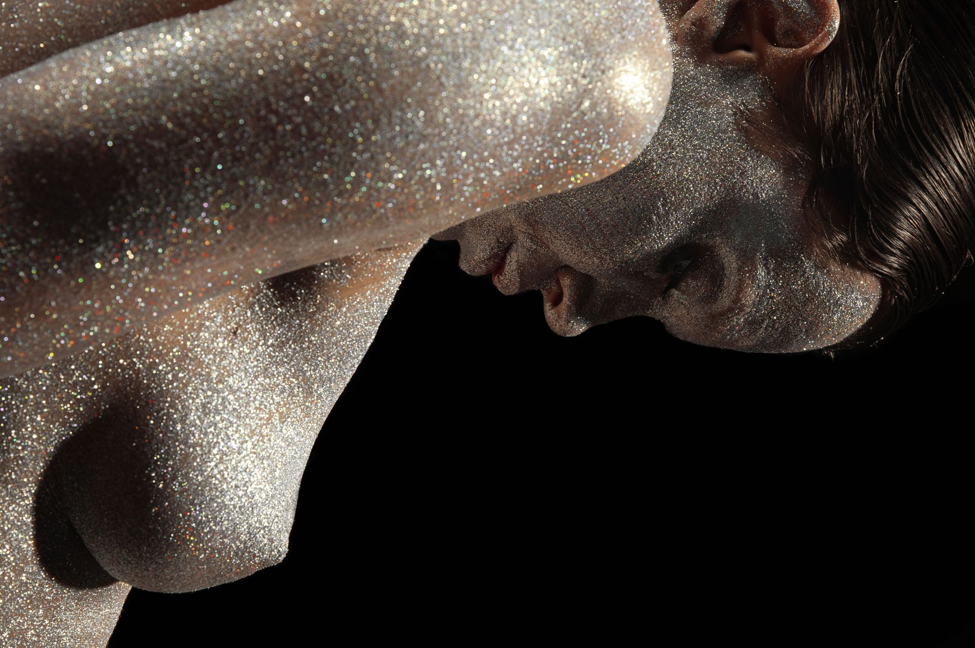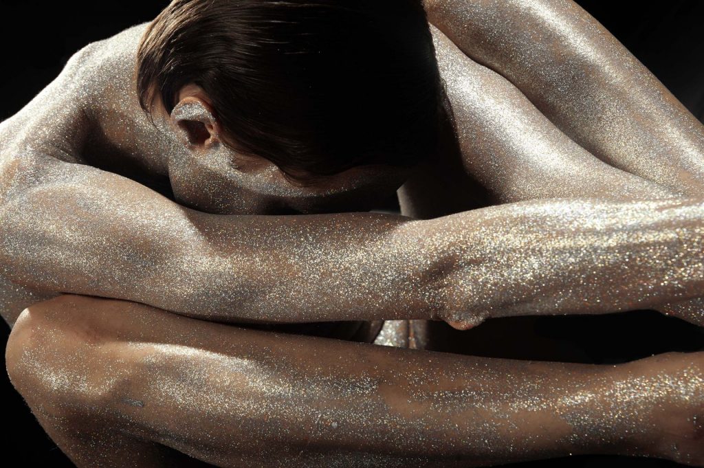 Modella russa Oksana Chucha posa nuda coperta di glitter in un nuovo servizio fotografico di Irina Neklyudova (maggio 2020). Ha mostrato i suoi seni perfetti in uno studio.