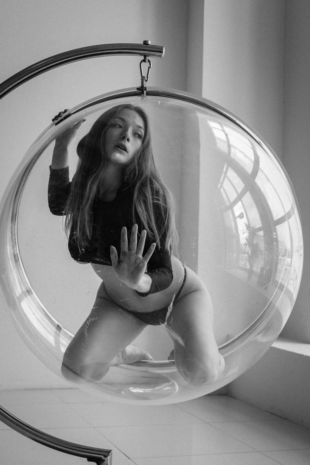 Sempre splendida modella russa Olga Kobzar posa nuda, mostrando il suo grande seno e un pube nello studio, in biancheria intima e calze, in un servizio fotografico di Igor Vasilyev (2020).