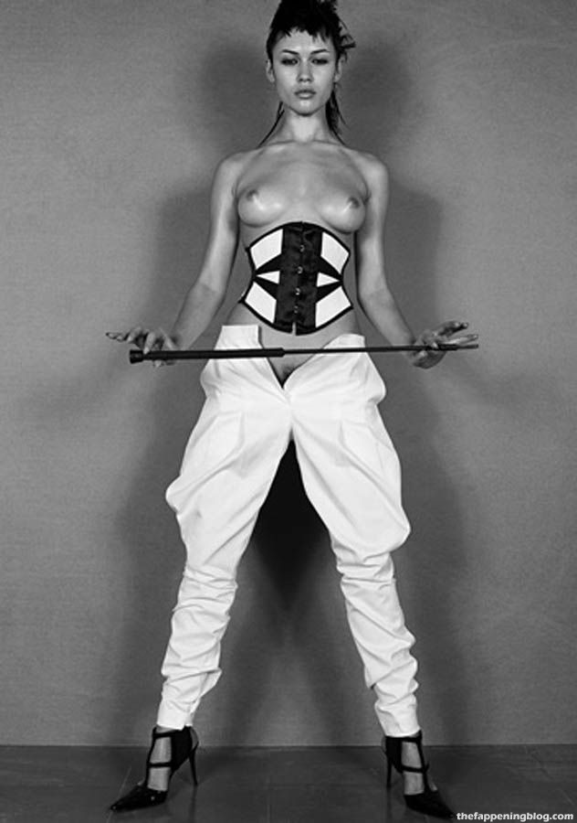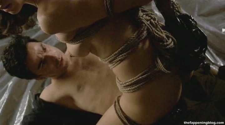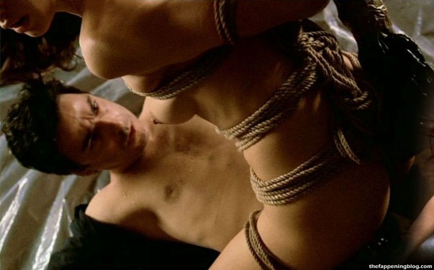 Olga Kurylenko naked and tied up with some rope, her bare breasts visible as she poses for some photographs in a bunch of different positions with a guy who is drugged into posing with her.