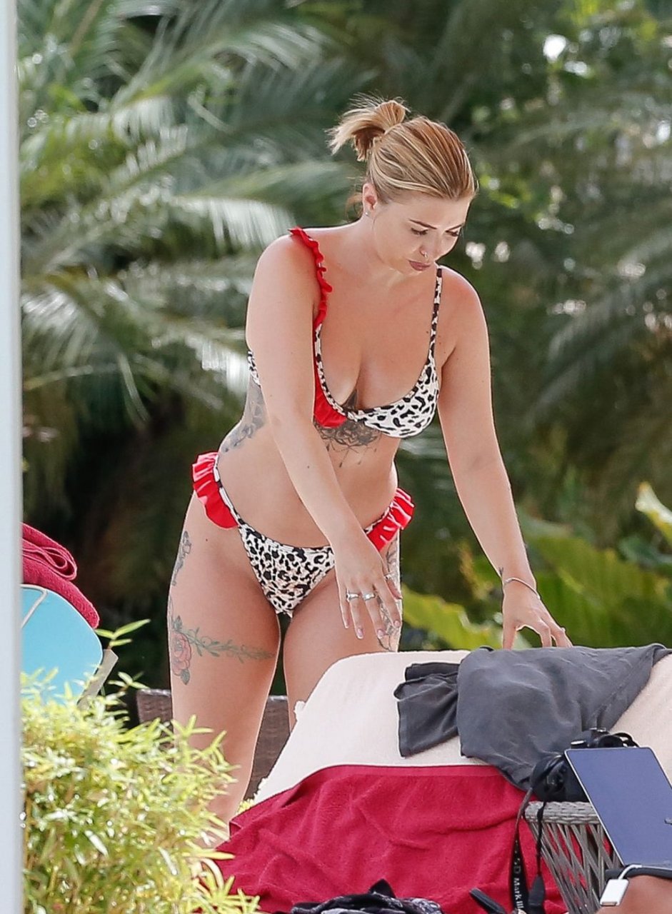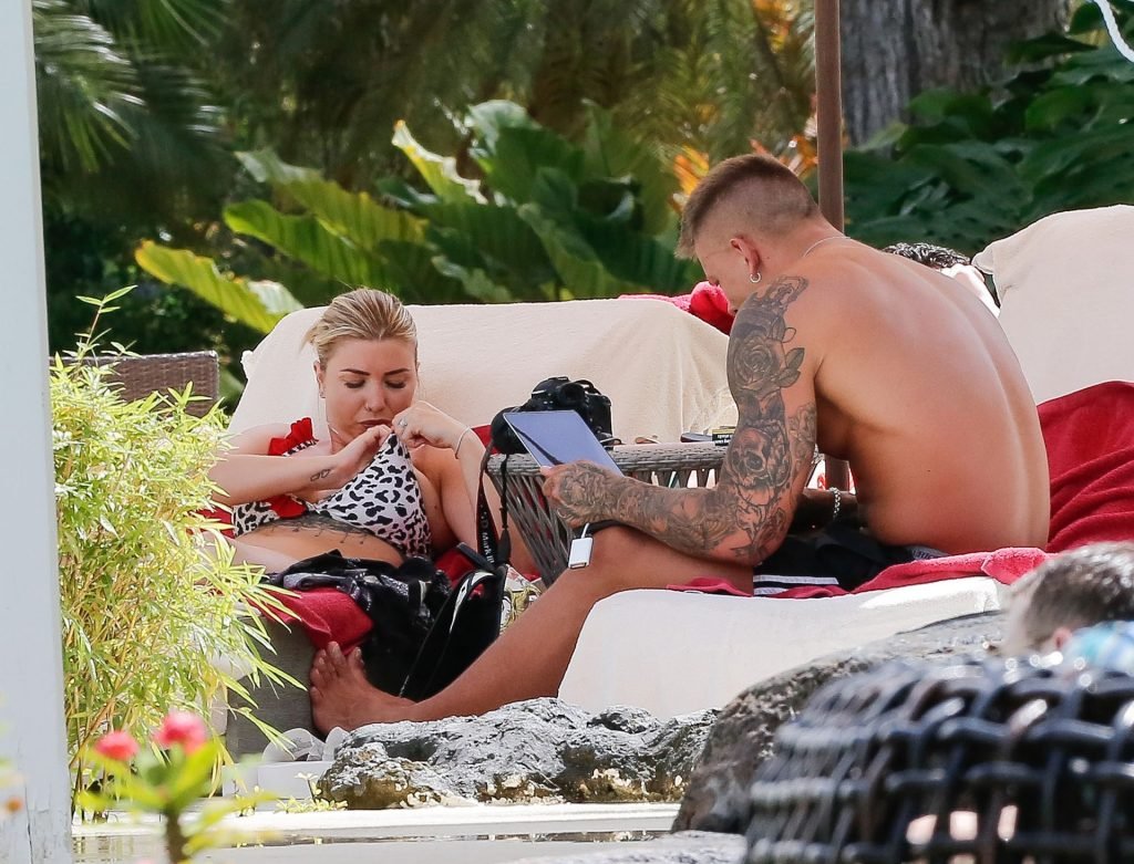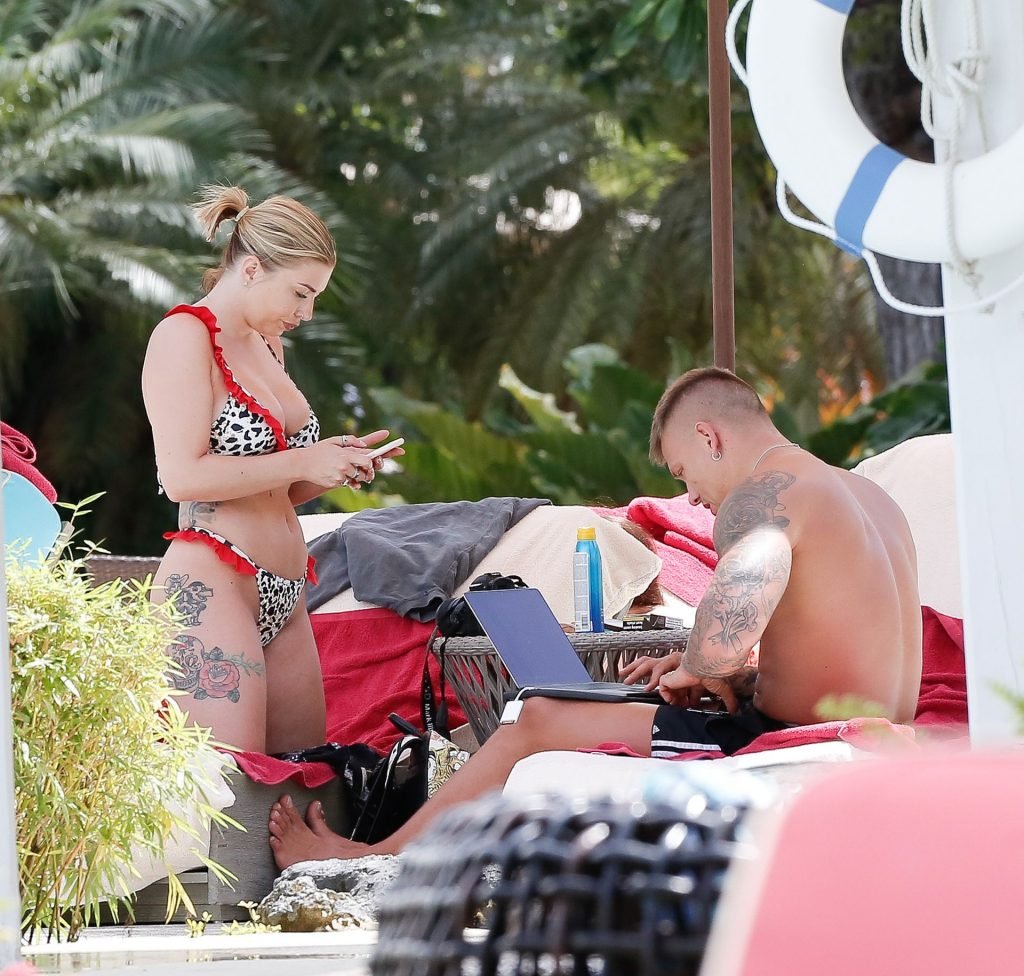 Reality TV star Olivia Buckland è stata avvistata con un bikini rosso e bianco minuscolo durante una vacanza a Barbados con suo marito, Alex Bowen, 25/03/2019.