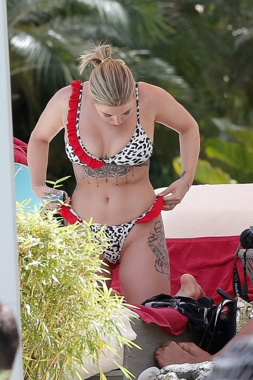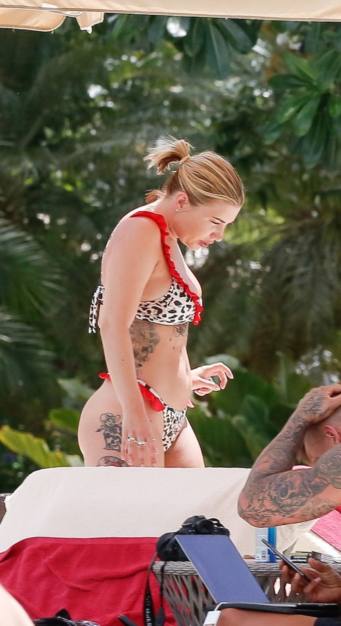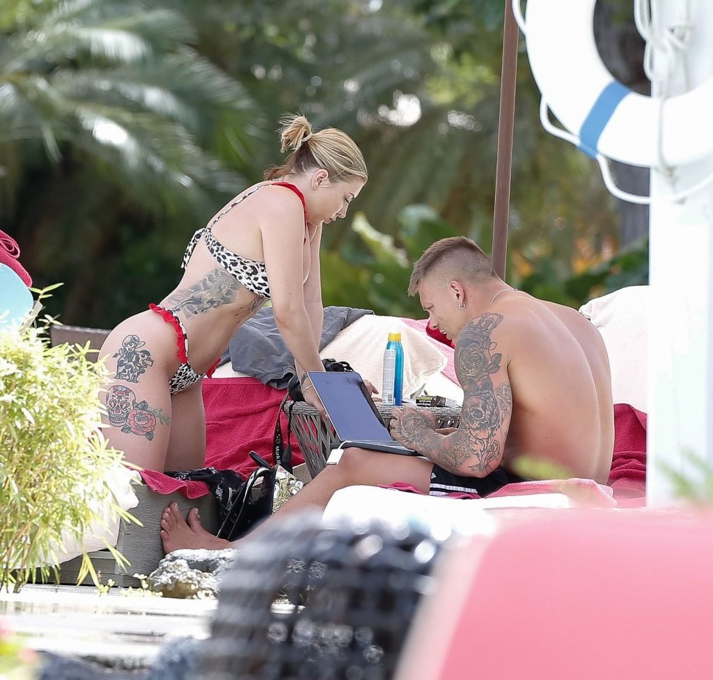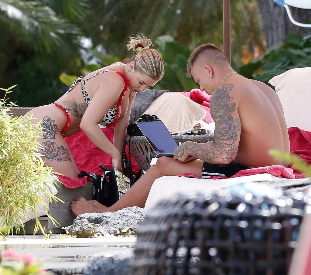 Reality TV star Olivia Buckland è stata avvistata con un bikini rosso e bianco minuscolo durante una vacanza a Barbados con suo marito, Alex Bowen, 25/03/2019.