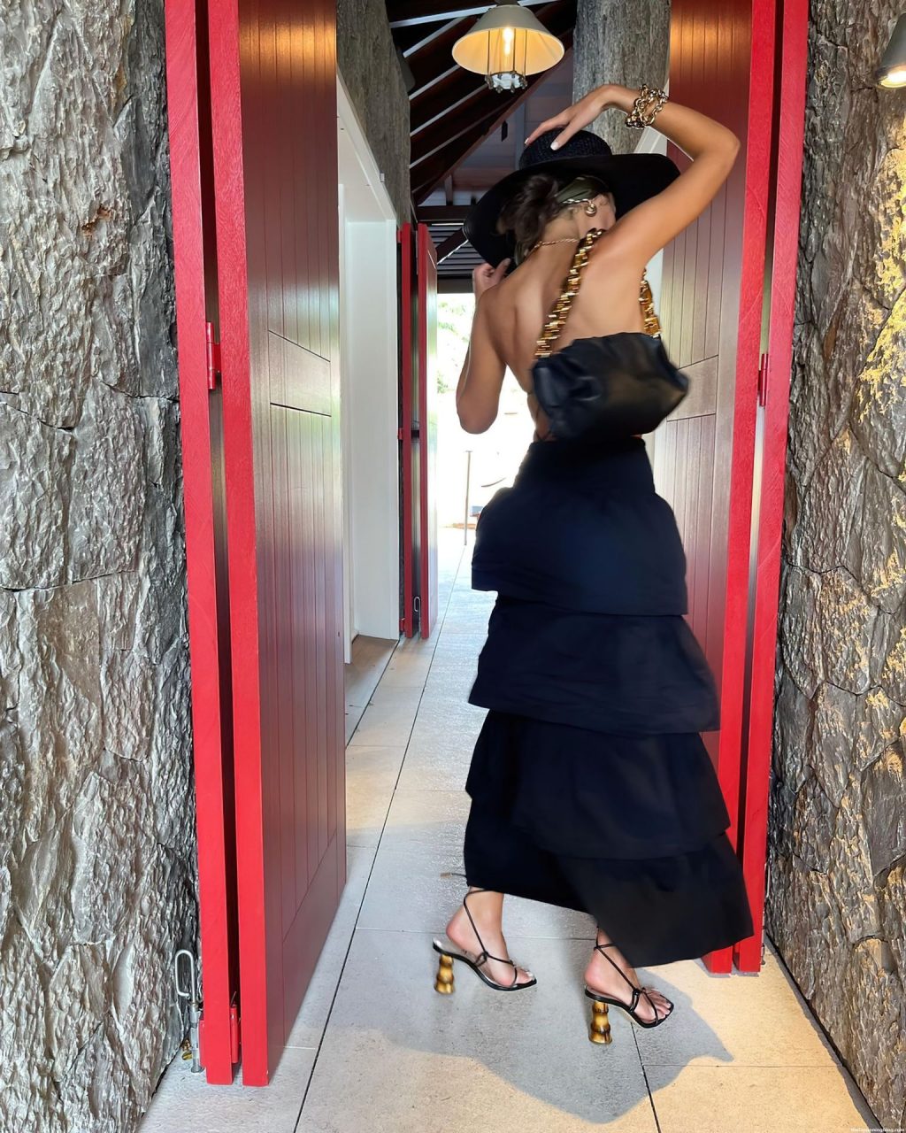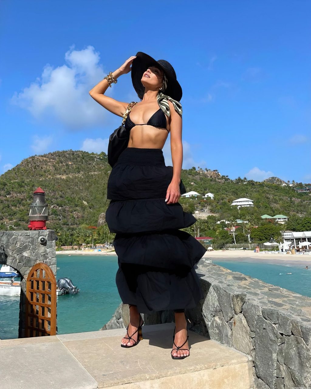Model Olivia Culpo sembra carina indossando un piccolo top bikini nero, cappello e gonna in un nuovo photoshoot sui social media, 26/06/2021.