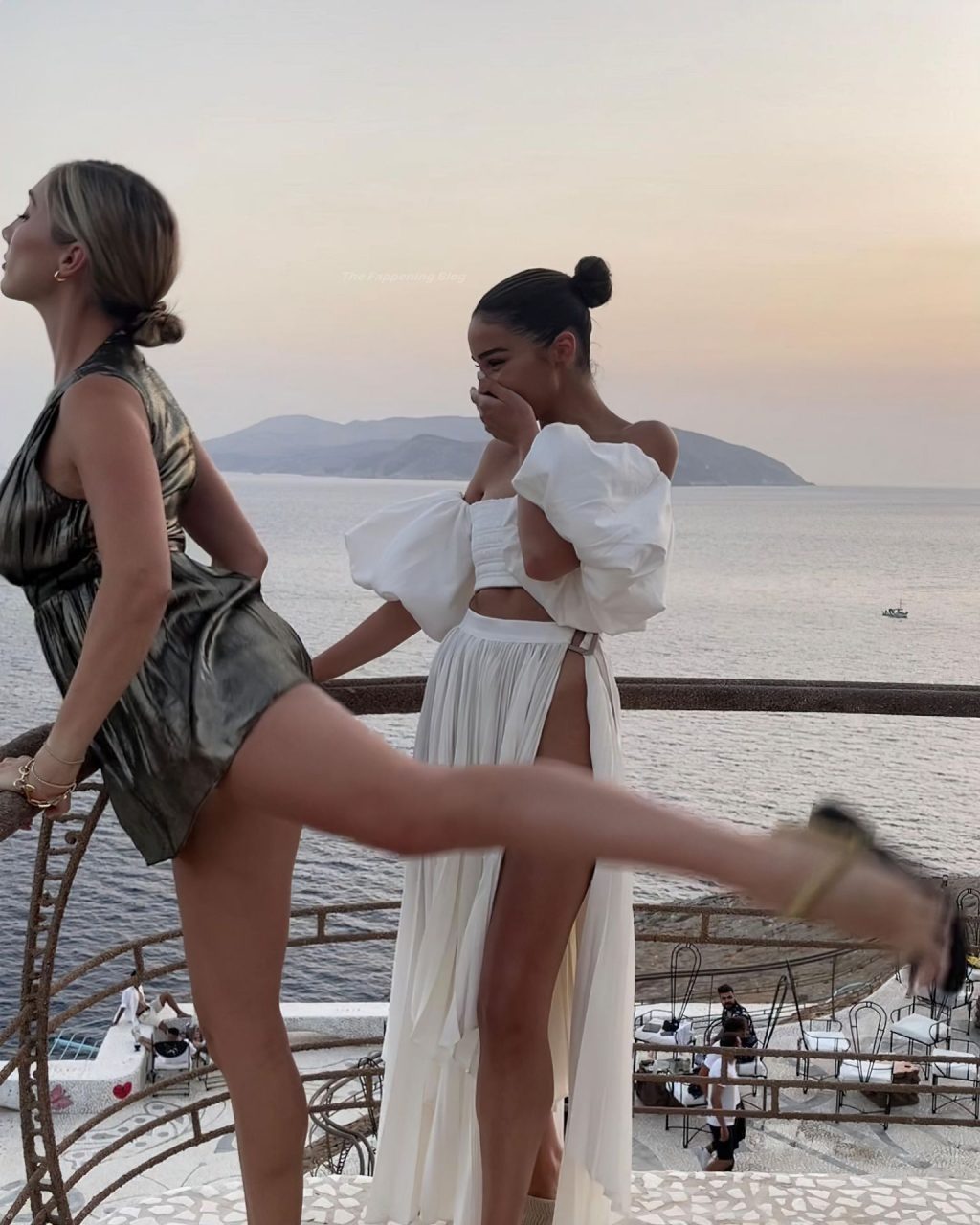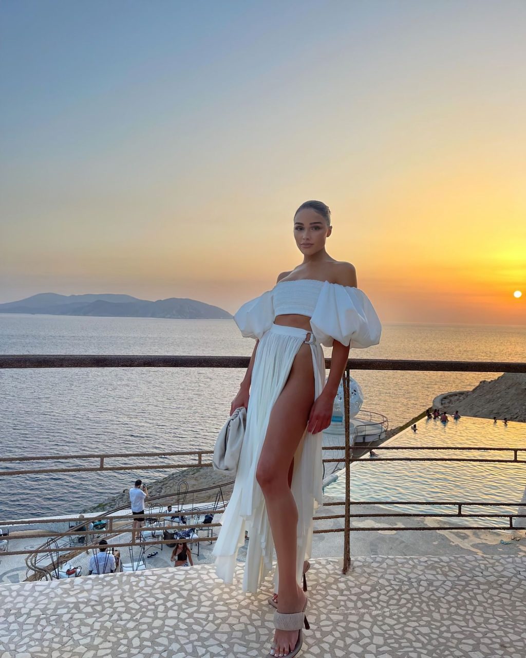 La modella Olivia Culpo mostra le sue gambe incredibili e una figura sensuale indossando un vestito bianco rivelatore in un audace servizio fotografico senza mutandine sui social media con le sue amiche, 08/07/2021.