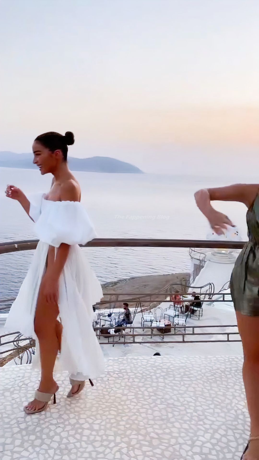 La modella Olivia Culpo mostra le sue gambe incredibili e una figura sensuale indossando un vestito bianco rivelatore in un audace servizio fotografico senza mutandine sui social media con le sue amiche, 08/07/2021.