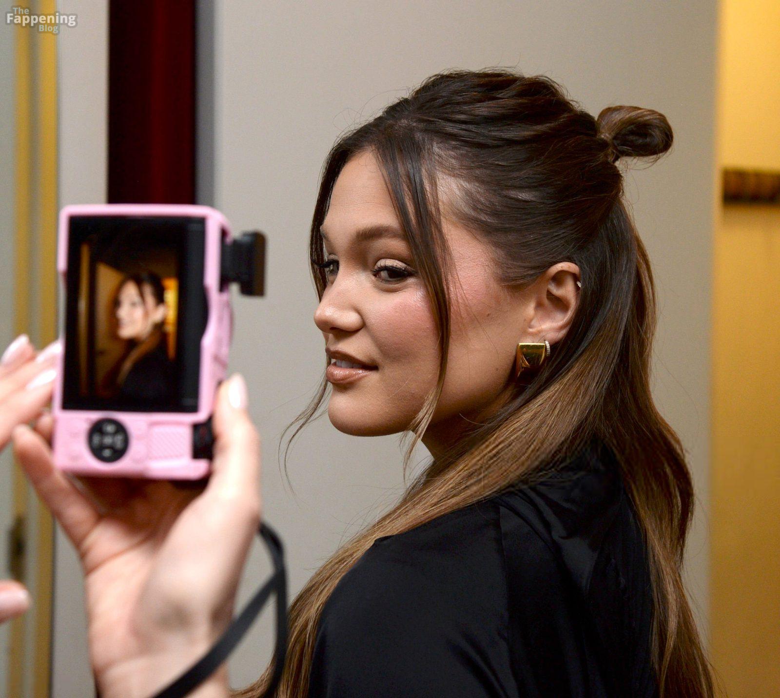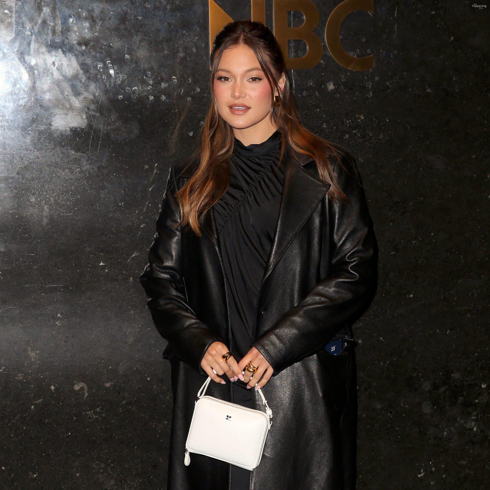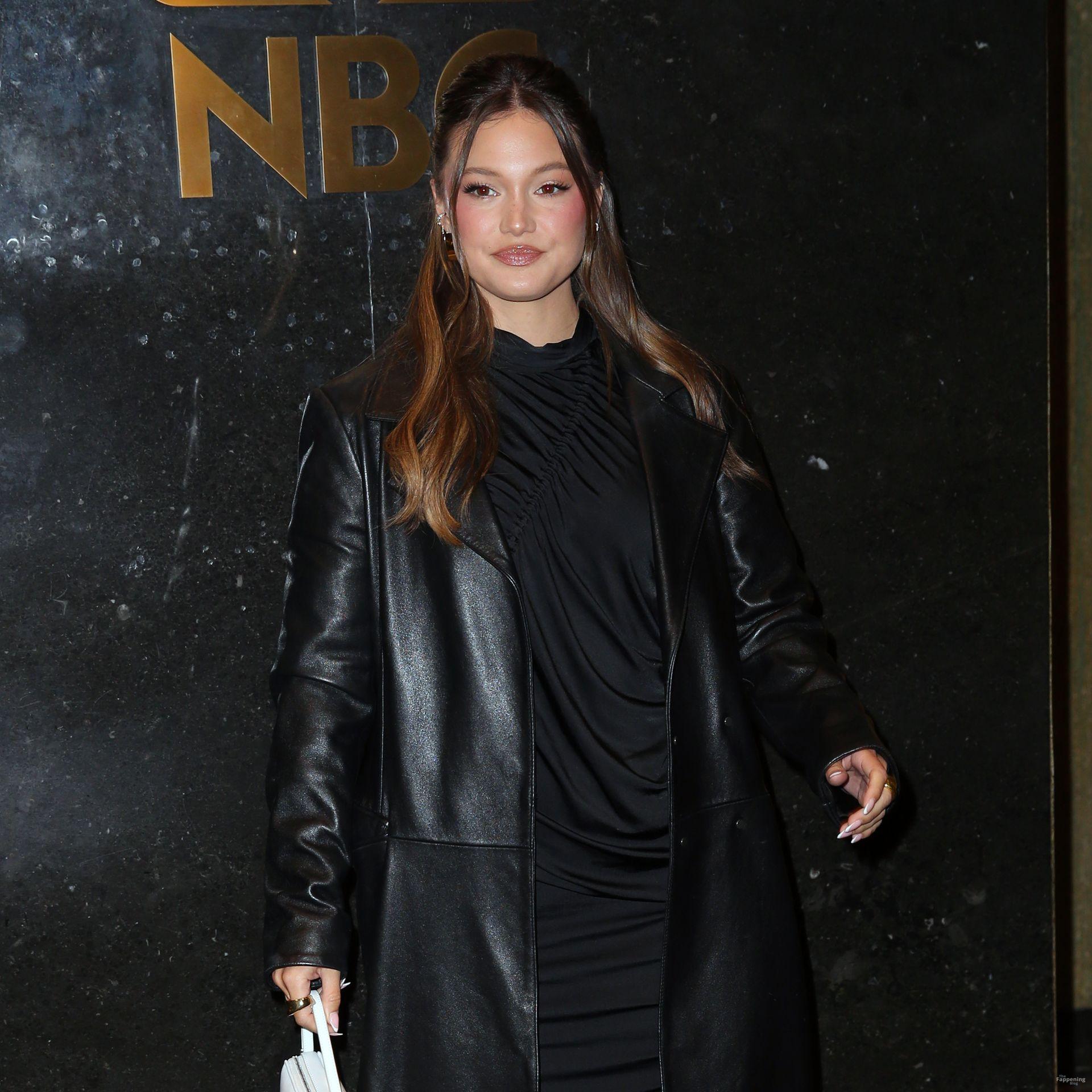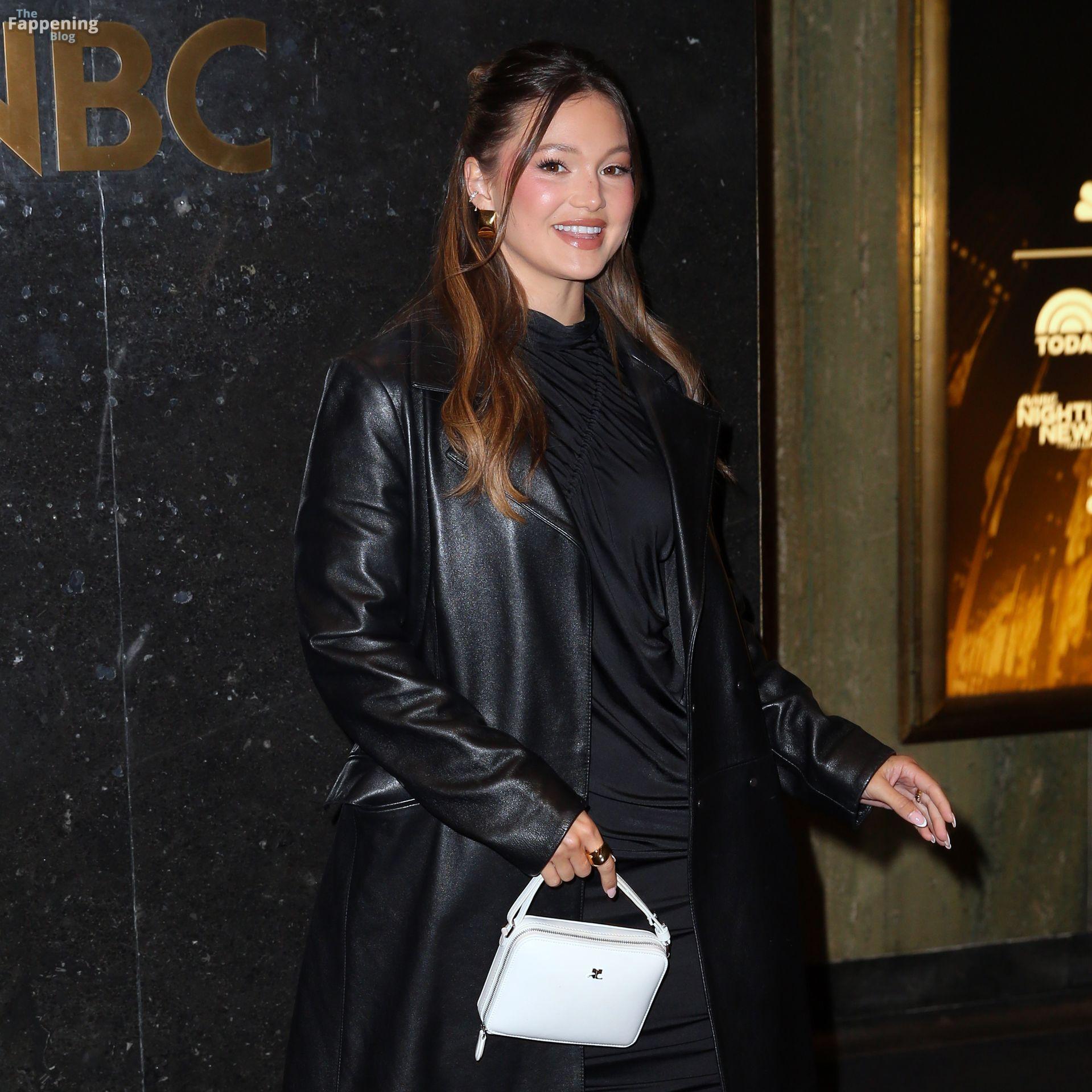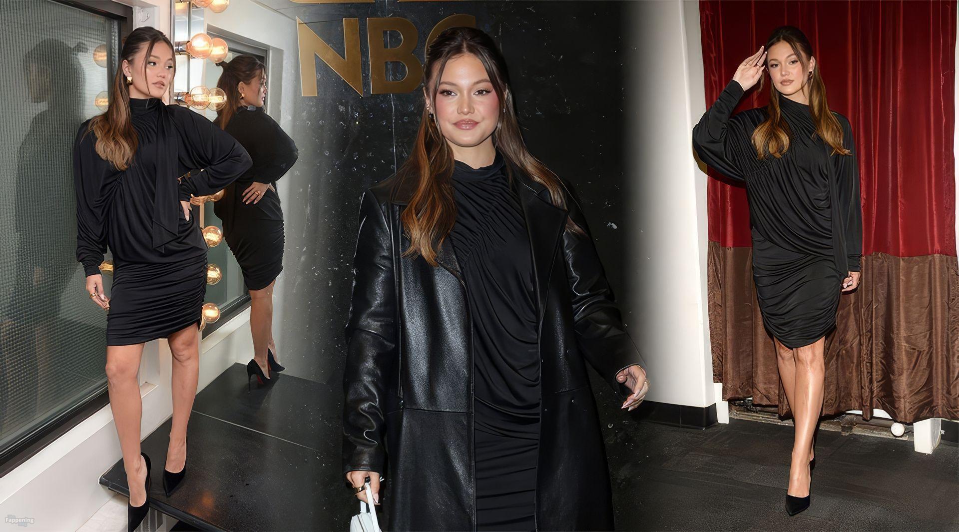 Olivia Holt mostra le sue gambe con un soprabito in pelle nera e un vestito nero mentre arriva a New York Live.