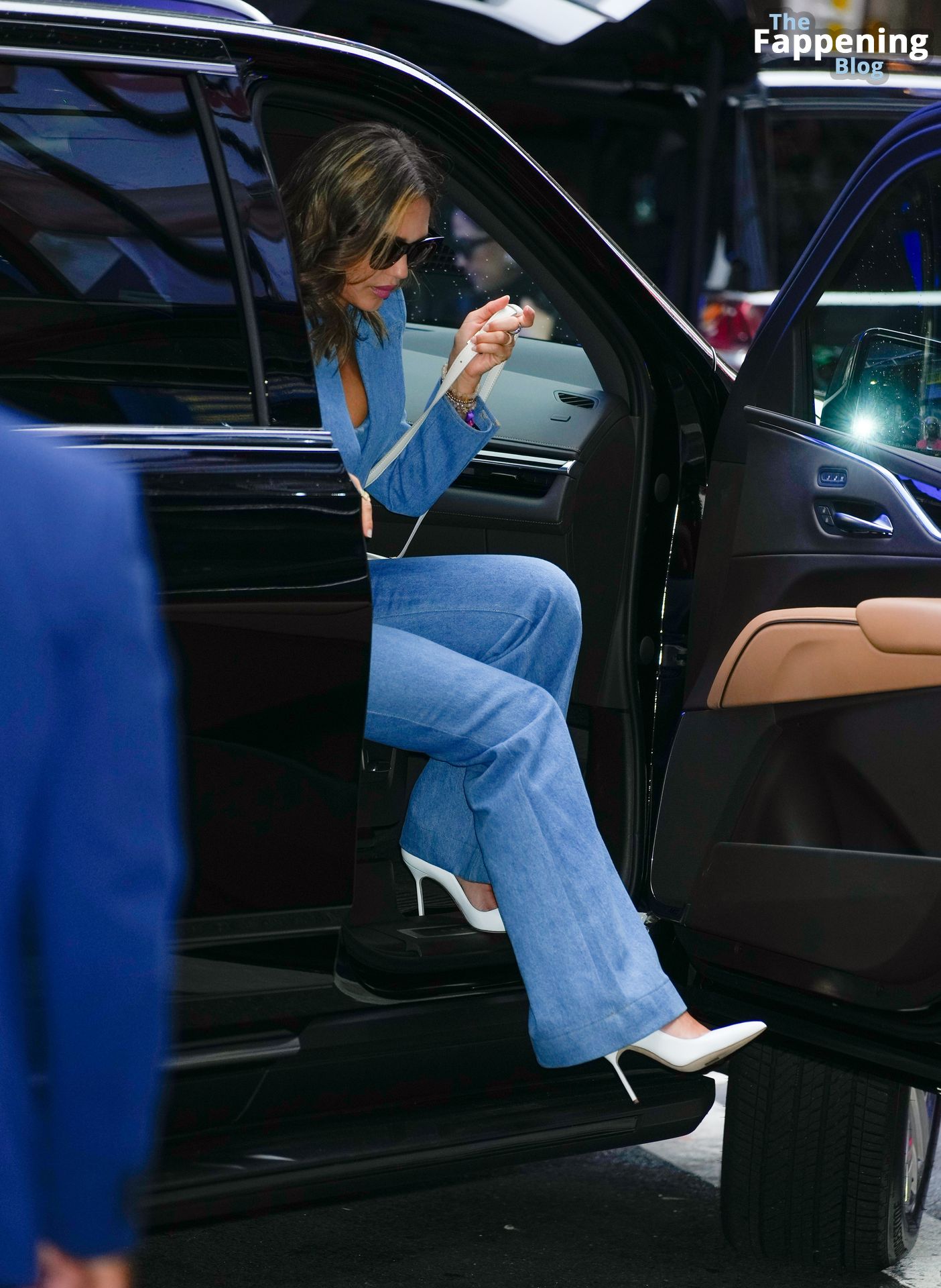 Jessica Alba fa un arrivo alla moda agli studi di Good Morning America a New York City, 17/08/2023. L’attrice americana indossava un blazer blu, un corsetto di denim, pantaloni abbinati e tacchi.