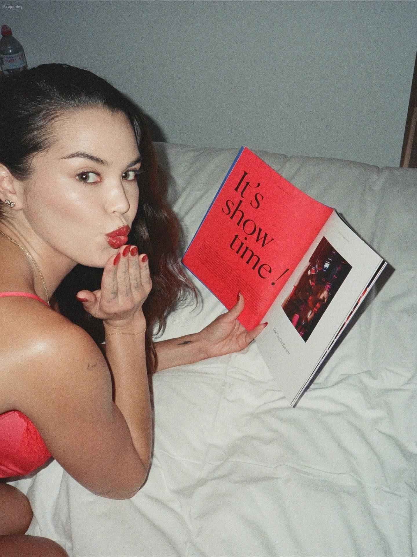 La modella e attrice Paris Berelc posa con un completo di lingerie rossa, mettendo in mostra la sua figura sexy in questo servizio fotografico in camera da letto.