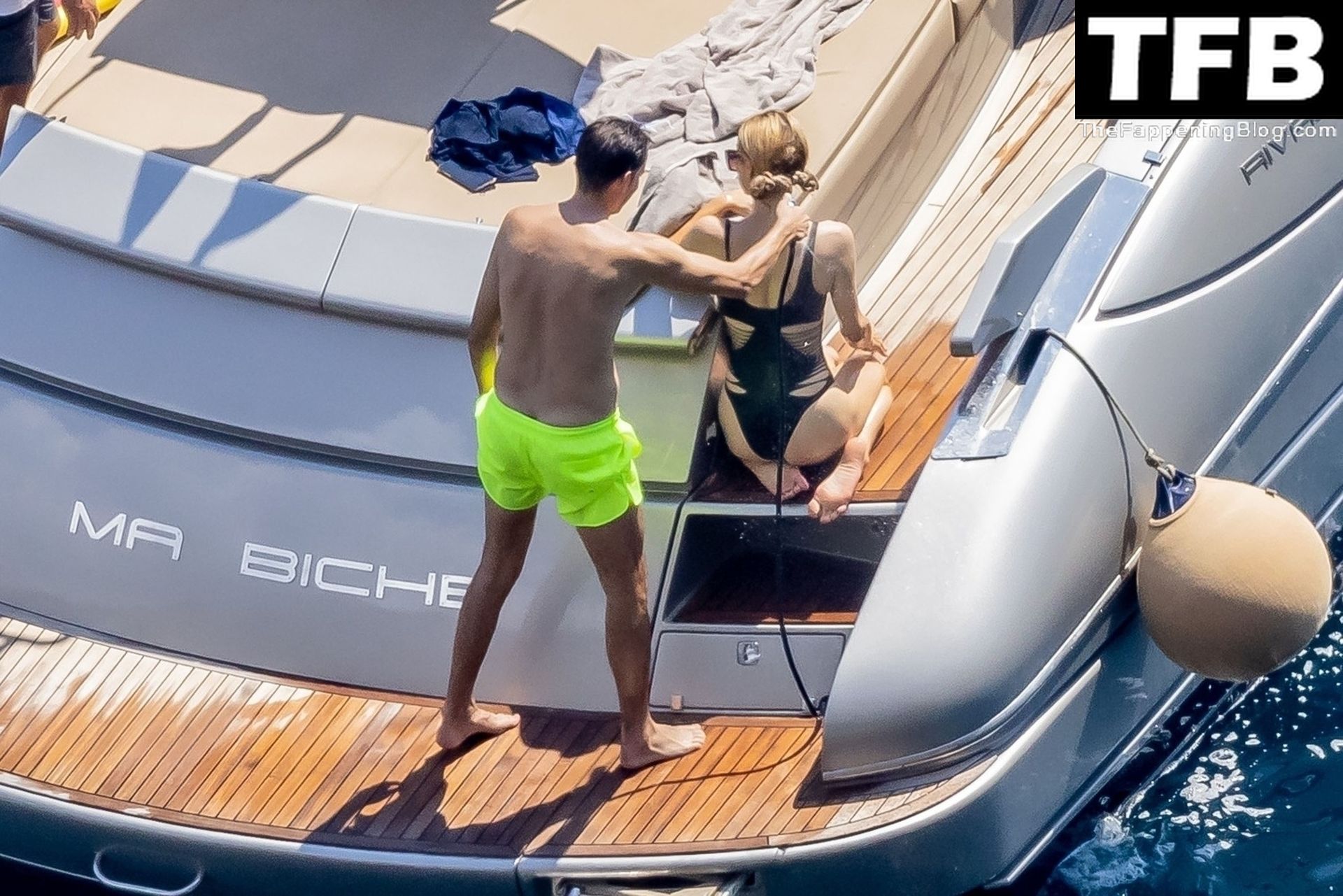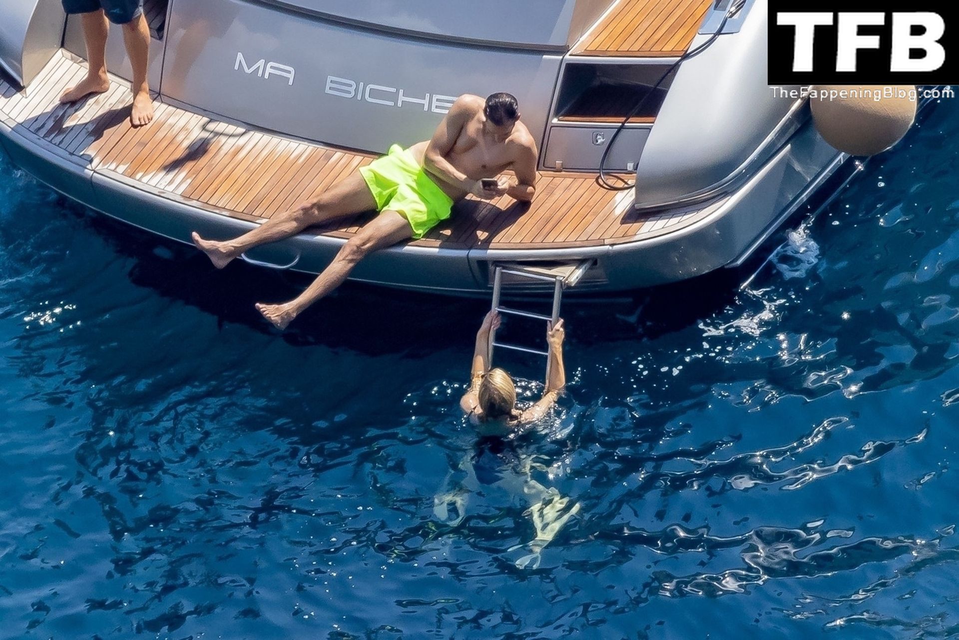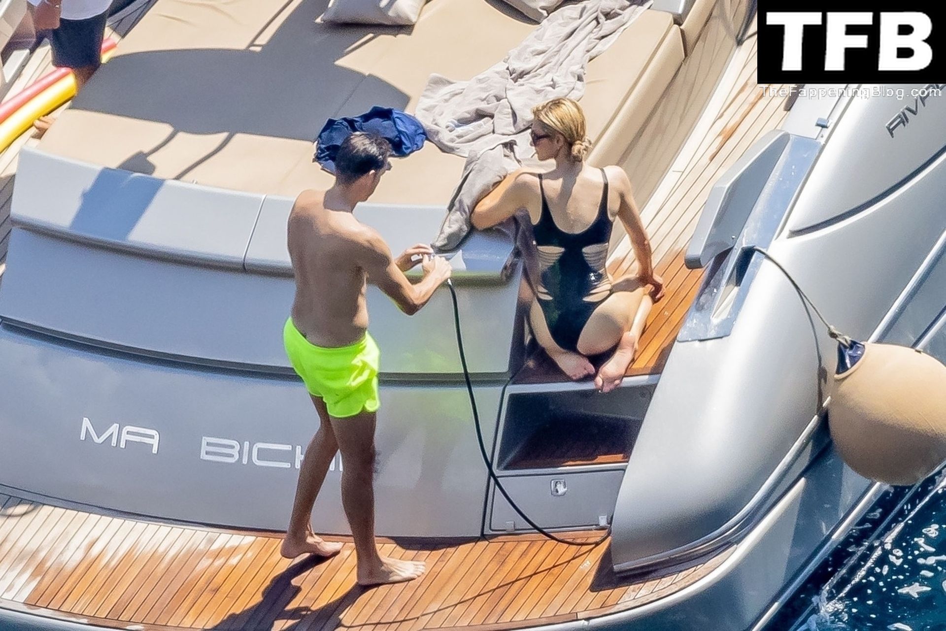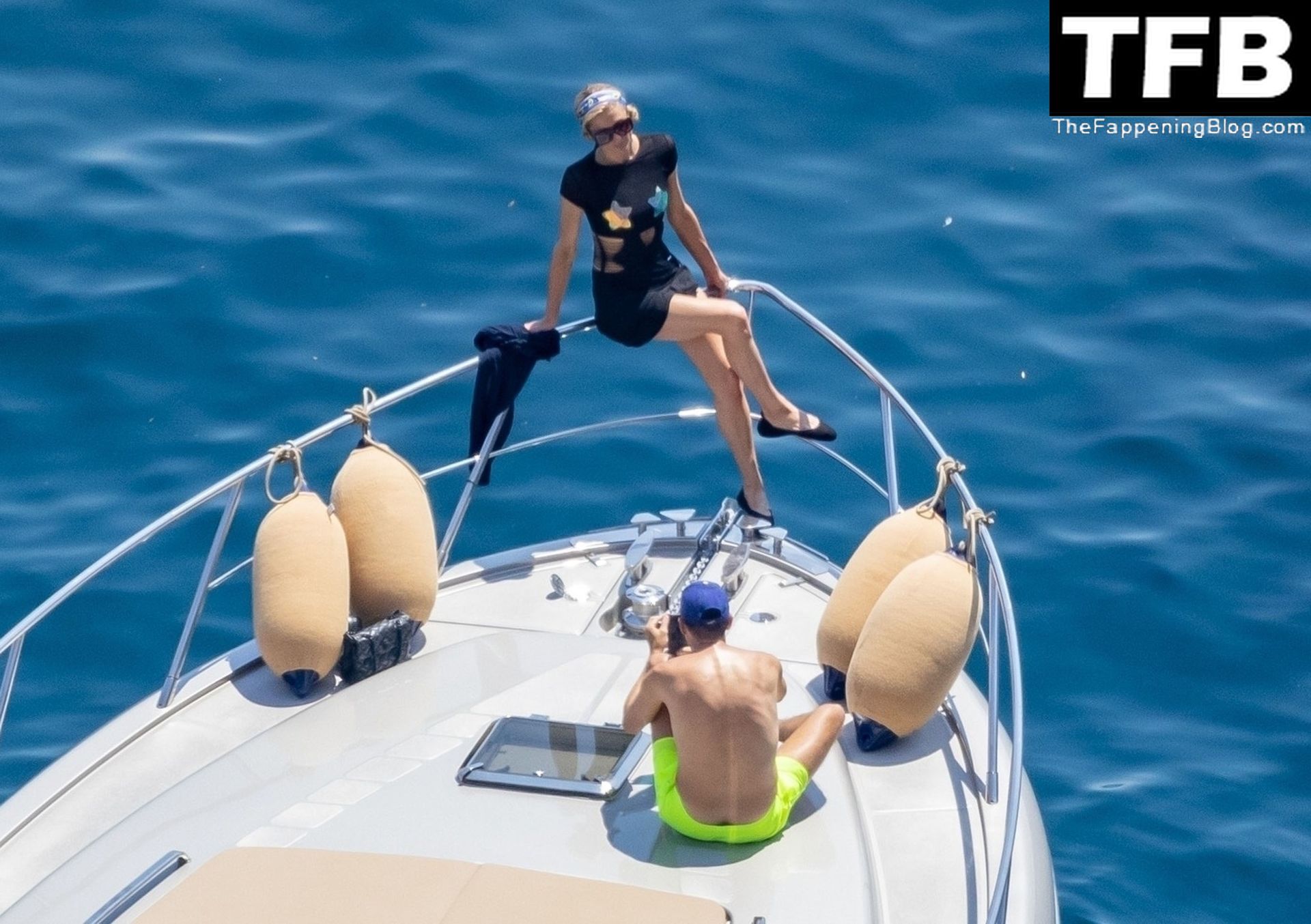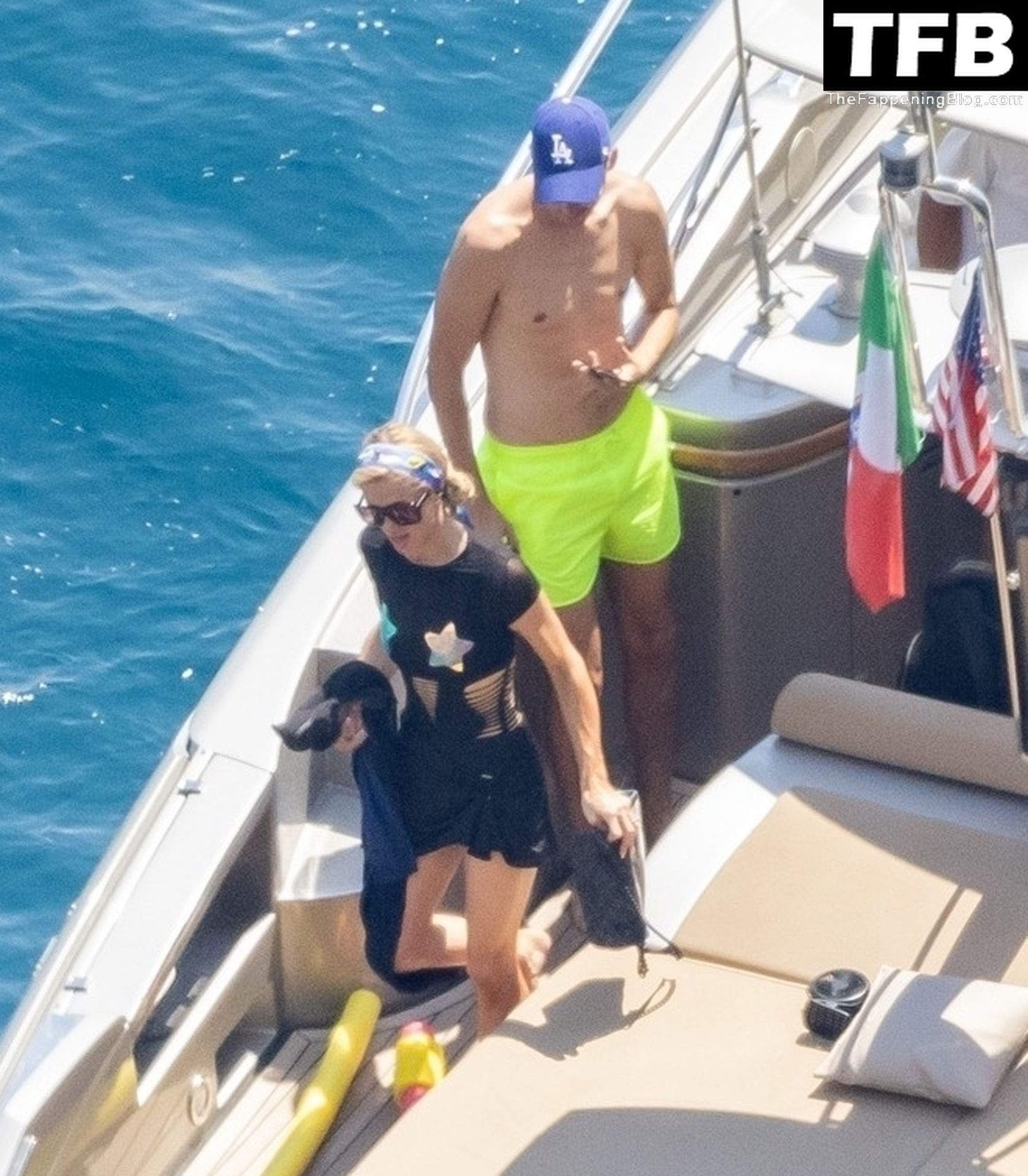 La coppia ha goduto del caldo italiano sulla loro barca mentre Carter, con i suoi pantaloncini verde lime, cercava di impressionare Paris con un salto da temerario dalla barca.